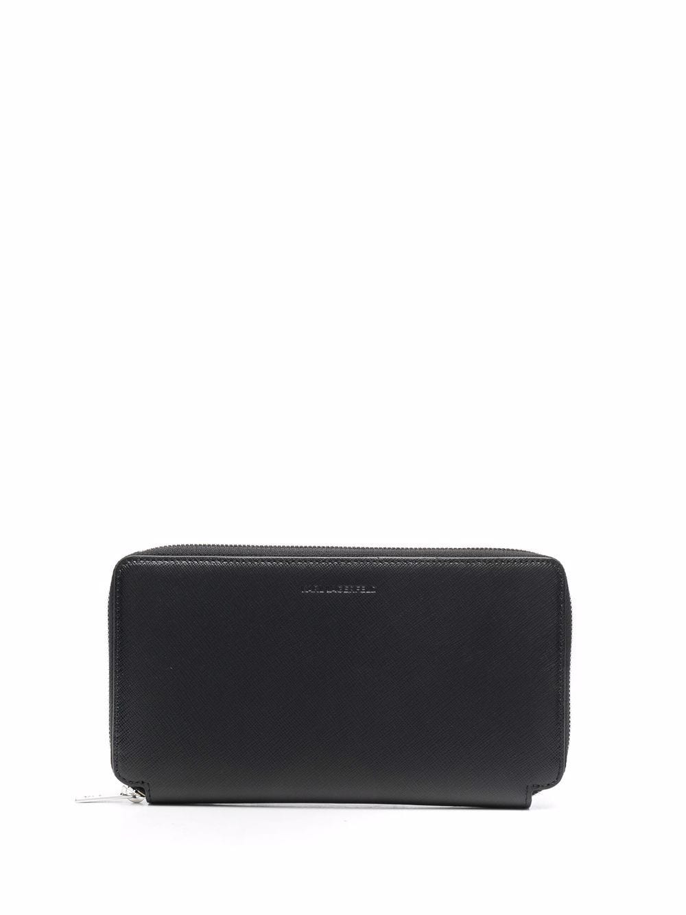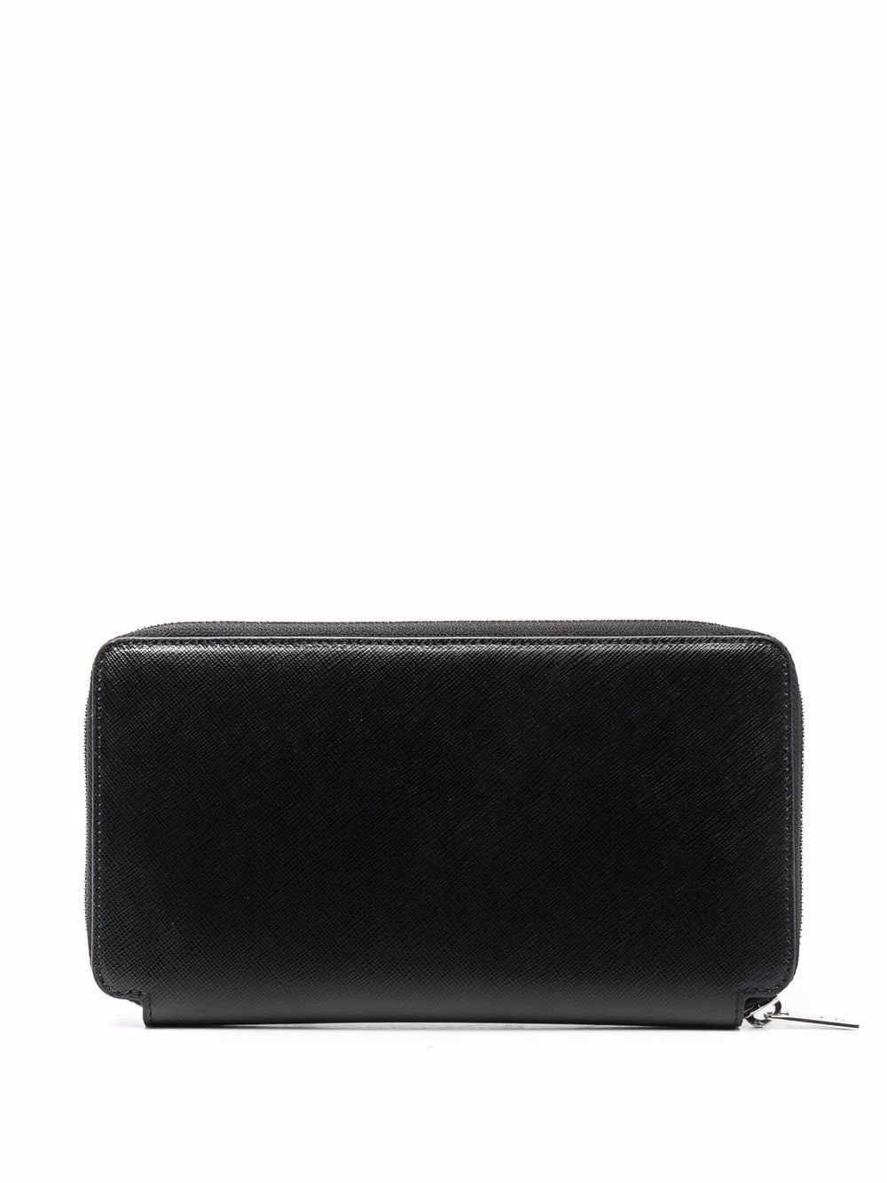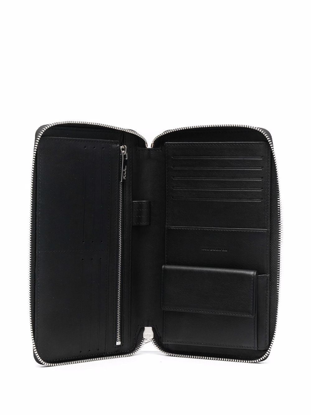 black leather embossed logo to the front all-around zip fastening internal card slots internal zip-fastening pocket