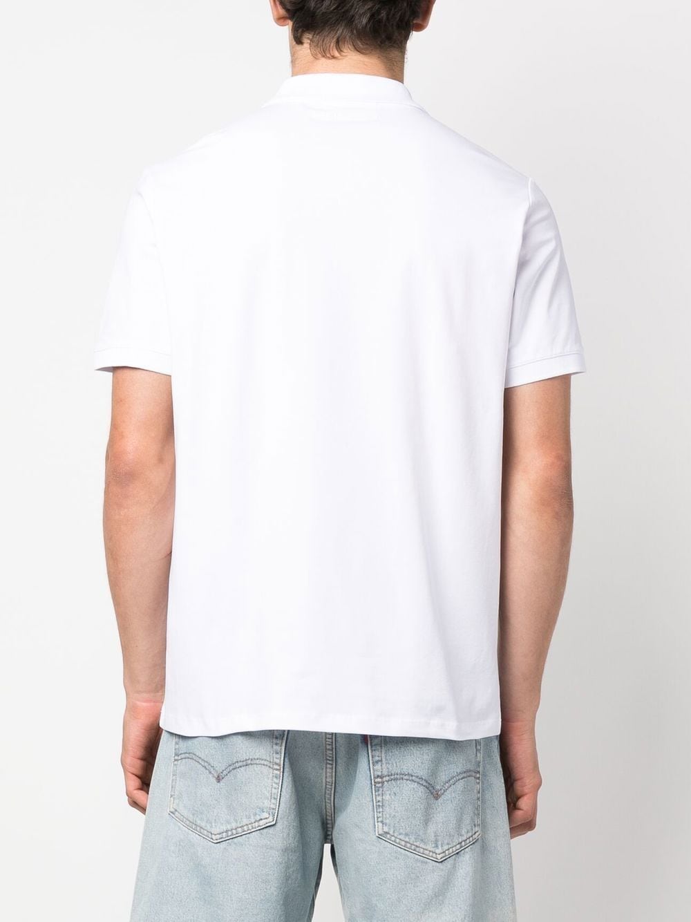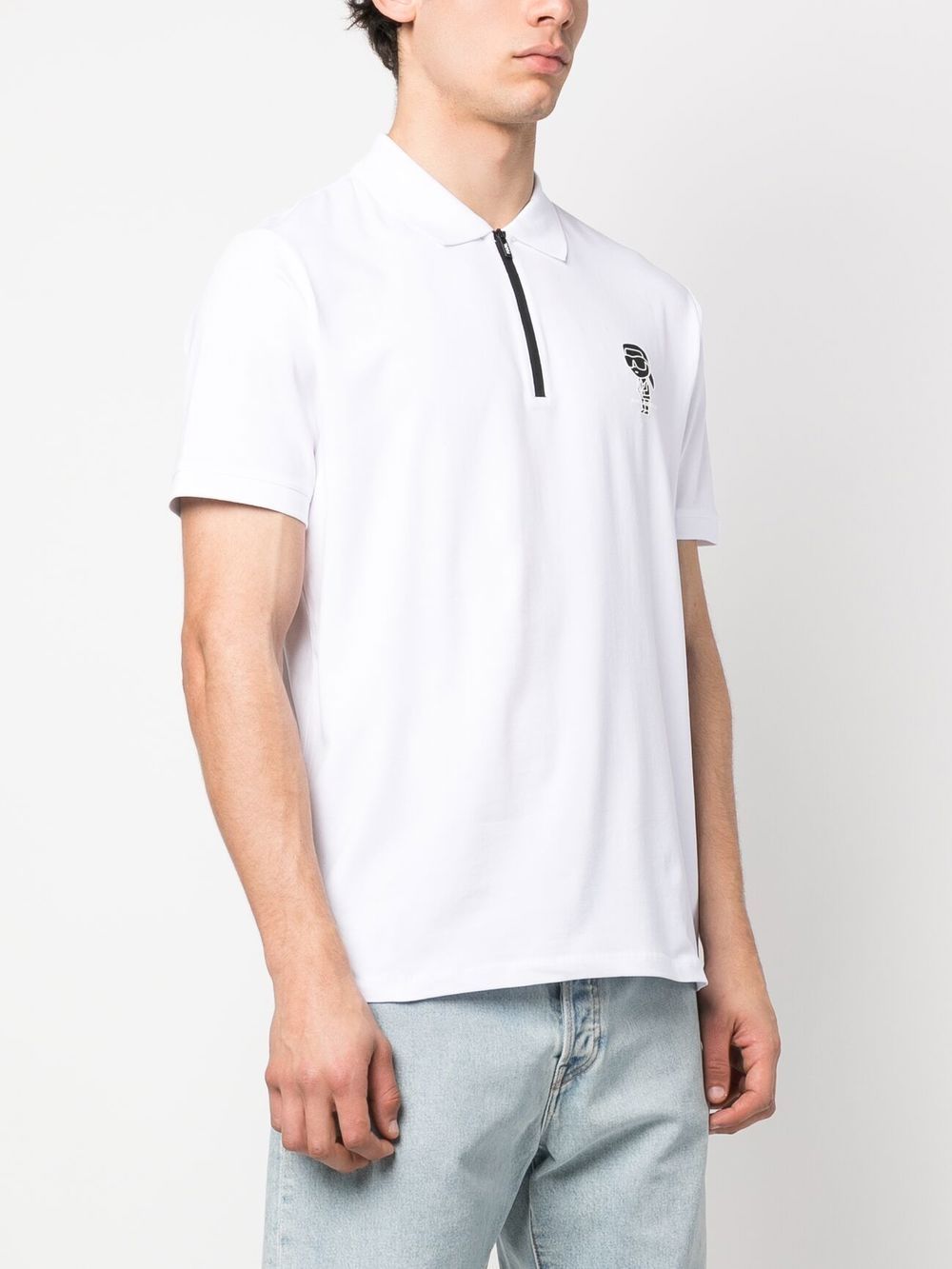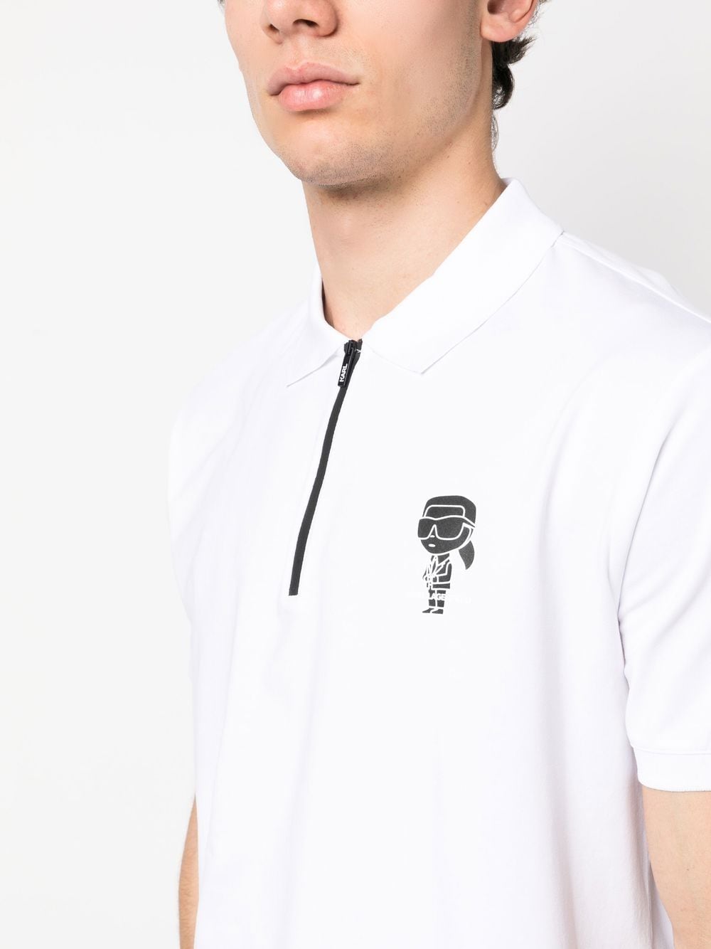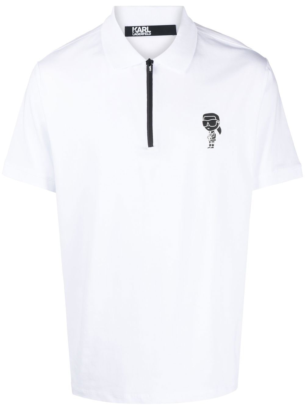 white stretch-cotton signature Ikonik Karl motif logo print at the chest short front zip fastening polo collar short sleeves straight hem