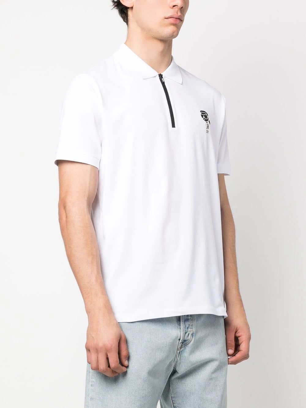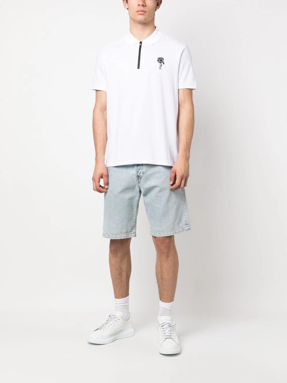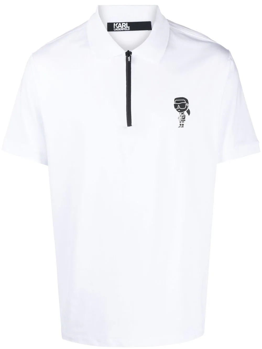 white stretch-cotton signature Ikonik Karl motif logo print at the chest short front zip fastening polo collar short sleeves straight hem