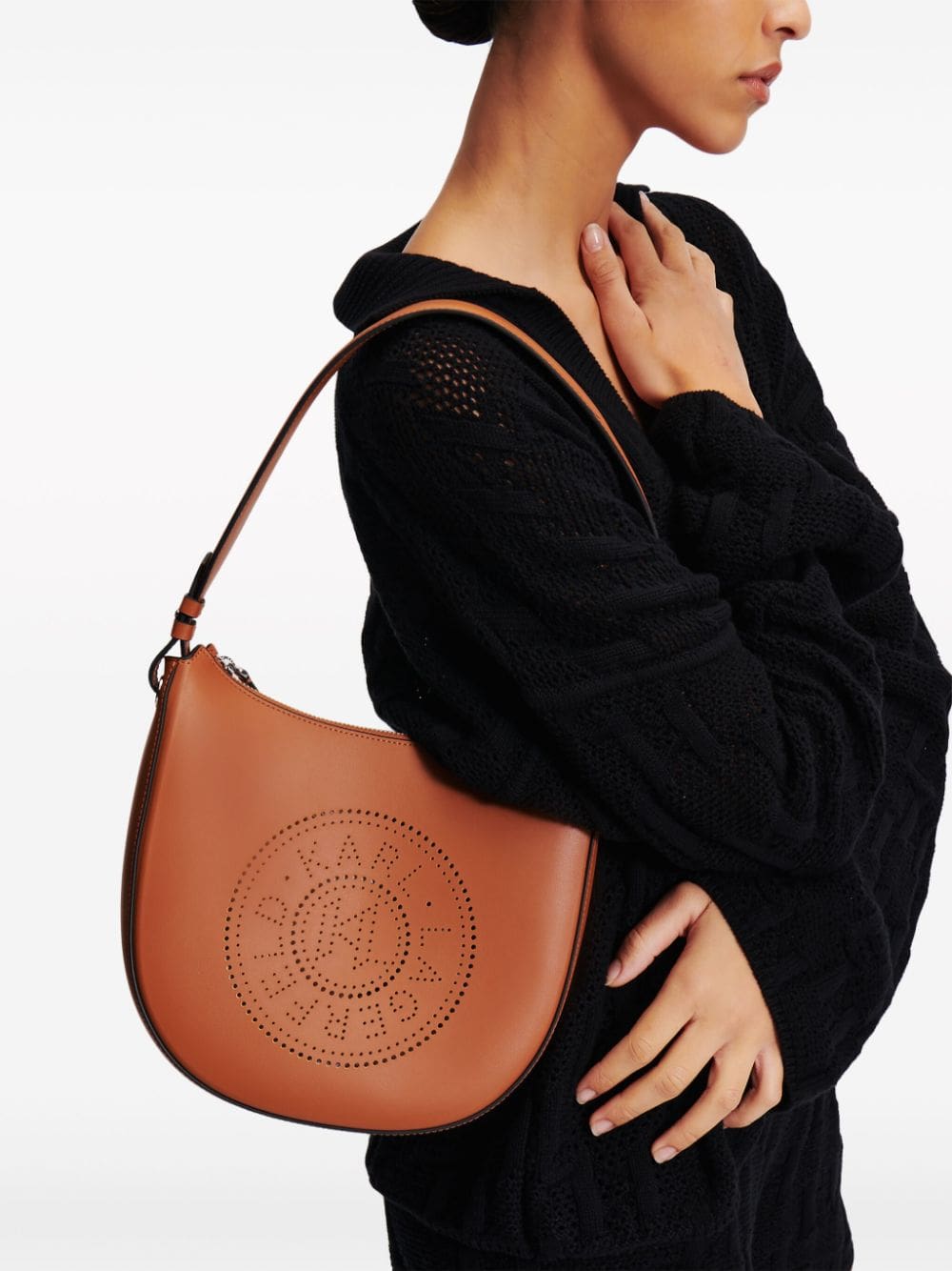Crafted from buttery-soft leather, this Karl Lagerfeld shoulder bag is perforated with logo detailing on the front.