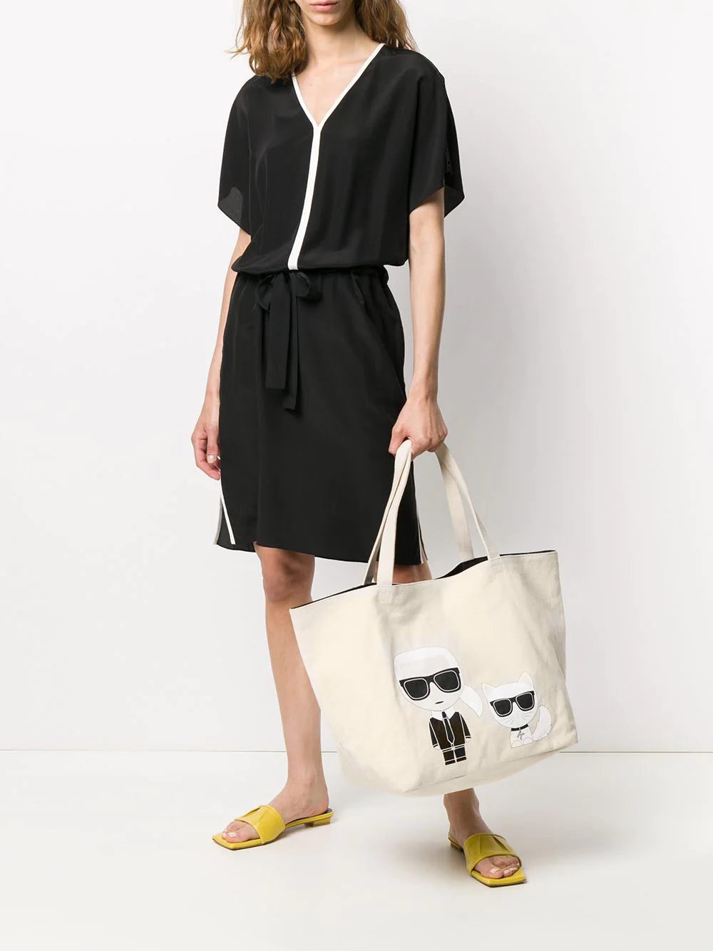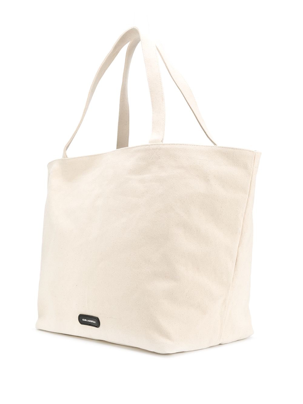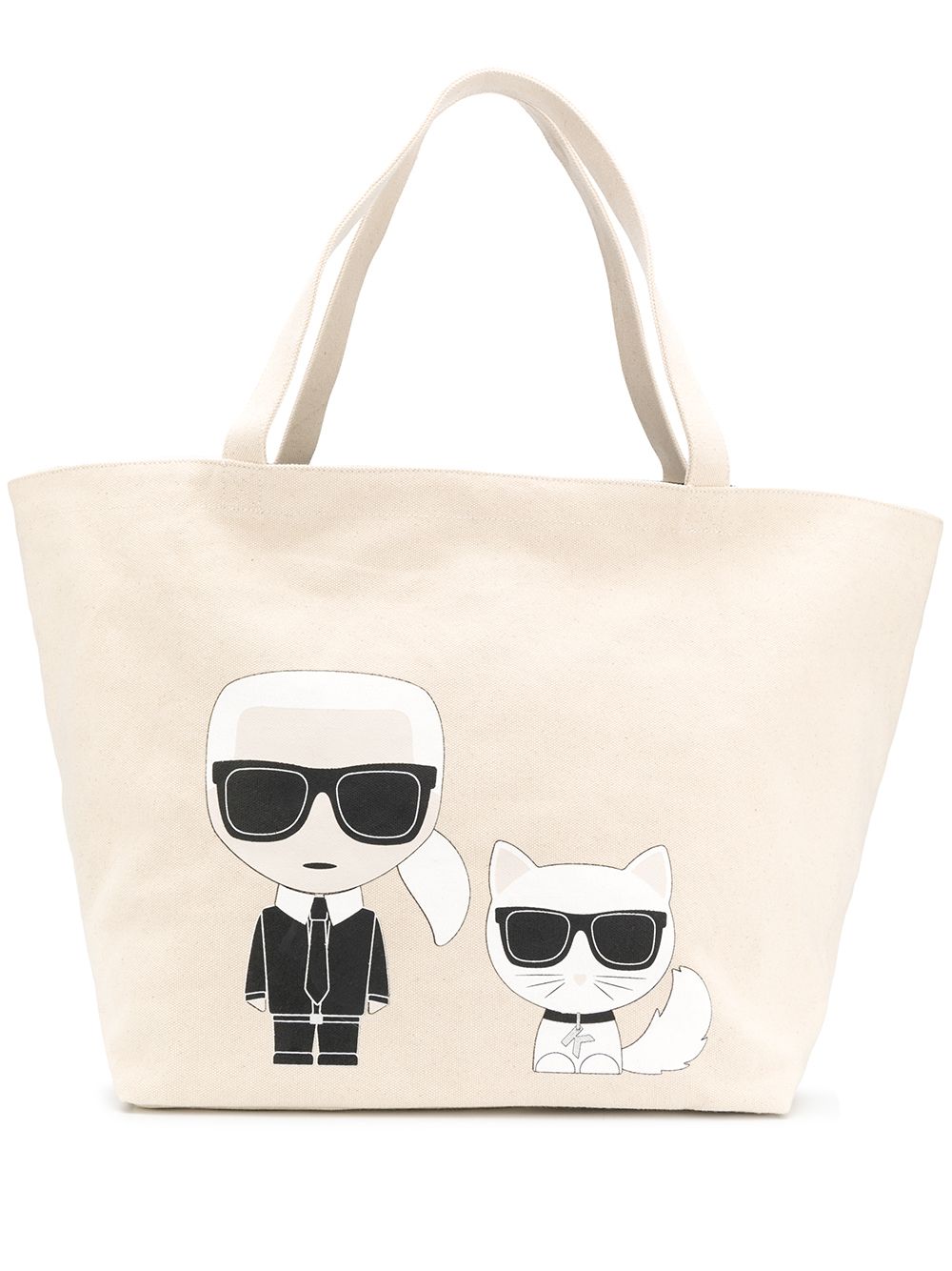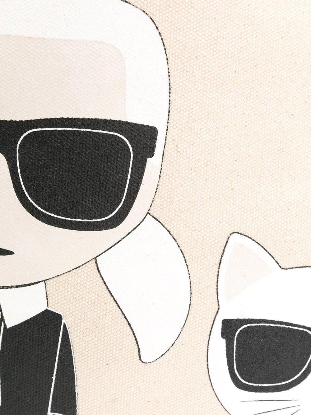 Beige, black and white cotton K/Ikonik Karl & Choupette tote from Karl Lagerfeld featuring a woven design, a graphic print, rear logo plaque, round top handles, a magnetic closure, a main internal compartment and an internal zipped pocket.