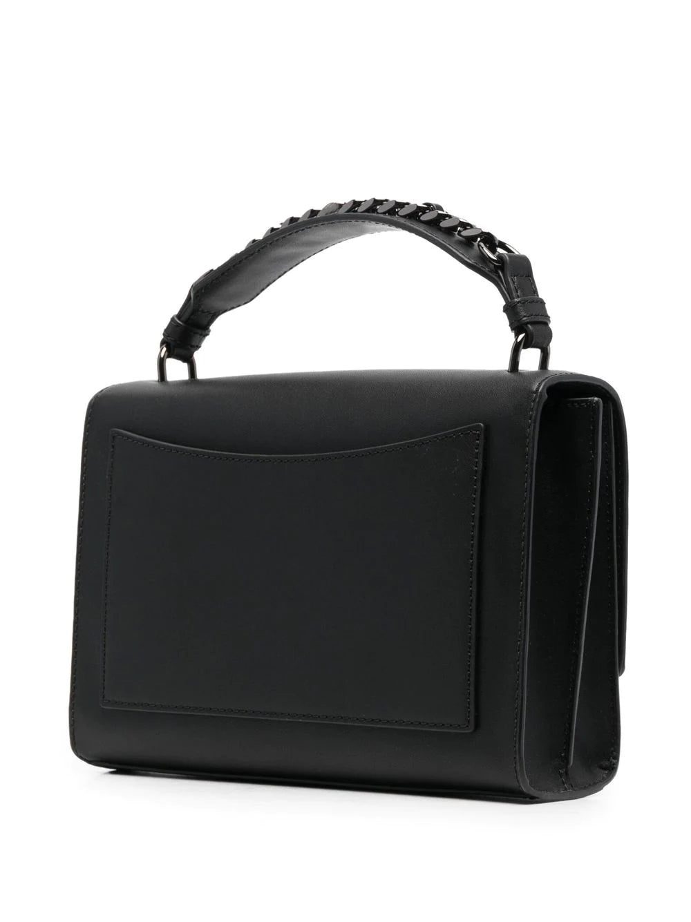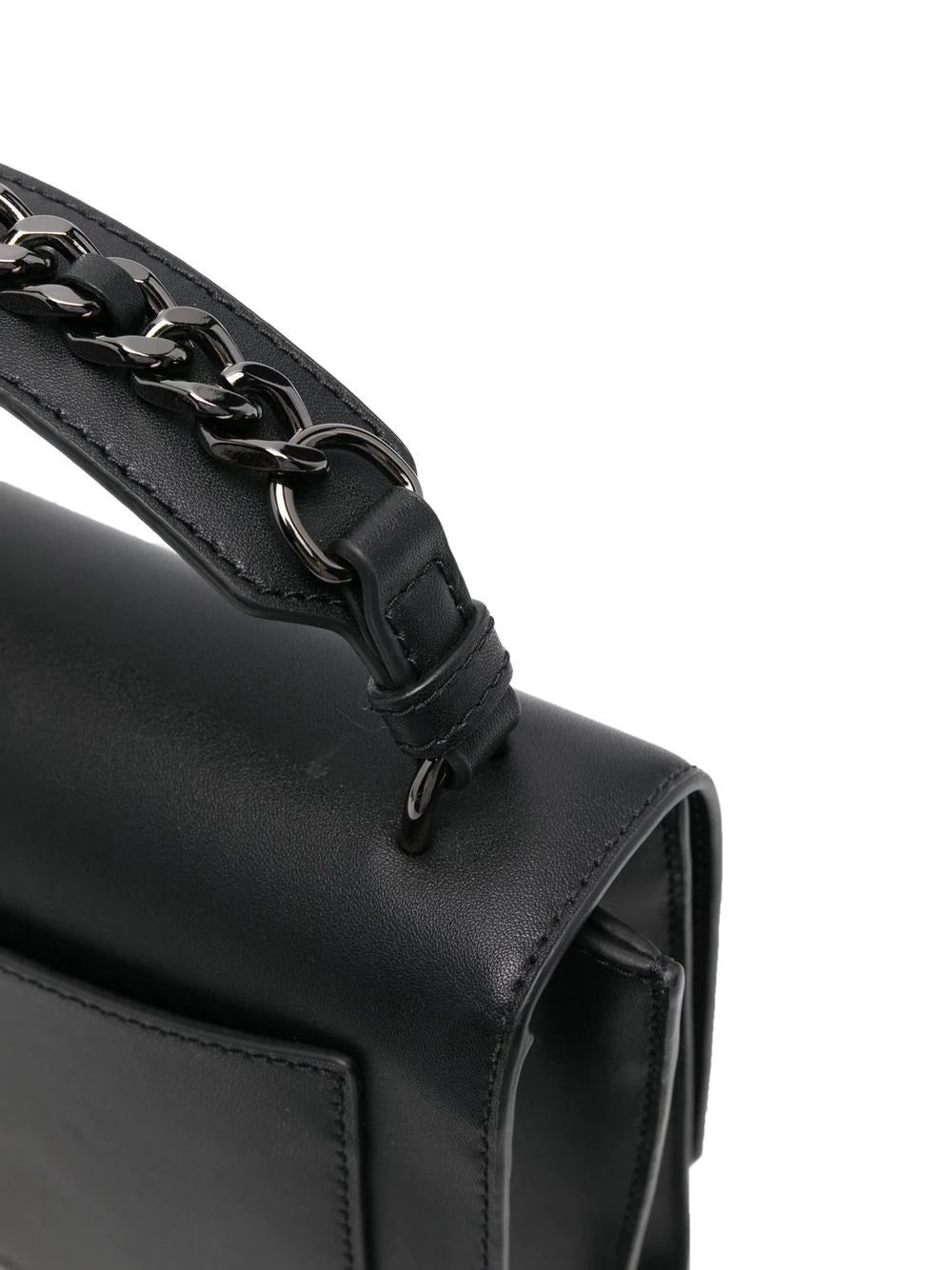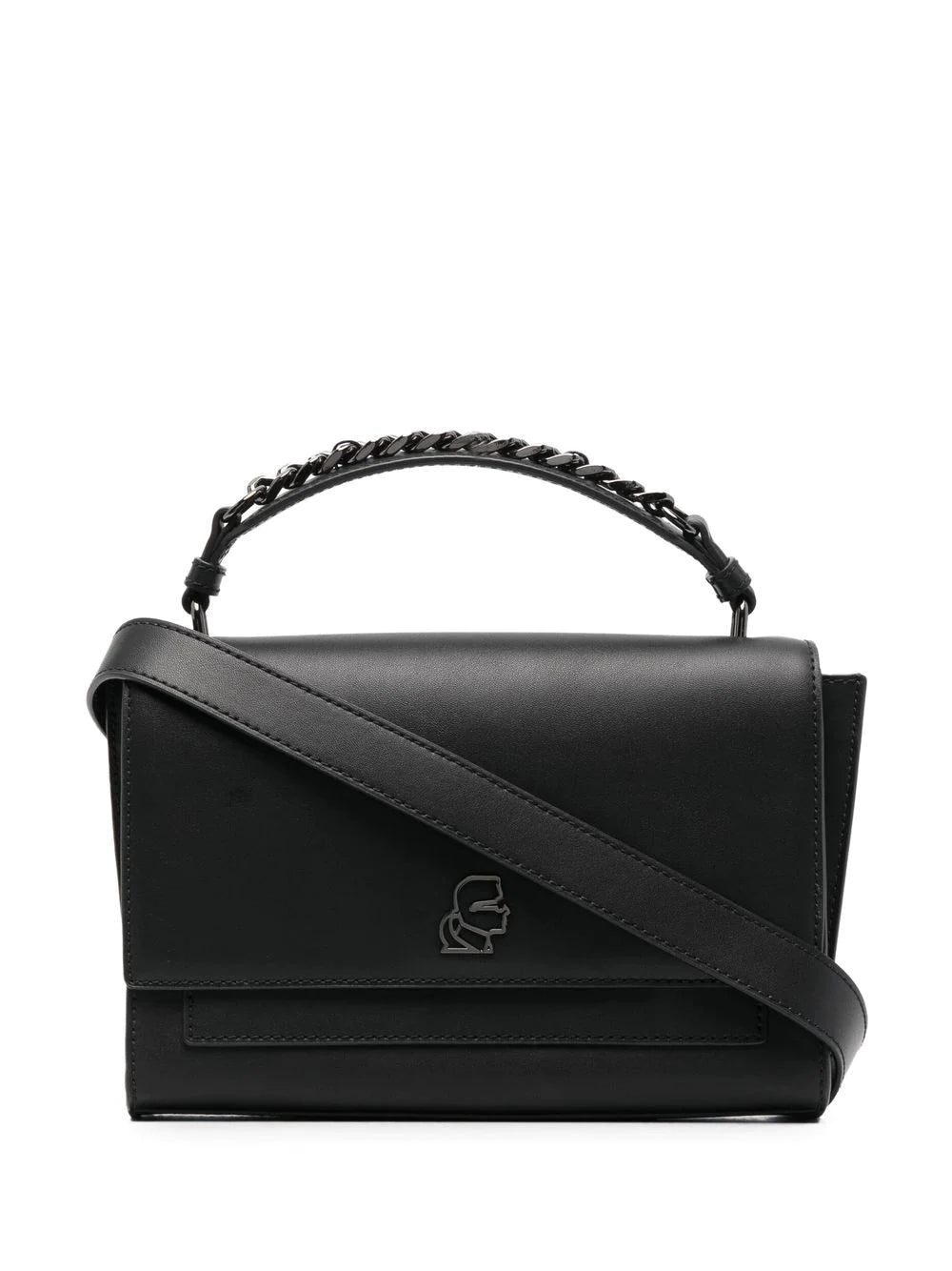K/Pura chain-detail tote from KARL LAGERFELD featuring black, calf leather, chain-link detailing, logo plaque, single flat top handle, slip pocket to the rear, foldover top with magnetic fastening, logo-print lining and internal slip pocket.