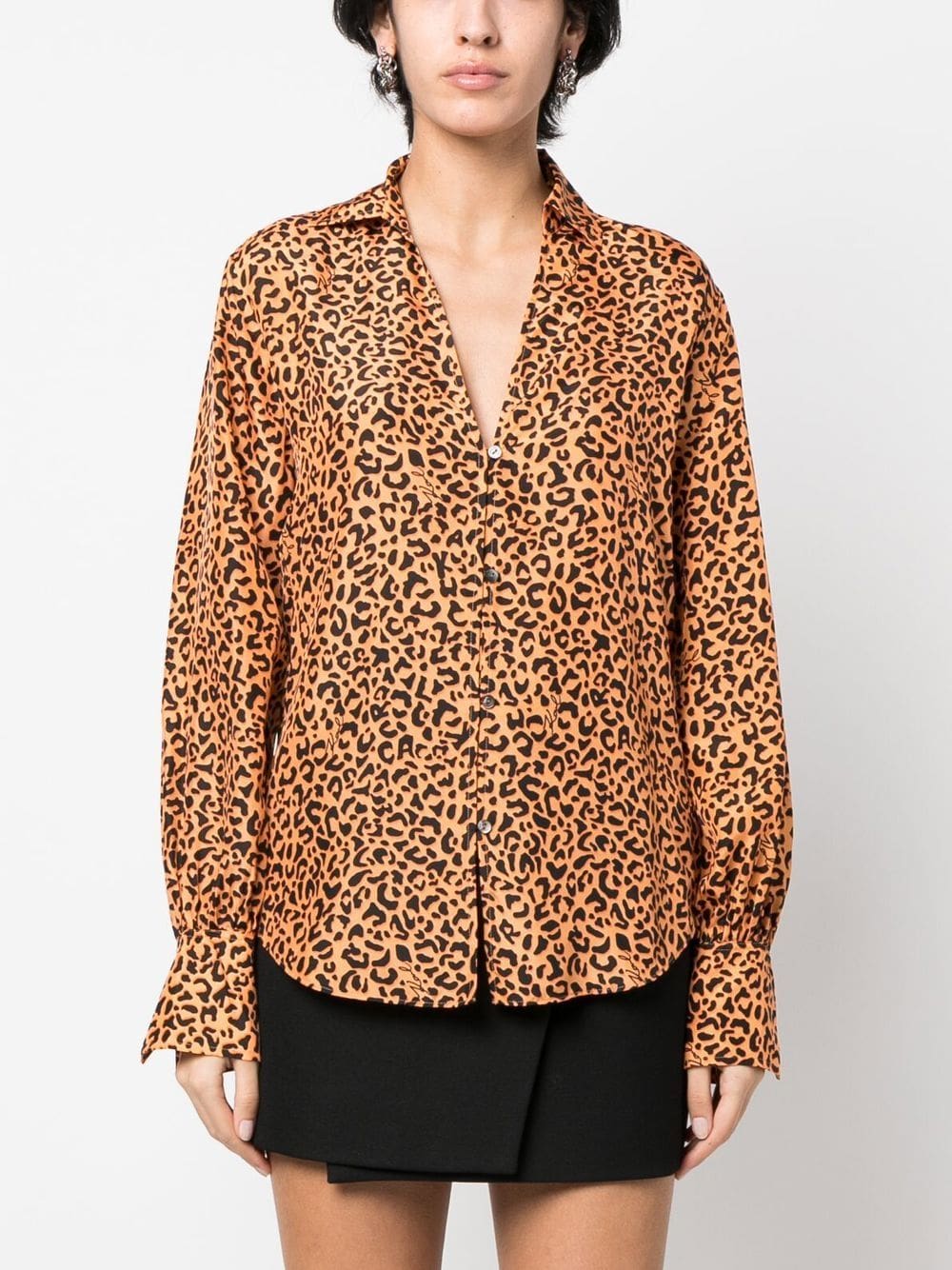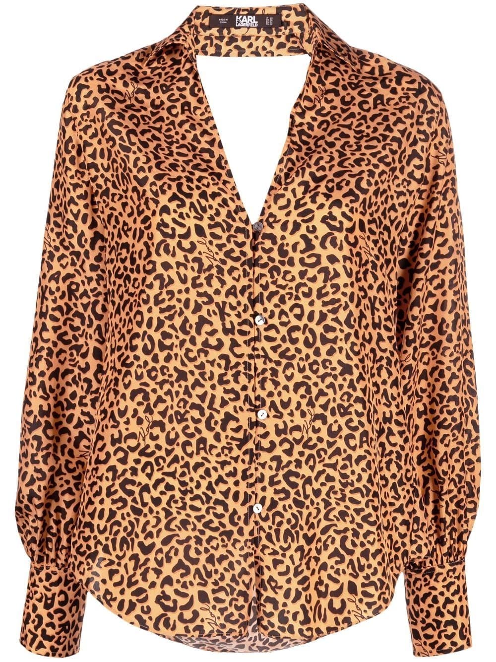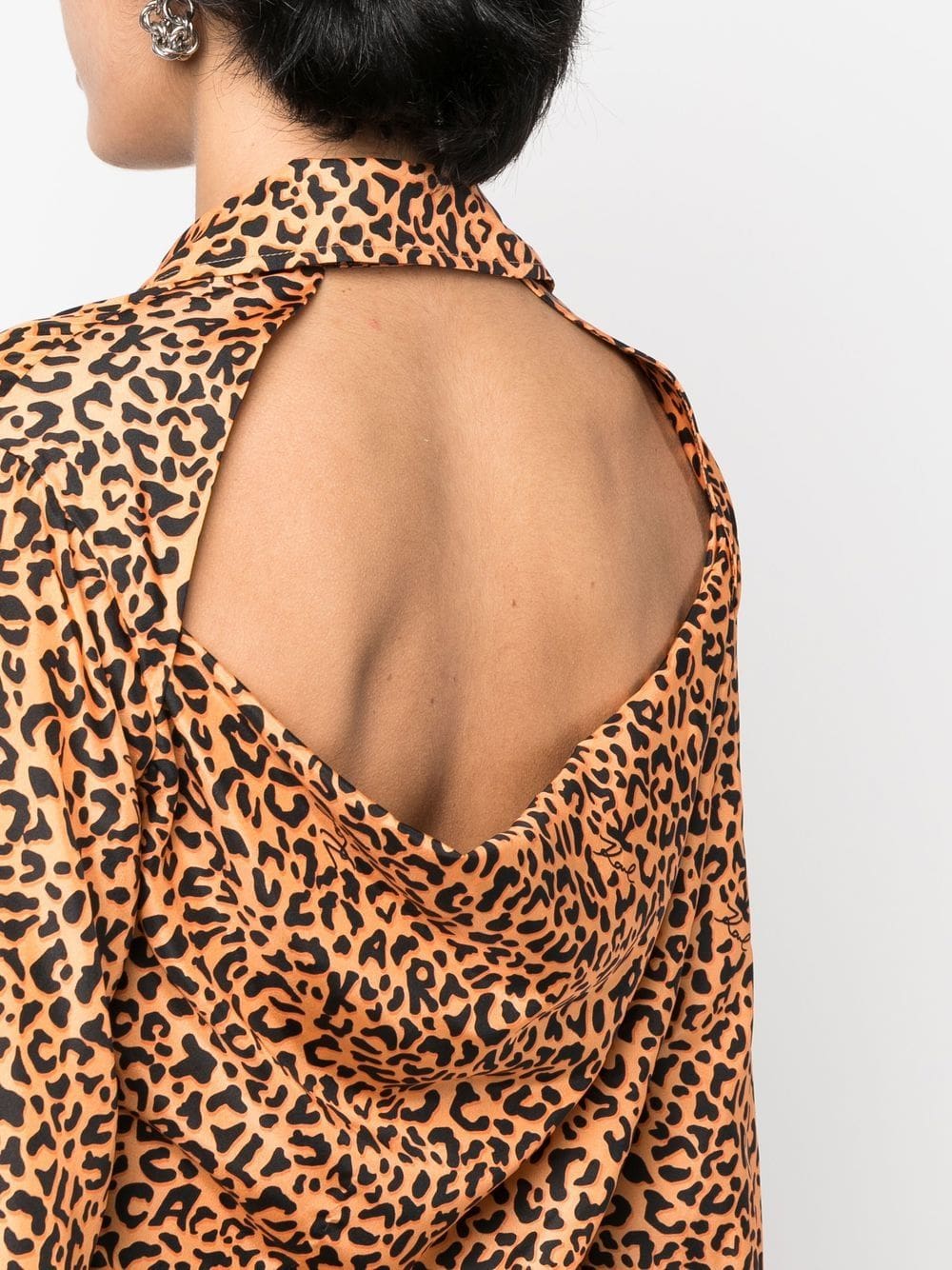 orange/black silk all-over leopard print backless front button fastening spread collar long sleeves buttoned cuffs curved hem