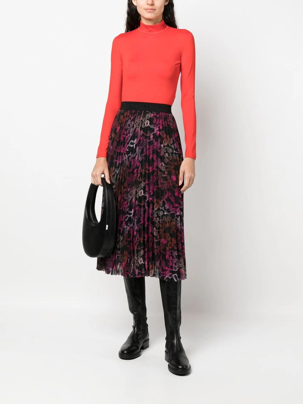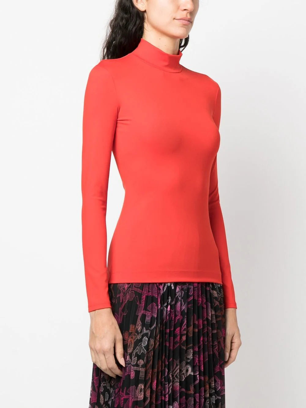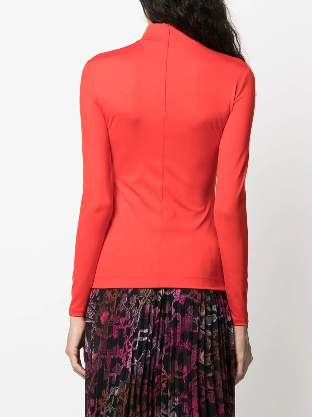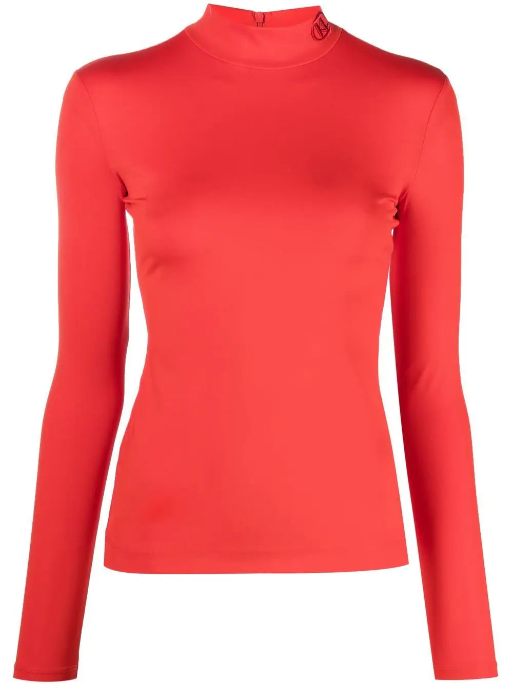 logo-embroidered high-neck top from KARL LAGERFELD featuring stretch-design, logo-embroidered collar, high neck, concealed rear zip fastening, long sleeves, straight hem and fiery red.