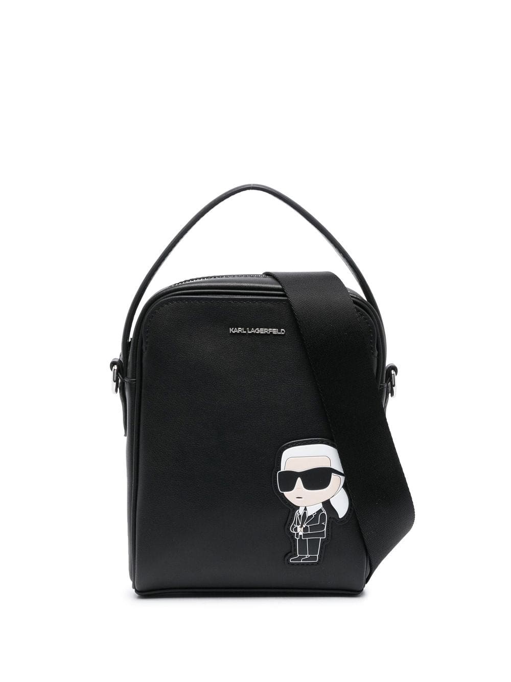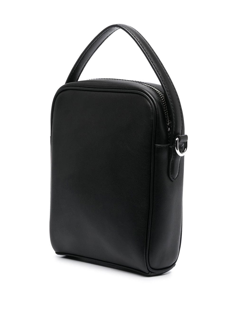jet black calf leather logo plaque single flat top handle all-around zip fastening adjustable shoulder strap
