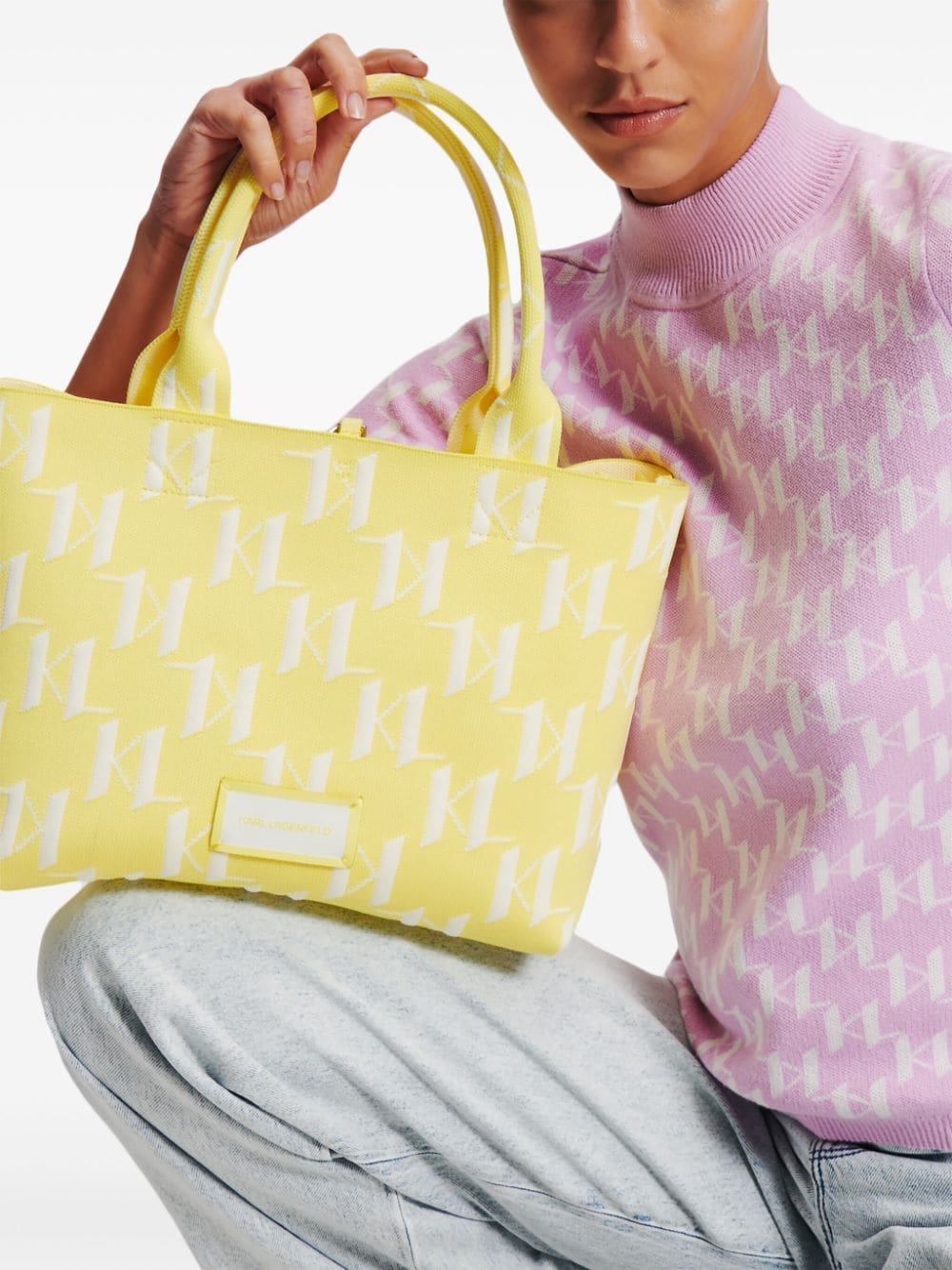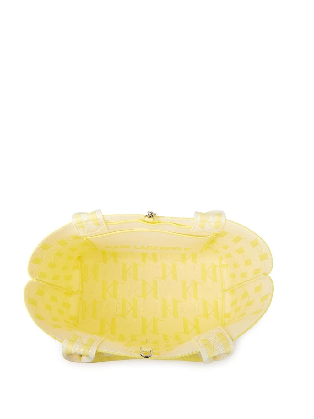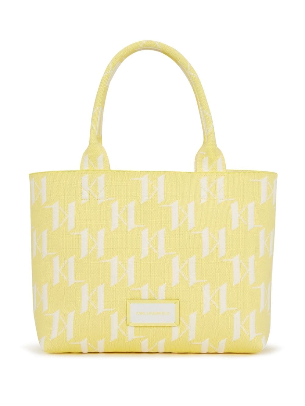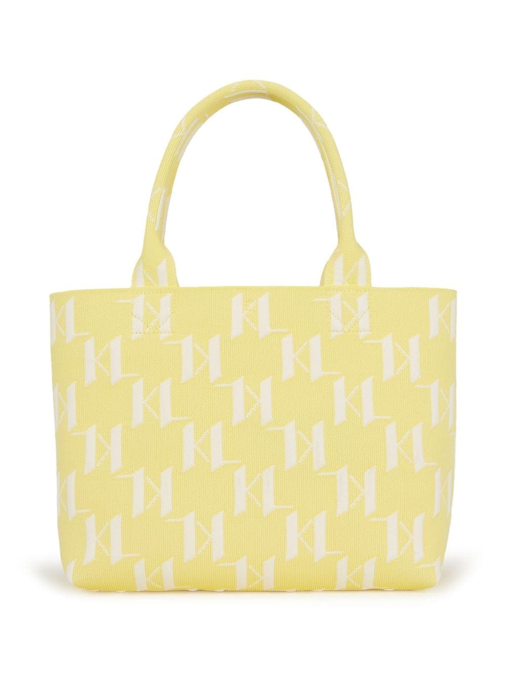 An all-over monogram motif renders this K/Monogram tote bag from Karl Lagerfeld a recognisable piece. It's knitted from yellow and white recycled yarns to a square silhouette with two top handles and an optional shoulder strap.