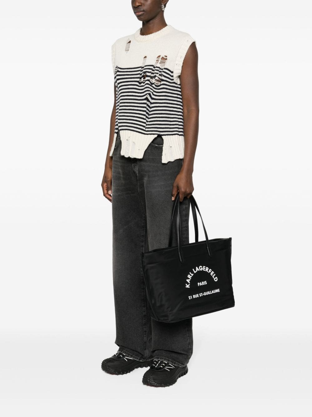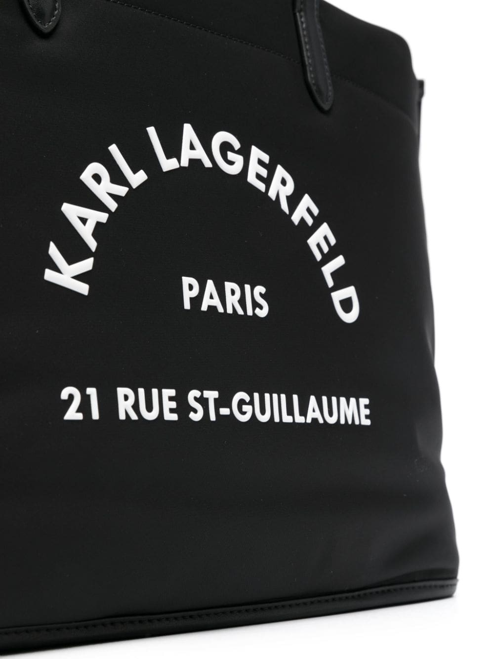 Inspired by Karl Lagerfeld's maison address in Paris, this black tote bag is adorned with a 21 Rue Saint-Guillaume and logo print on the front. The capacious design features two long top handles and top zip fastening to safely stow belongings.
