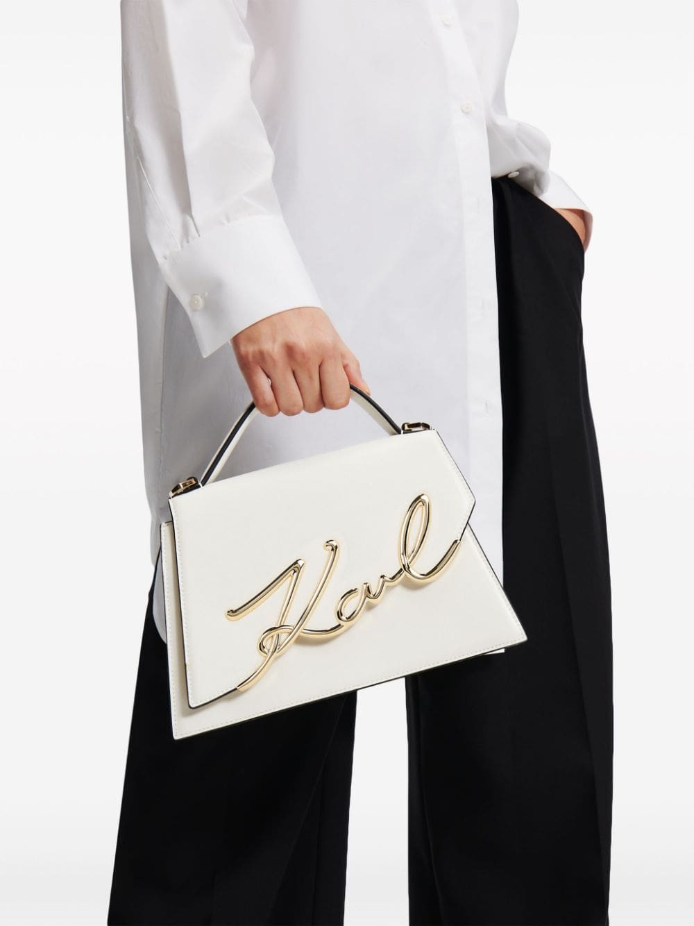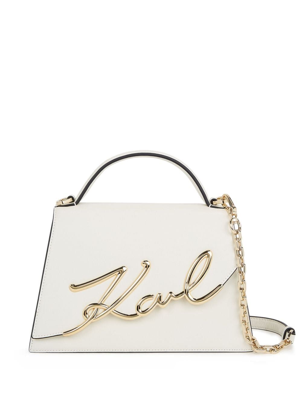 Karl Lagerfeld leaves his mark on his namesake brand. This Signature 2.0 two-way bag is adorned with the creative director's name in gold-tone hardware. The trapeze-shaped construction is handcrafted from smooth calf leather.