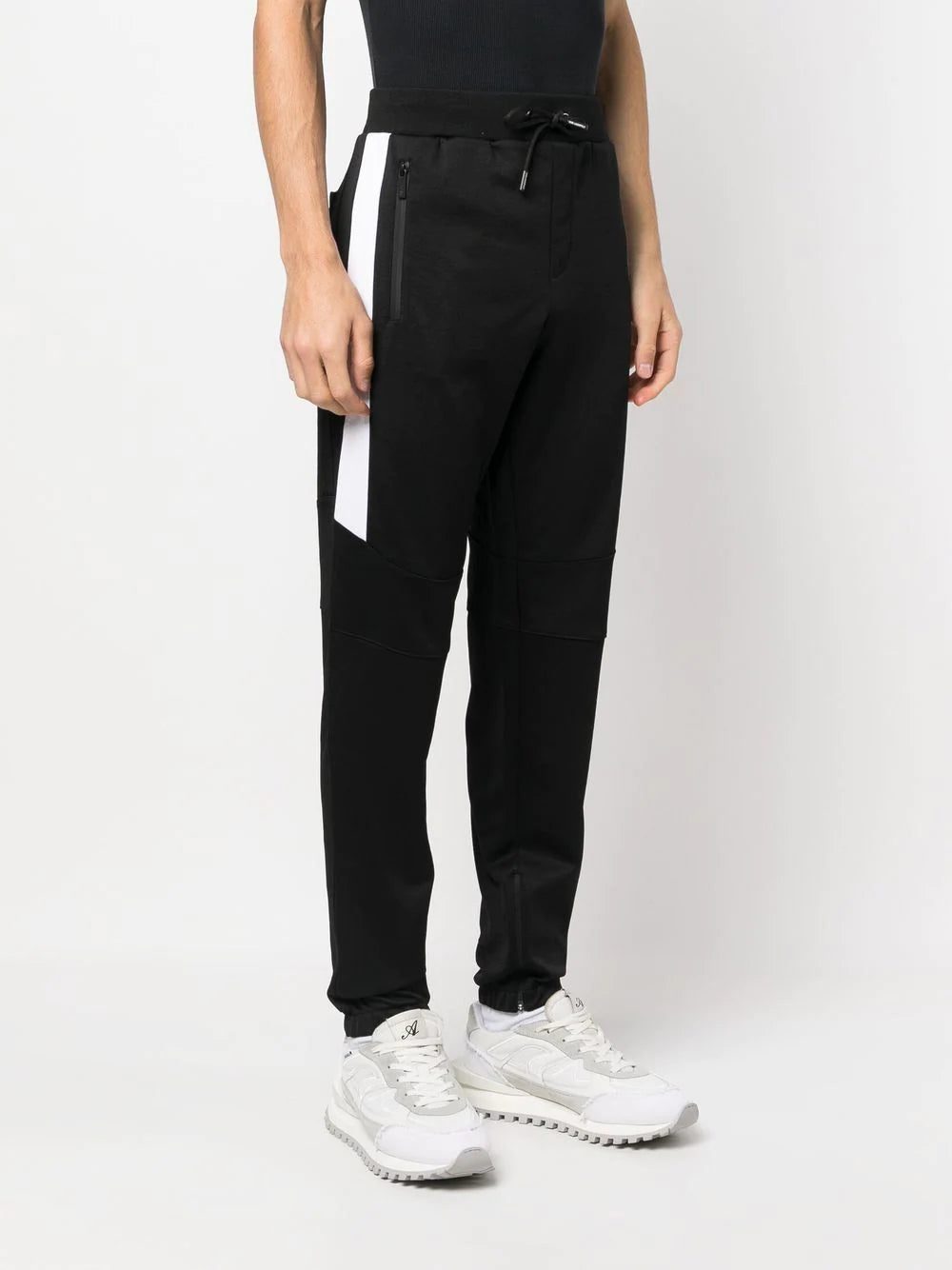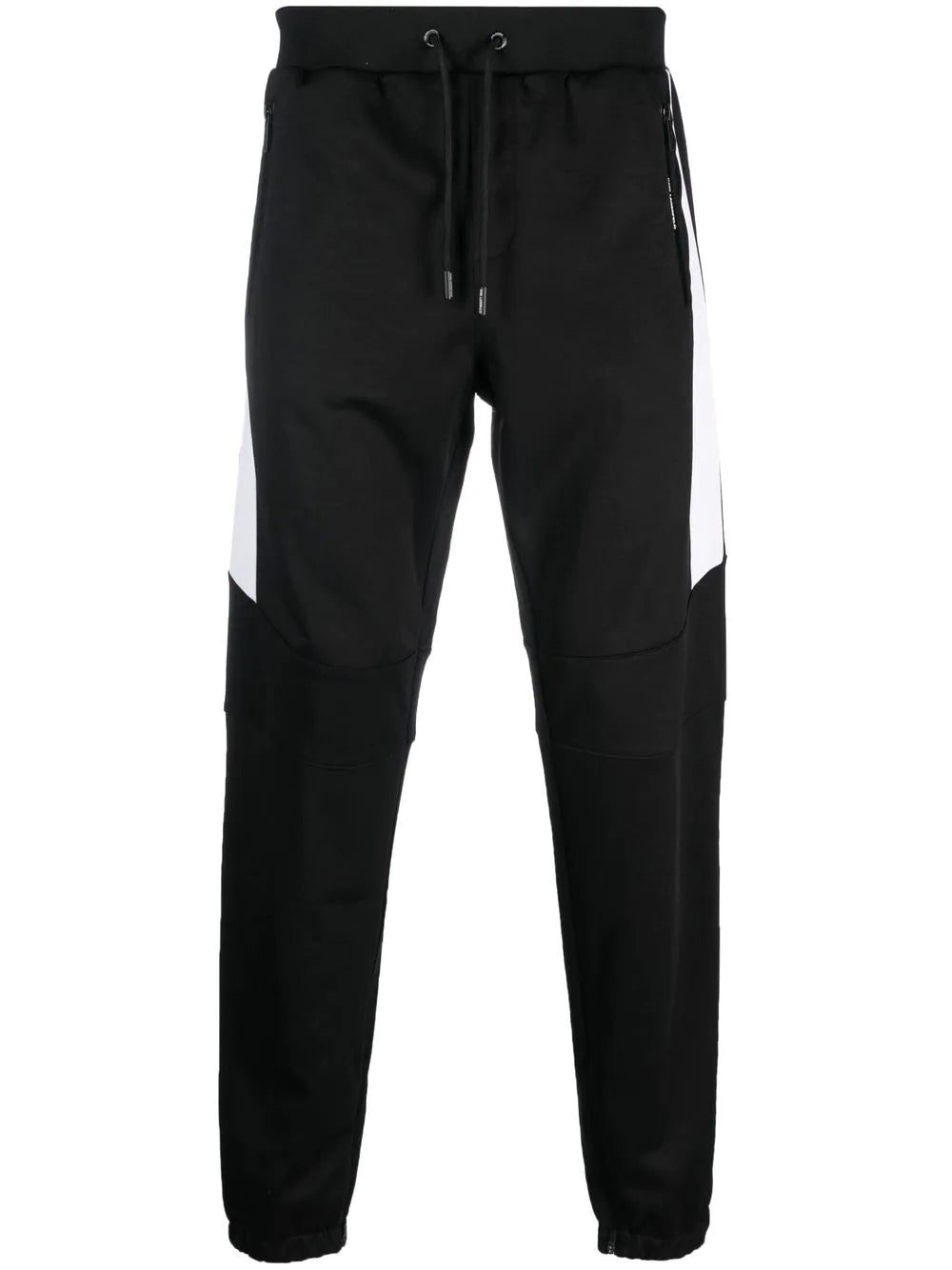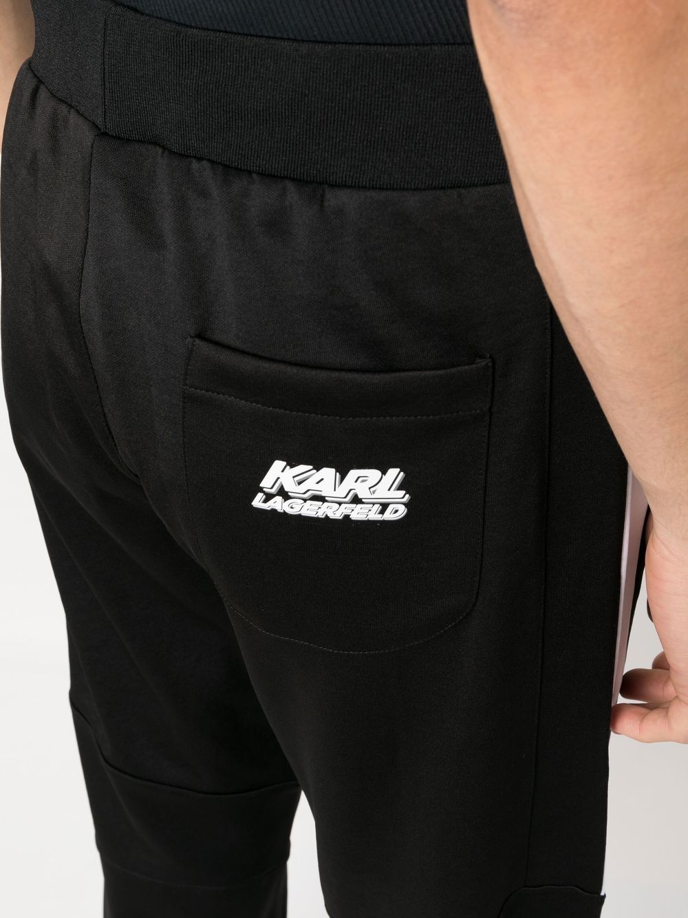 panel-detail track pants from KARL LAGERFELD featuring black/white, cotton blend, jersey fleece, ribbed trim, contrasting panel detail, logo print to the rear, elasticated drawstring waistband, tapered leg, elasticated ankles, cuff zips, two side zip-fastening pockets and rear patch pocket.