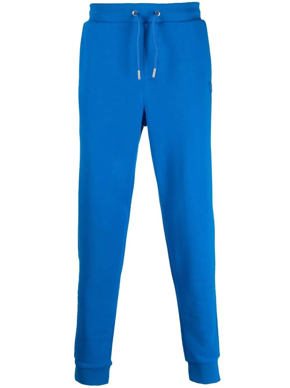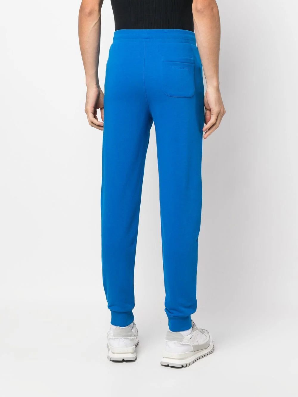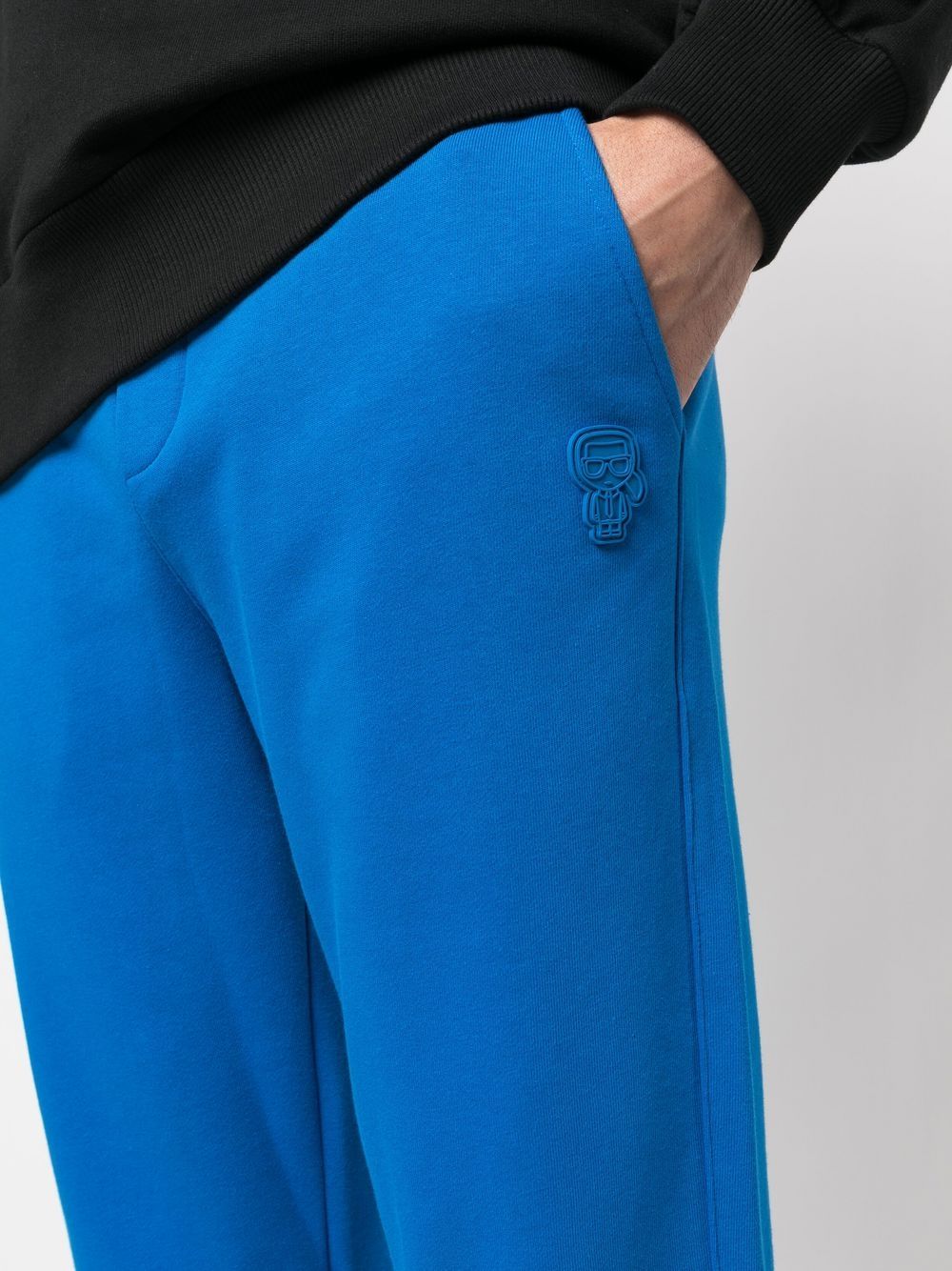 raised-logo track pants from KARL LAGERFELD featuring blue, cotton blend, jersey fleece, silver-tone hardware, signature Ikonik Karl motif, raised logo detail, logo patch to the side, logo print at the leg, elasticated drawstring waistband, tapered leg, elasticated ankles, two diagonal pockets to the sides and rear patch pocket.