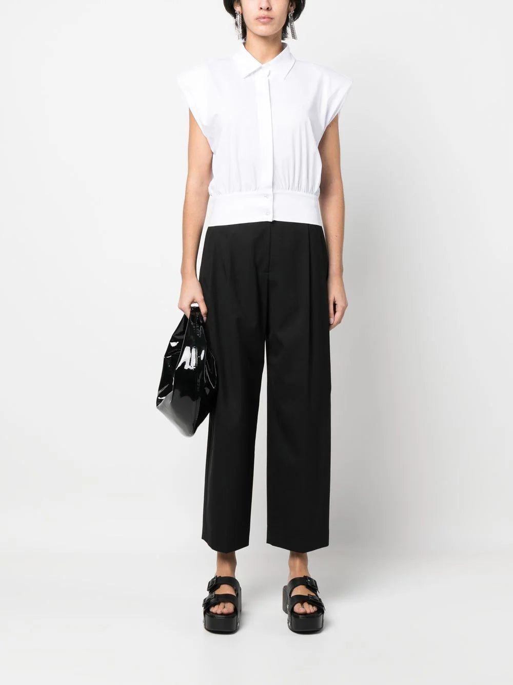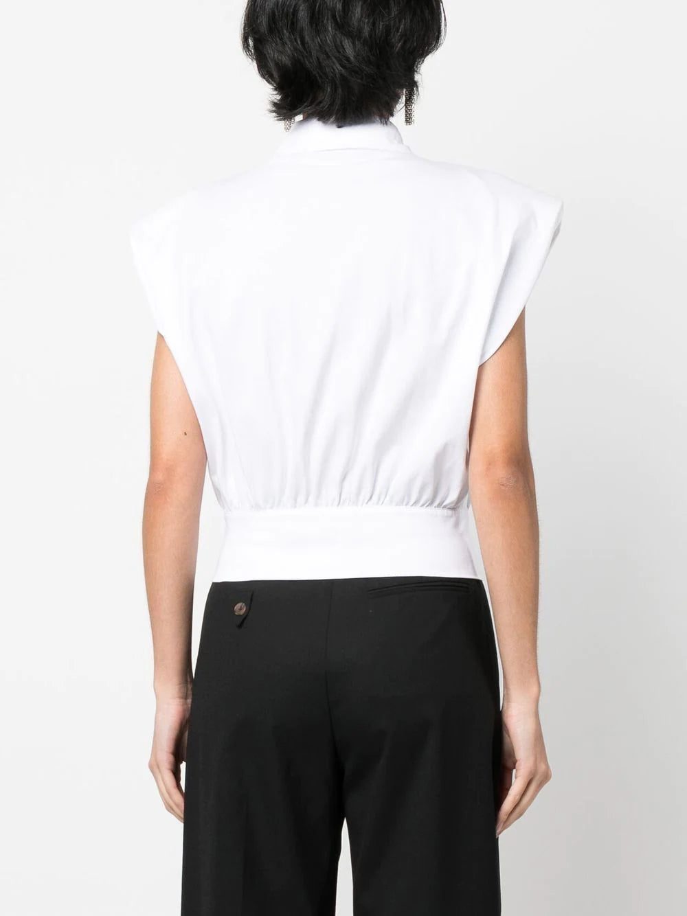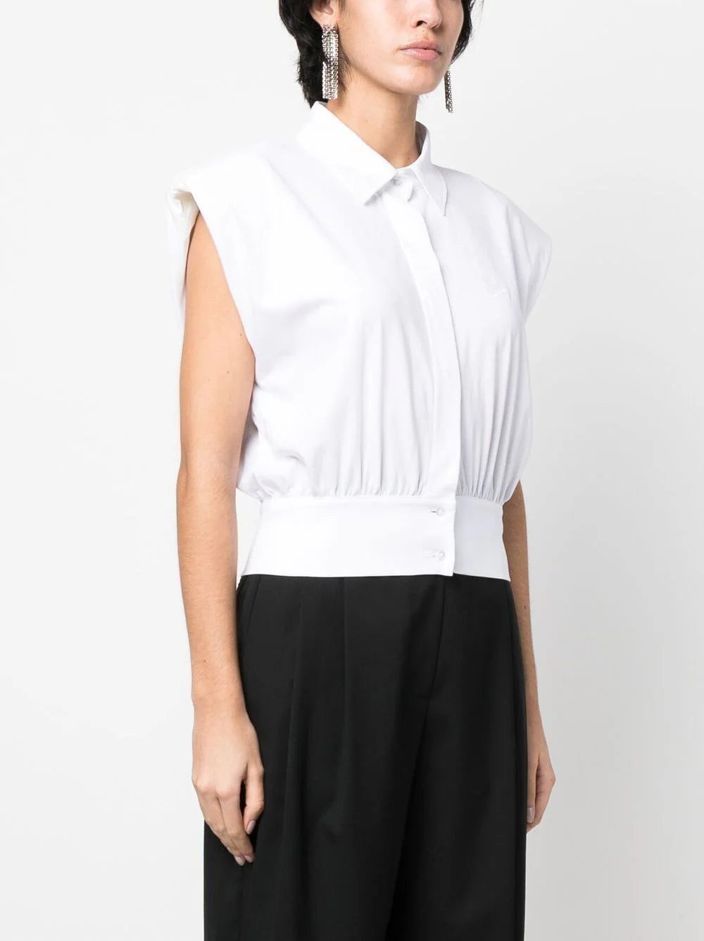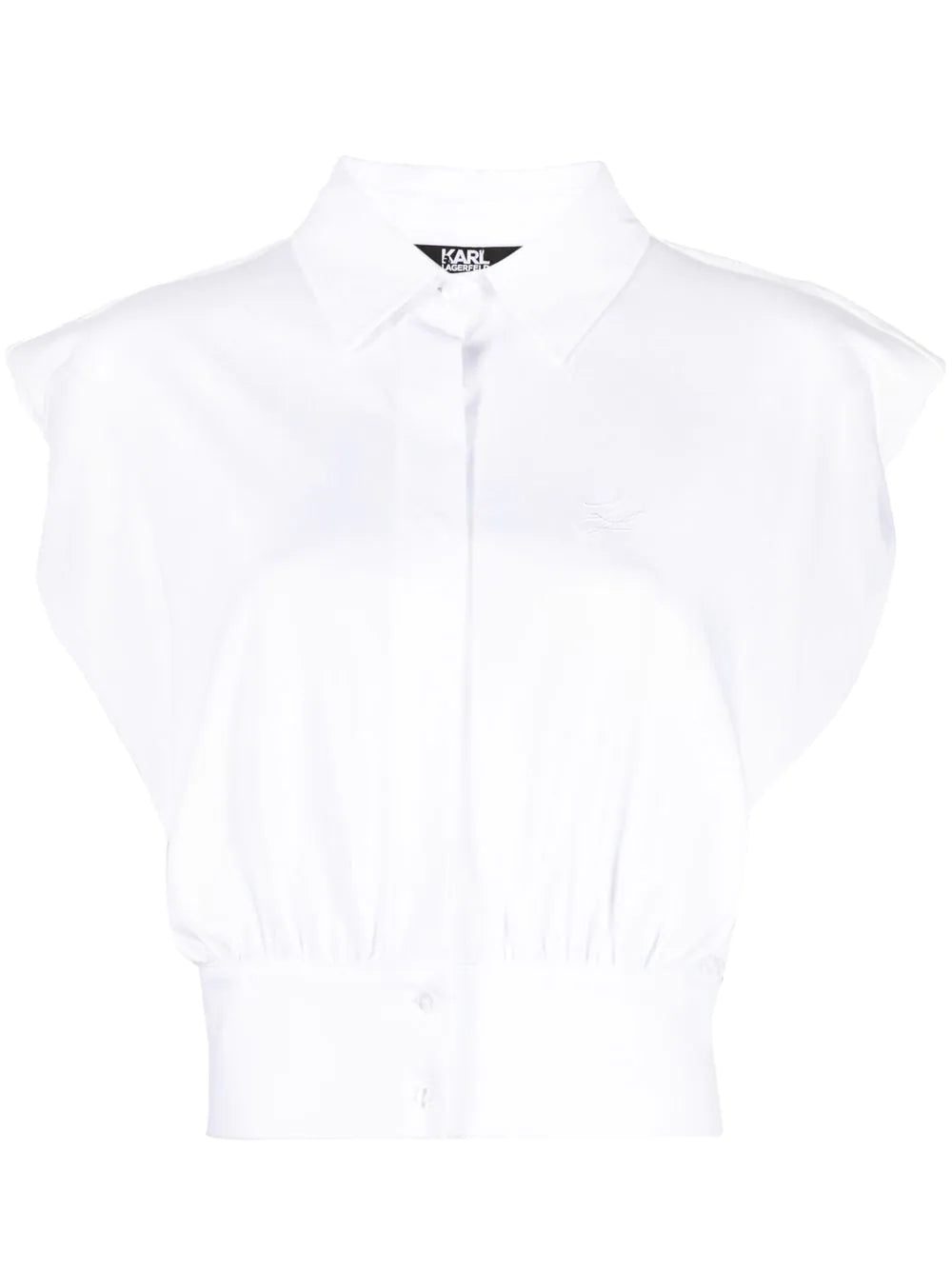 shoulder-pad sleeveless shirt from KARL LAGERFELD featuring white, organic cotton, shoulder pads, cropped, fitted waistline, pointed flat collar, front button fastening, sleeveless and straight hem. Conscious: This item is made from at least 50% organic materials.