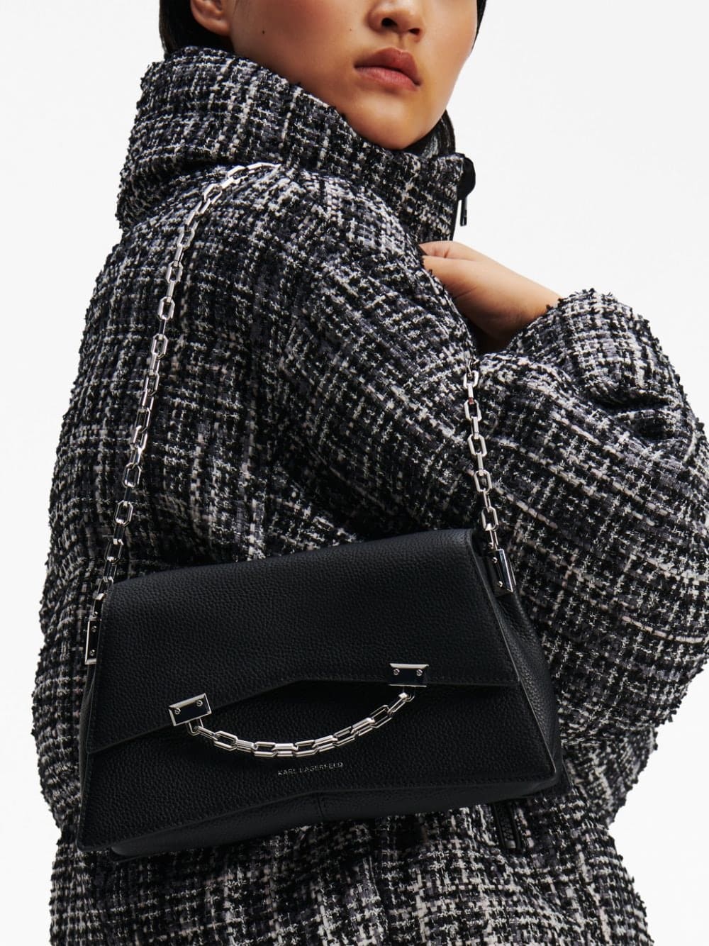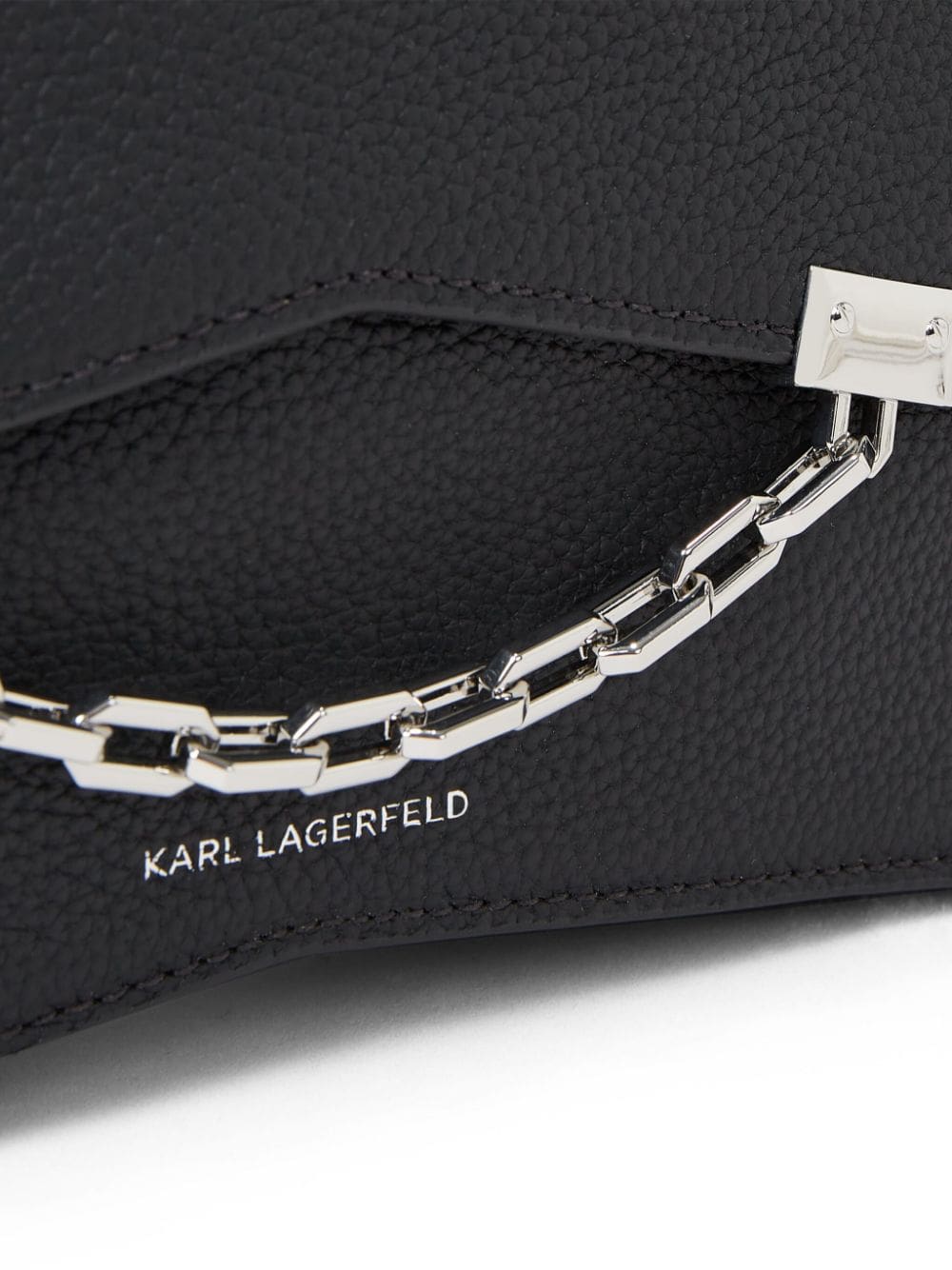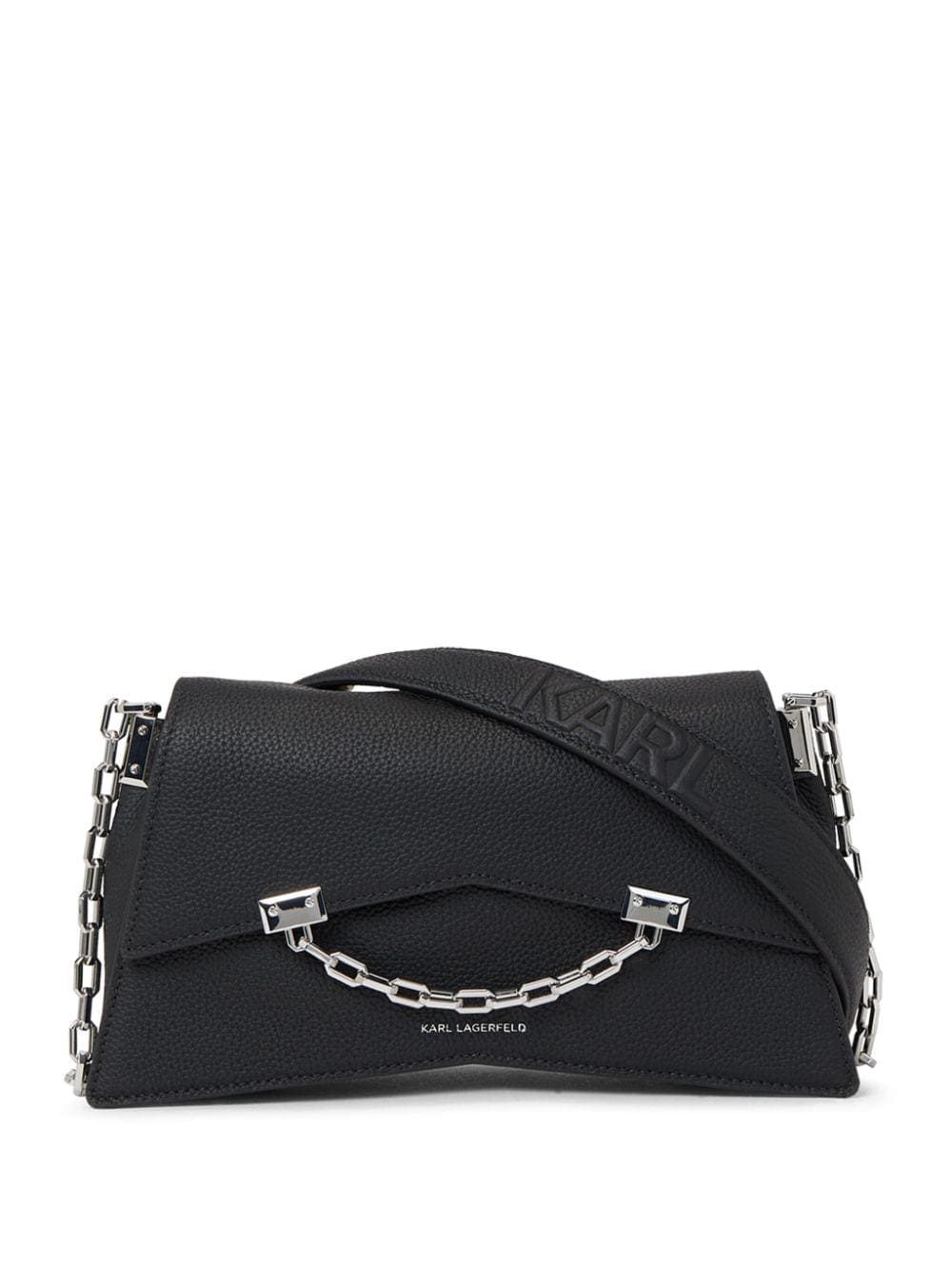 Karl Lagerfeld's K/Seven mini crossbody bag is defined by its silver-tone chain link detailing. Designed in classic black, the logo stamp to the front adds a level of prestige to the piece.