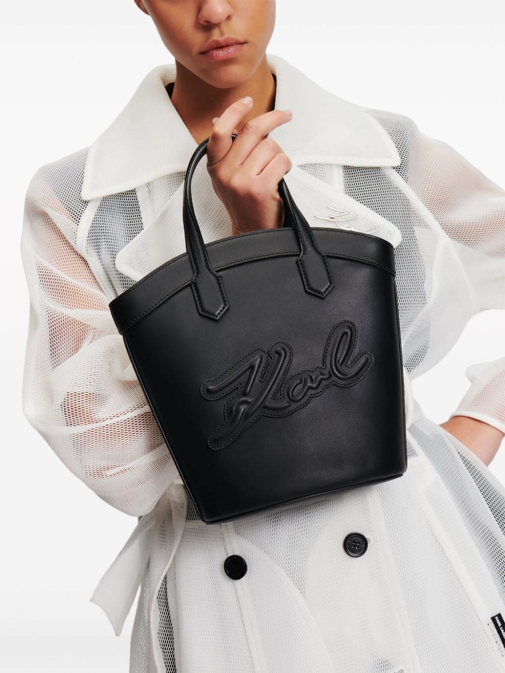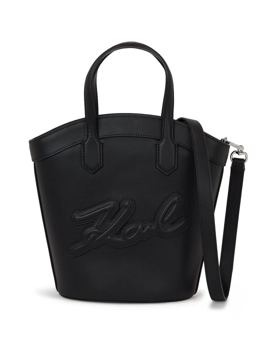 Karl Lagerfeld's K/Signature Tulip tote bag is crafted from smooth calf leather in black and features a compact bucket silhouette. It's equipped with two top handles, an optional shoulder strap and is adorned with the brand's signature Karl script logo embossed on the front.