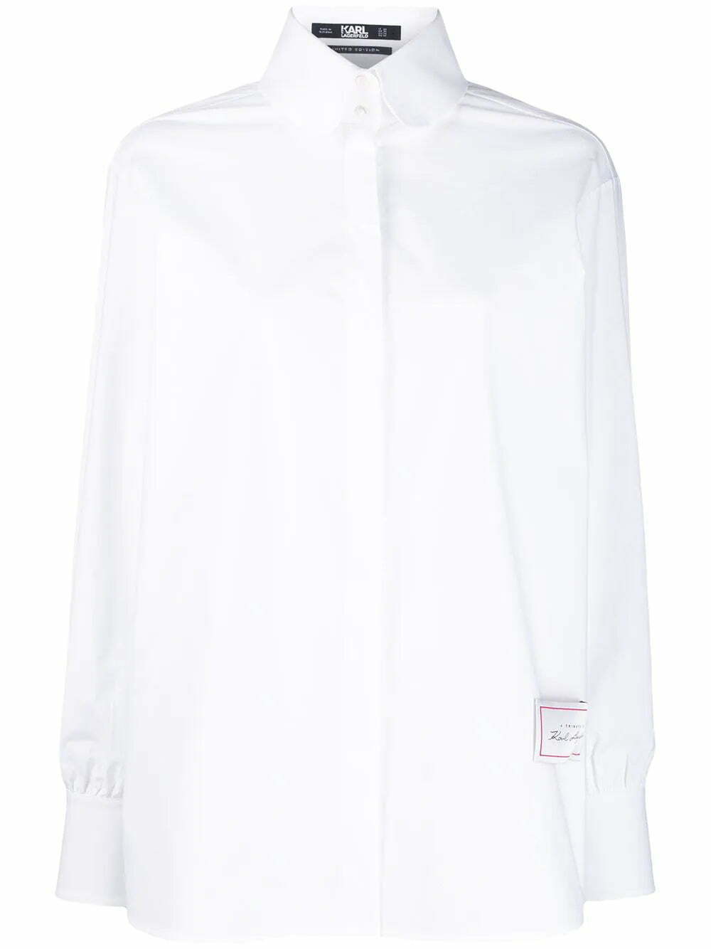 The legendary Karl Lagerfeld once stated 'If you ask me what I'd most like to have invited in fashion, I'd say the white shirt. For the, the white shirt is the basis of everything. Everything else comes after.' A special part of the limited-edition Tribute Collection, this The Essential White Shirt from Karl Lagerfeld is an ode to the late designer, but way of a high stand collar and button cuffs. Look to the hemline to reveal the 'Tribute to Karl' patch. This piece is one of 77 sold worldwide. Please note that this item is limited edition.