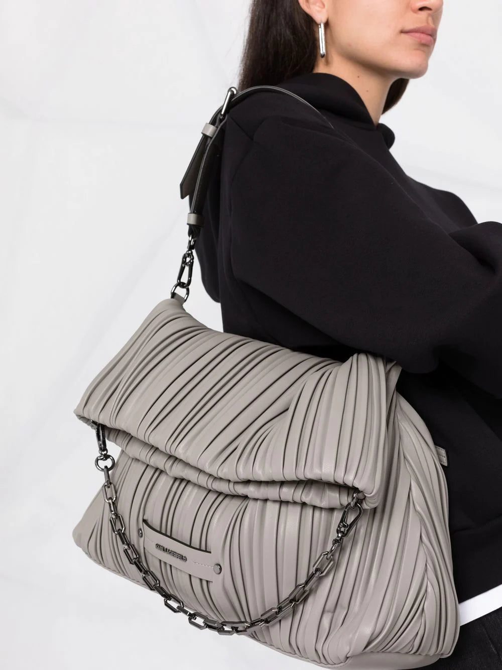 This pleated folded tote from Karl Lagerfeld's Amber Valetta collaboration is constructed in an innovative material developed from cactus leaves. The style features an all-over pleated design and is finished with both a detachable leather and chain strap.
