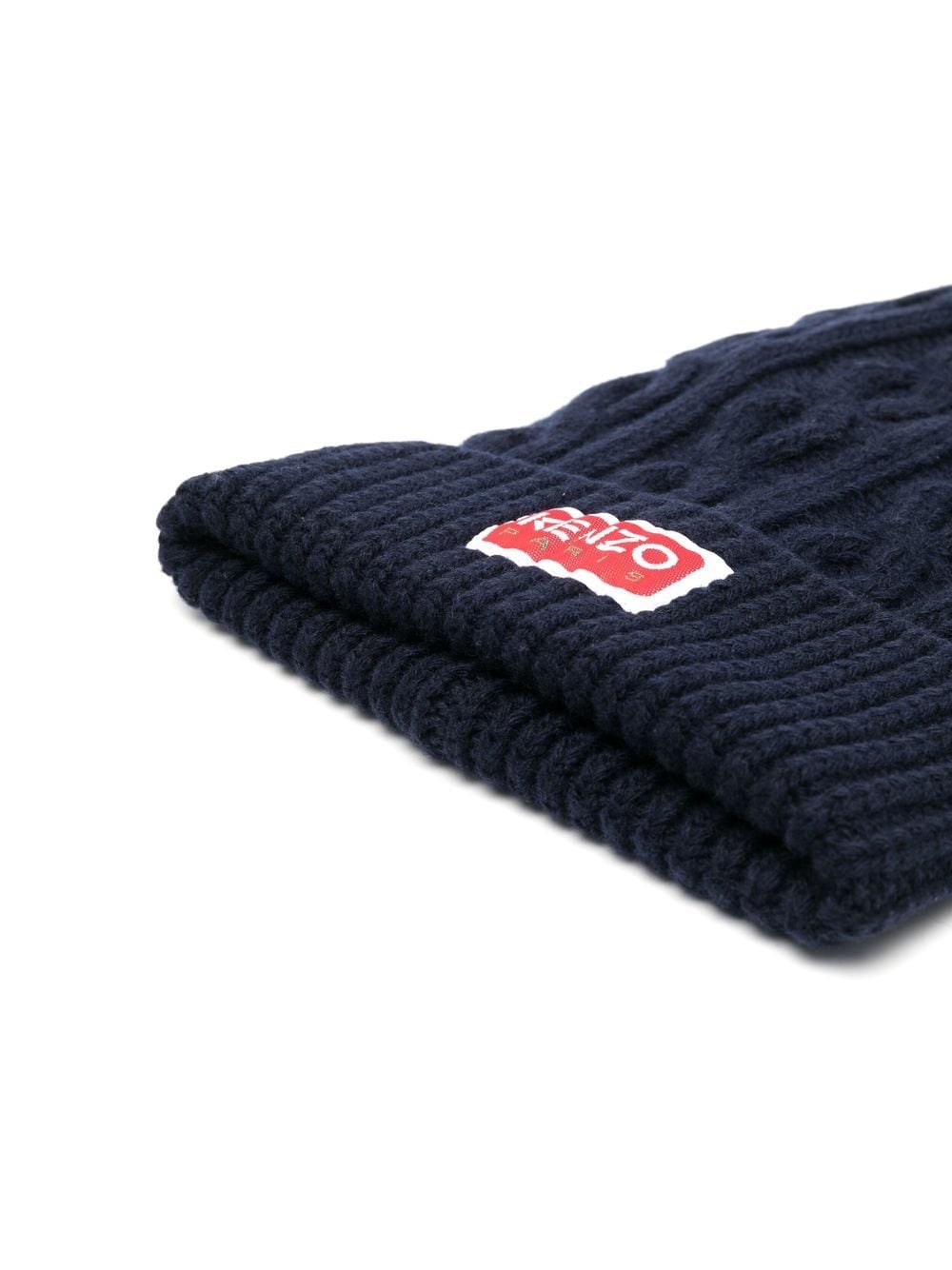 navy blue/red wool logo patch to the front cable knit ribbed hem