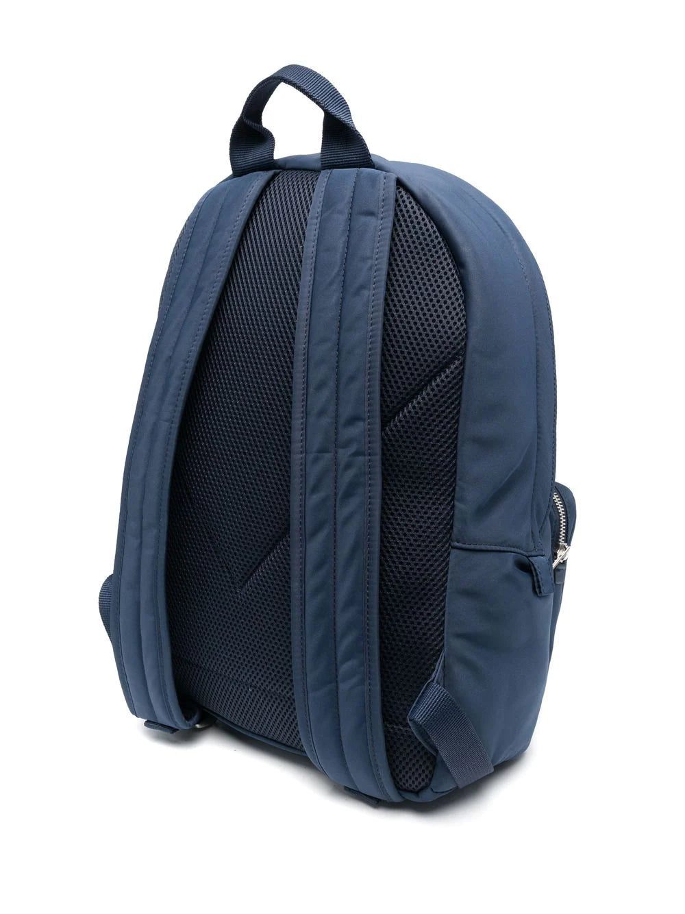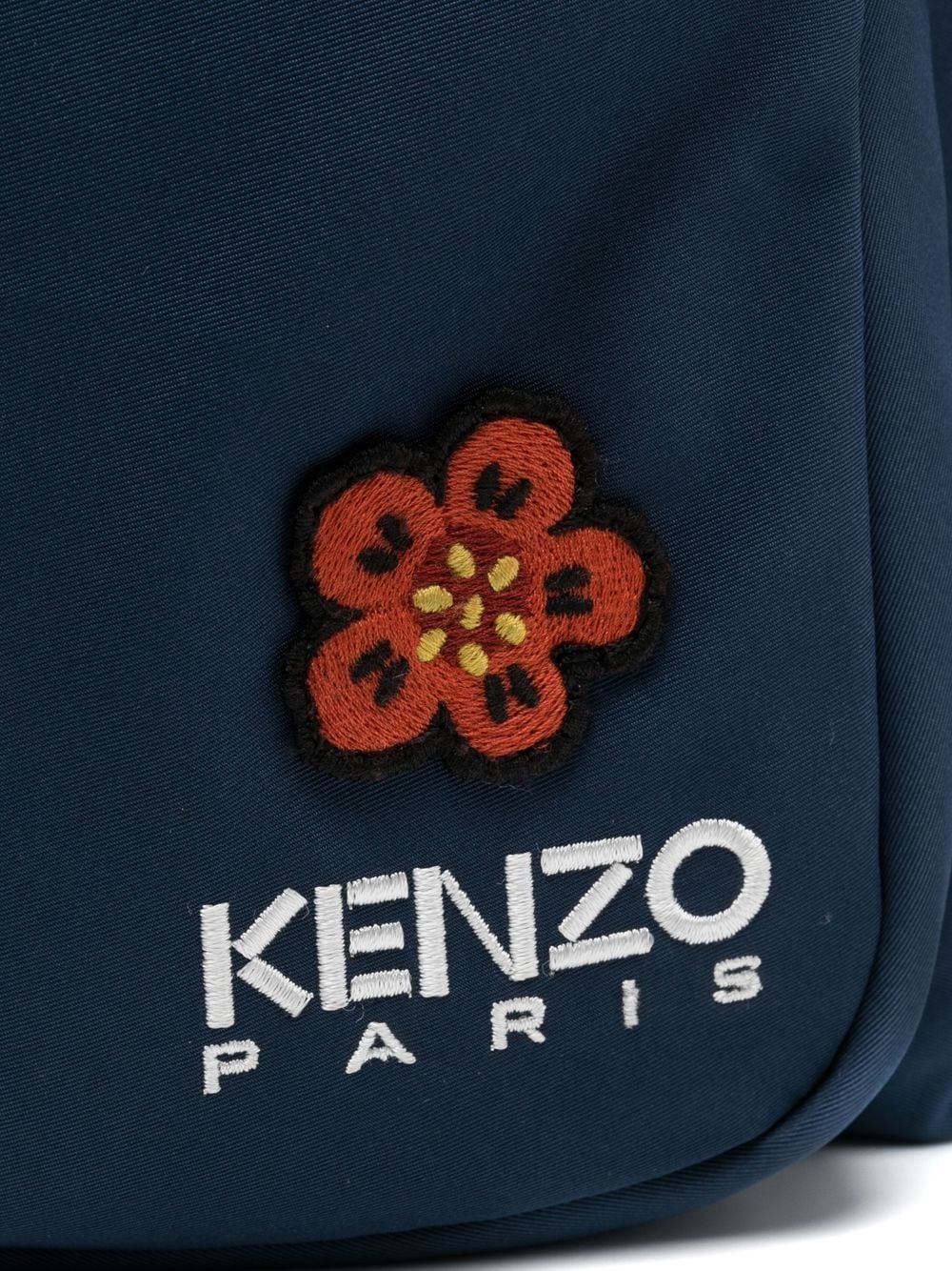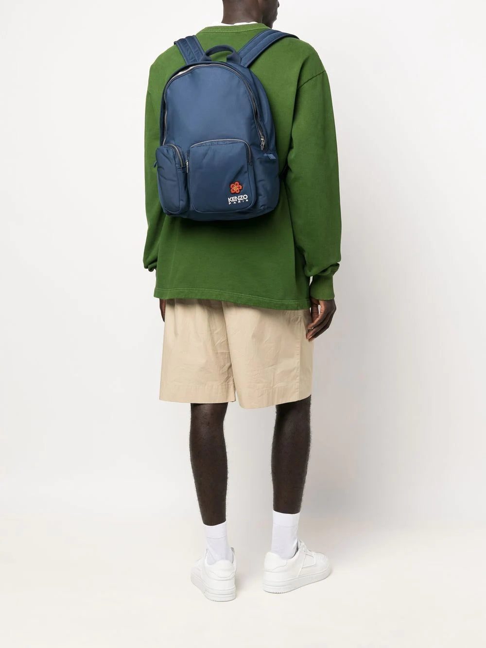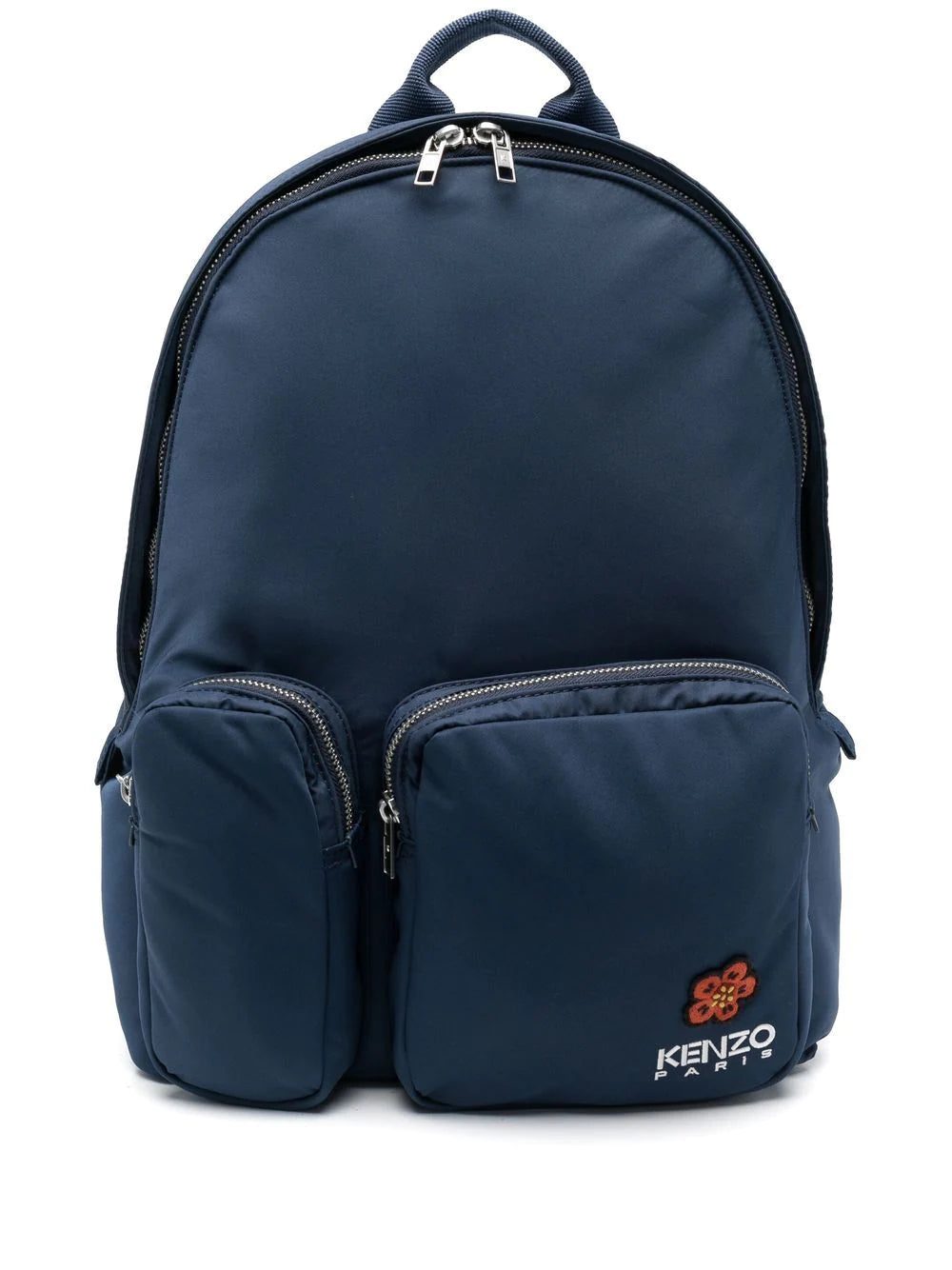 embroidered-logo backpack from KENZO featuring navy blue, embroidered logo to the front, floral appliqué, front zip fastening pockets, padded panels, adjustable shoulder strap, single flat top handle, top zip fastening, silver-tone hardware, internal logo patch and main compartment.