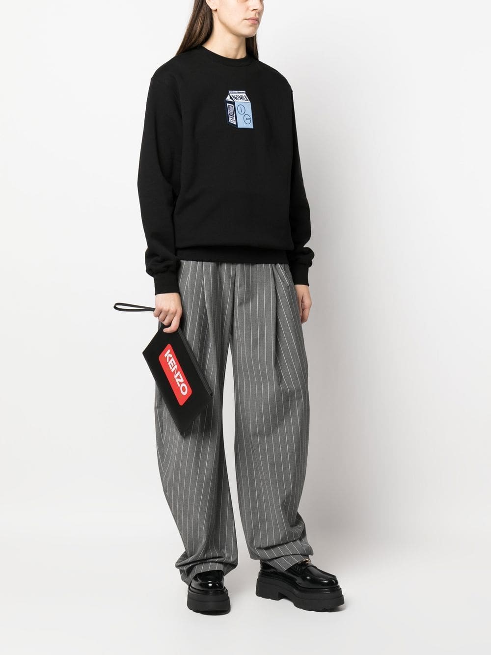 KENZO's clutch bag features signature bold branding. A logo patch in red and white takes the focus against the piece's black background.