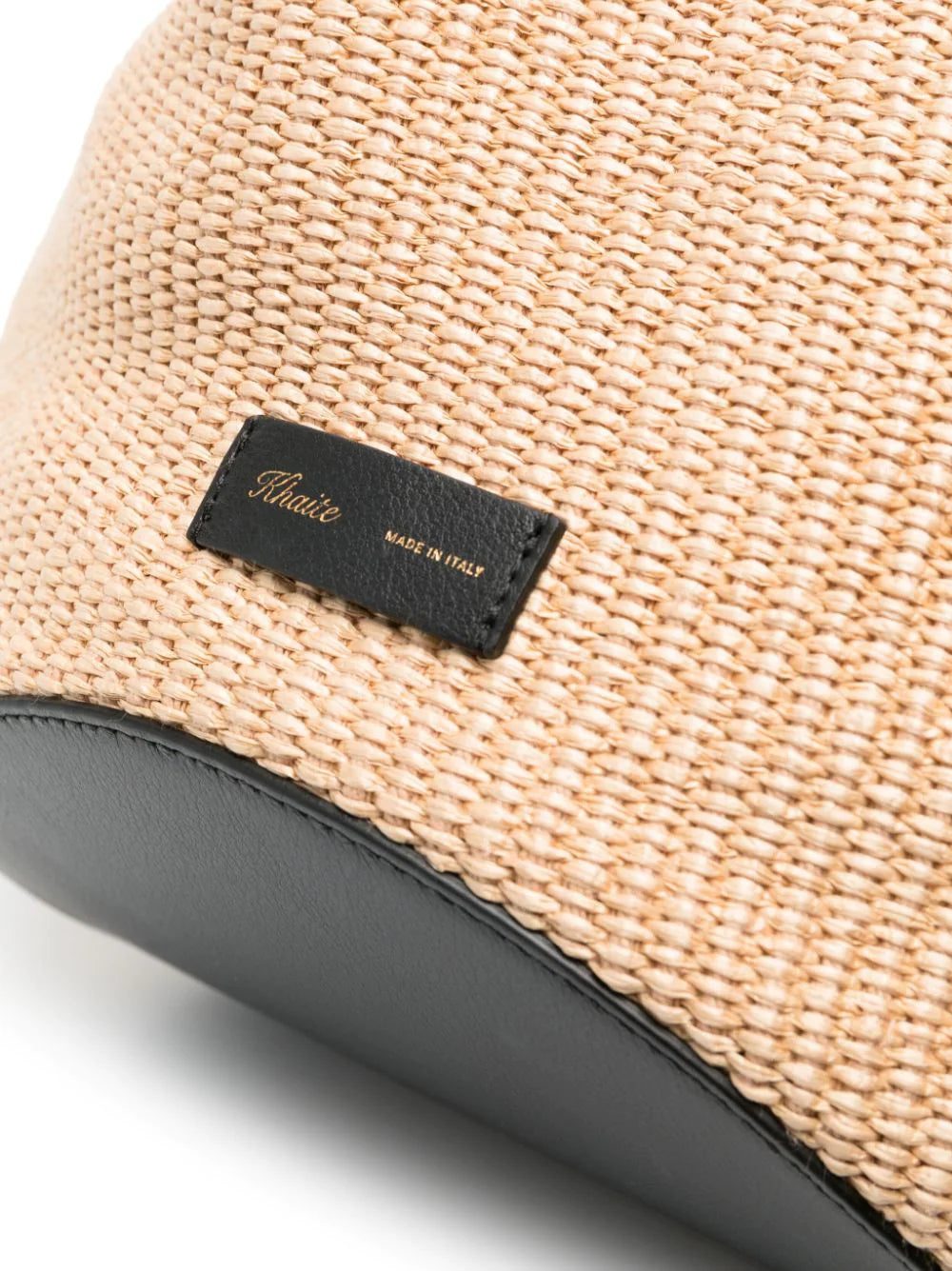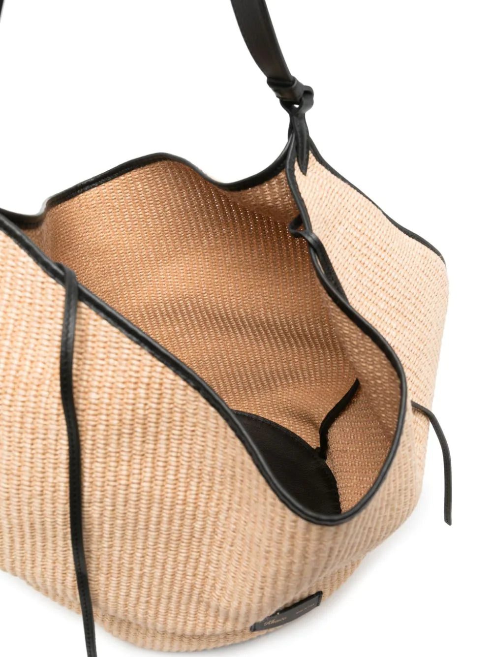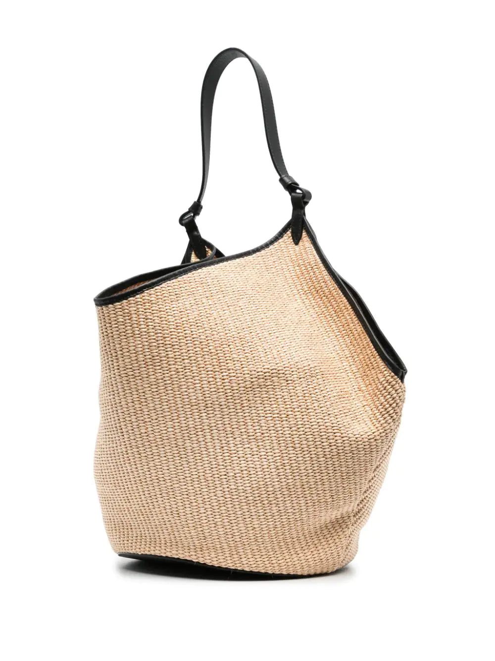medium Lotus raffia tote bag from KHAITE featuring beige, brown, calf leather, raffia, contrast stitching, slouch body, open top, single top handle and main compartment.