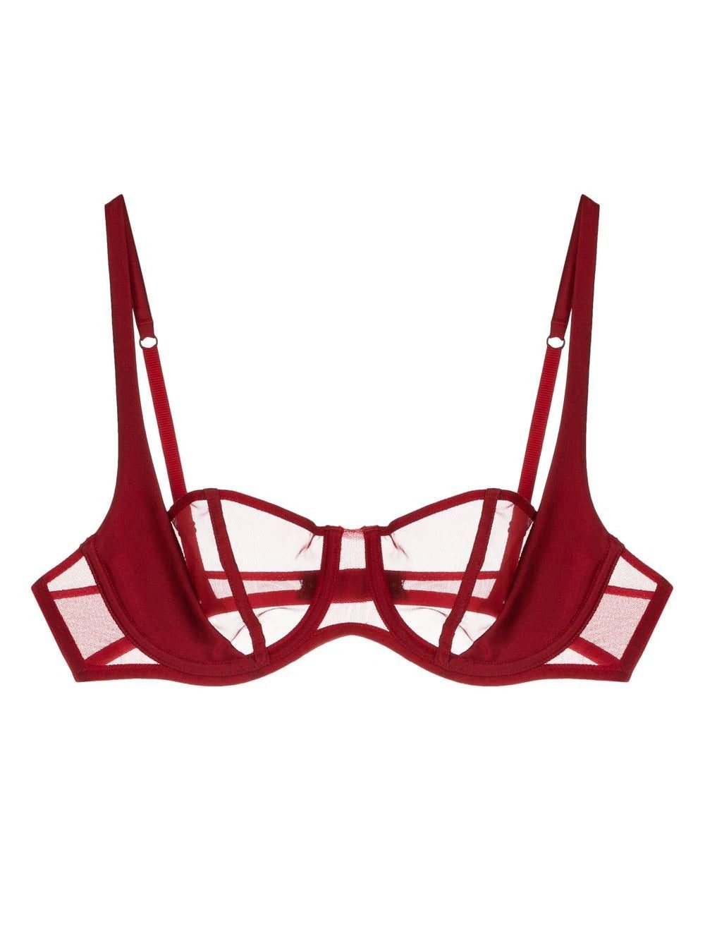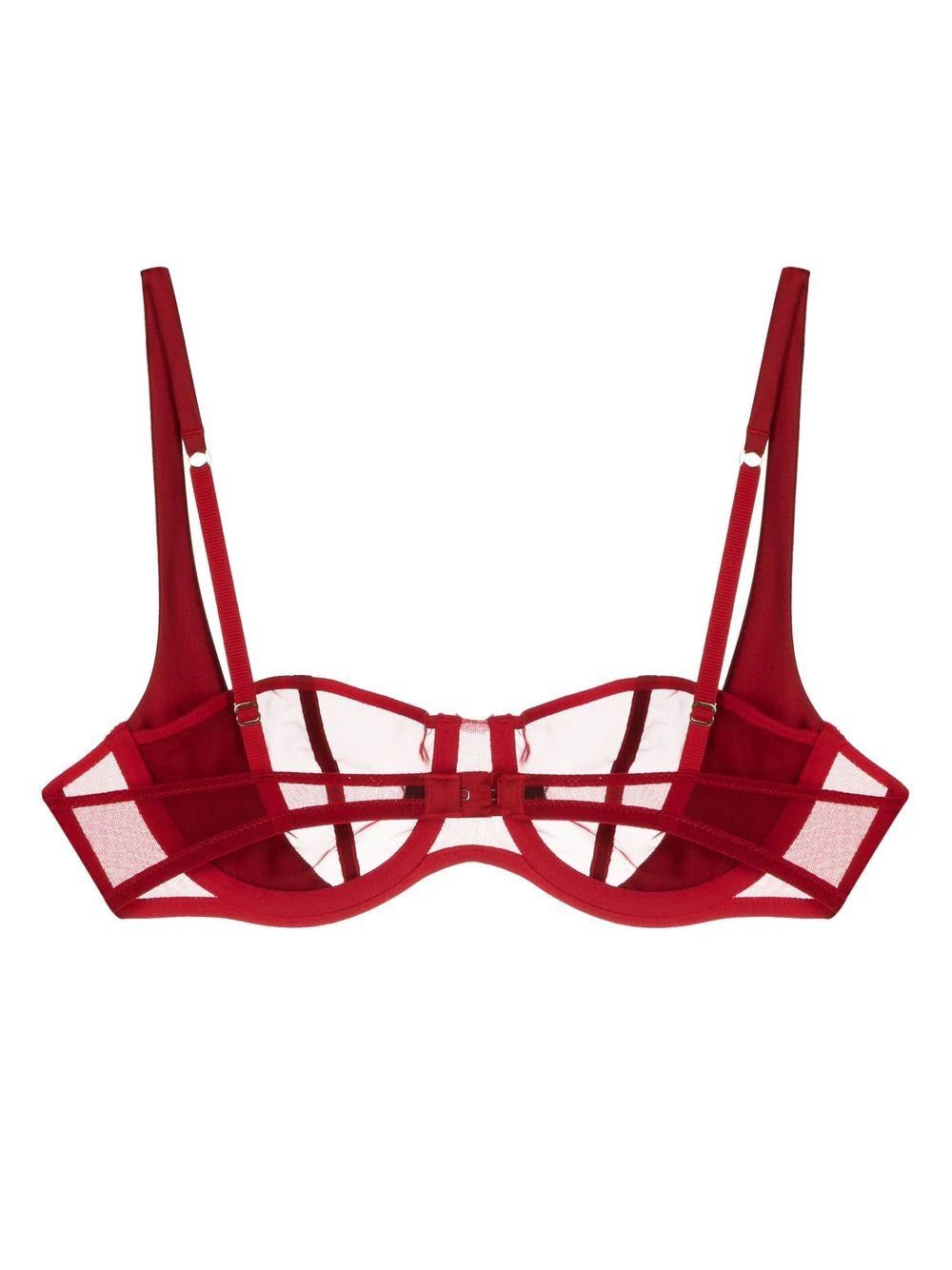 red semi-sheer construction underwire cup adjustable shoulder straps rear hook and eye fastening balconette style