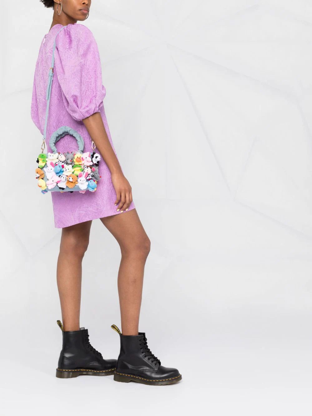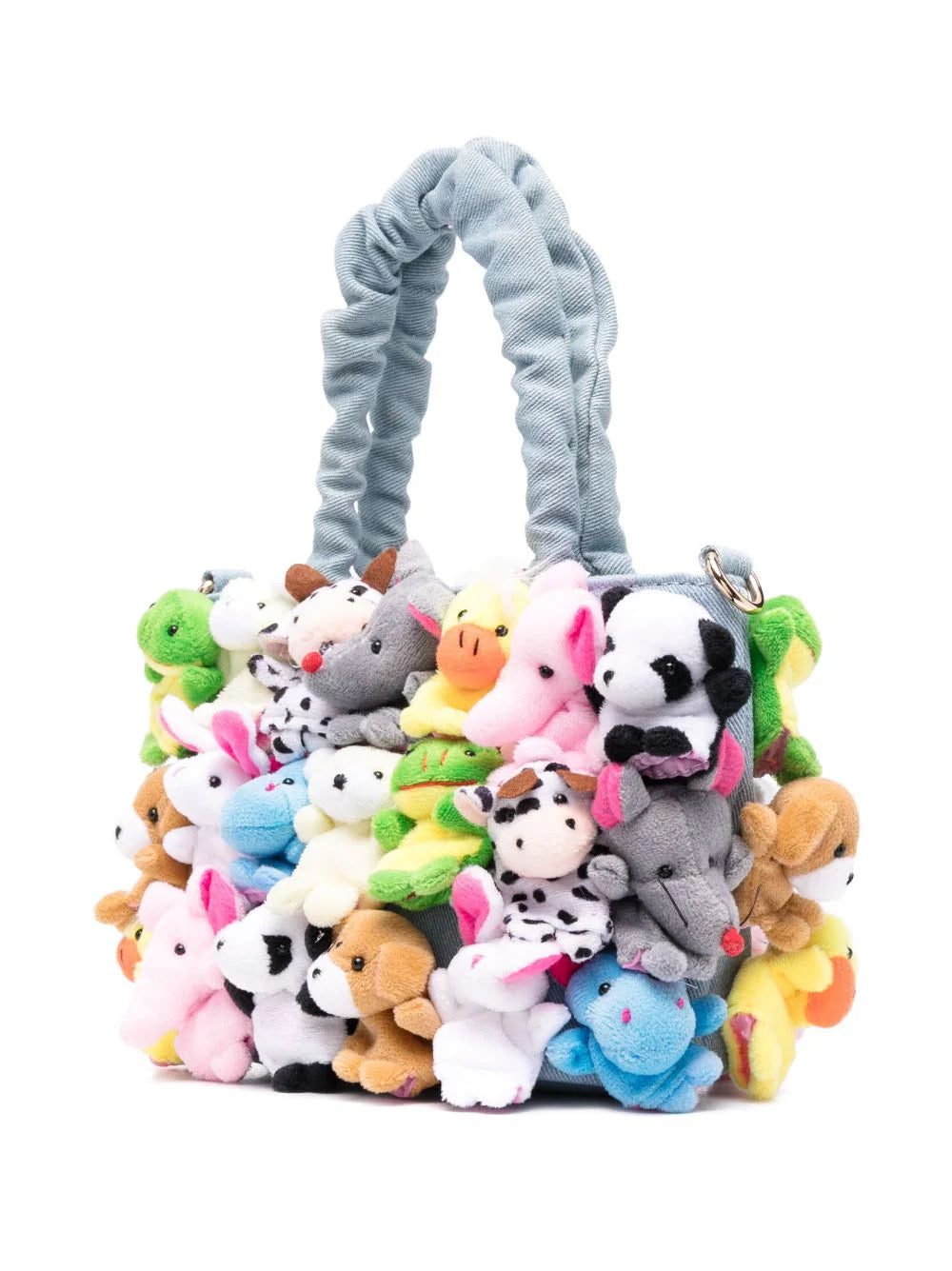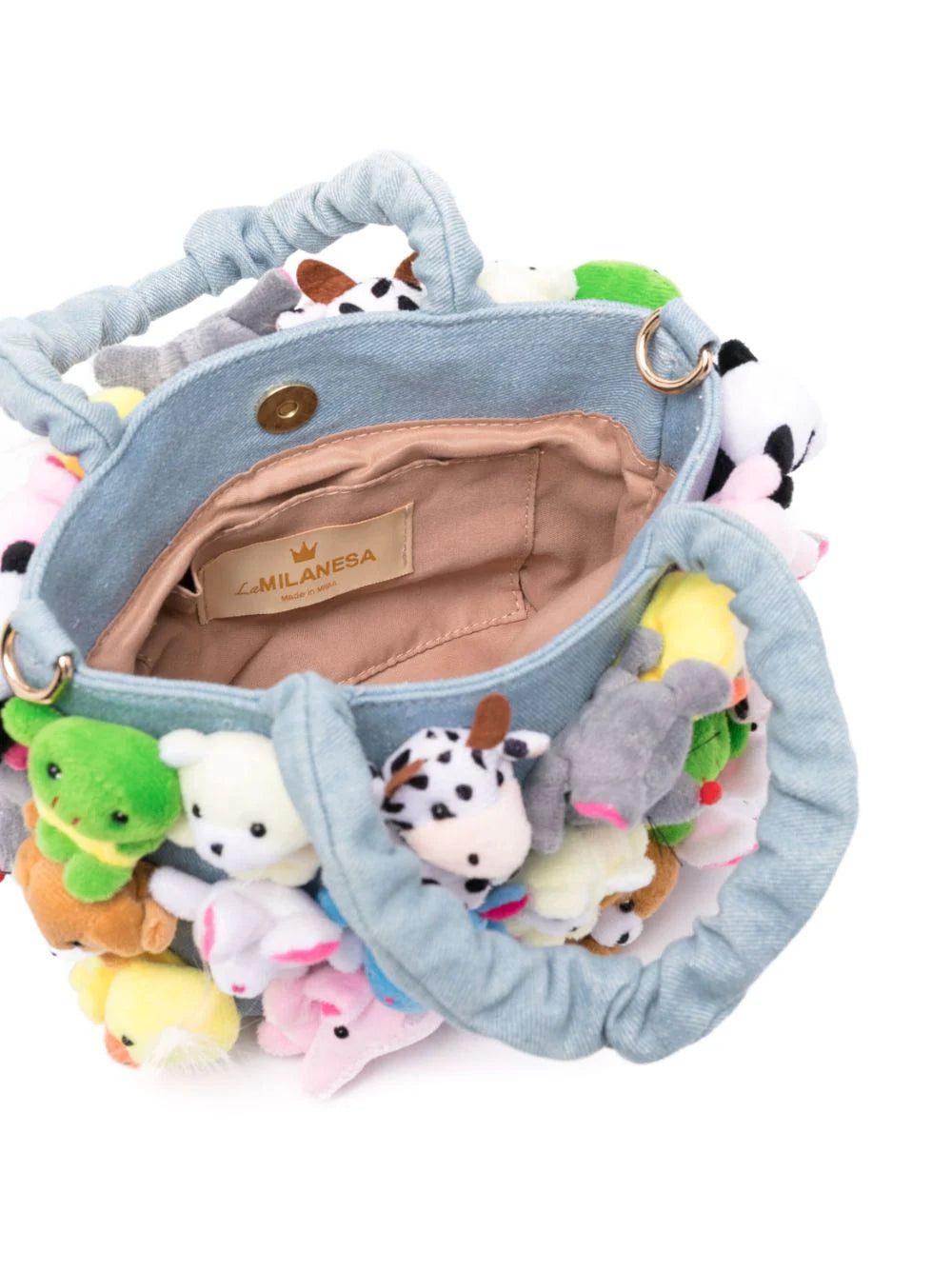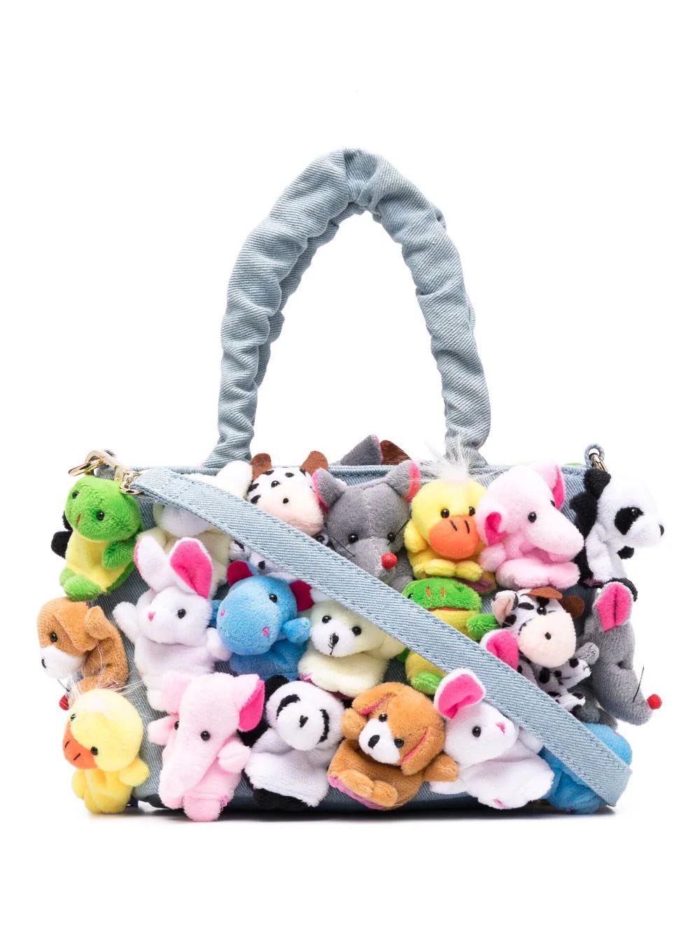 Multicolour cotton Toys denim mini tote from la milanesa featuring detachable shoulder strap, two top handles, concealed magnetic fastening, full lining, logo tag, internal slip pocket and plush toy detailing.