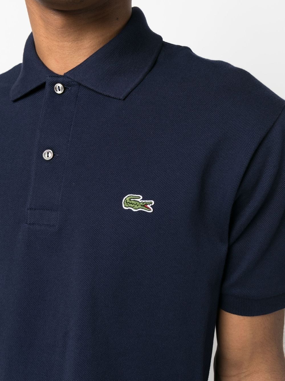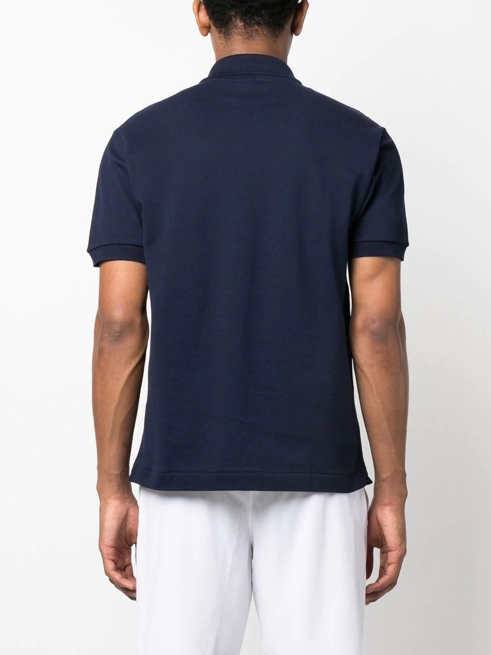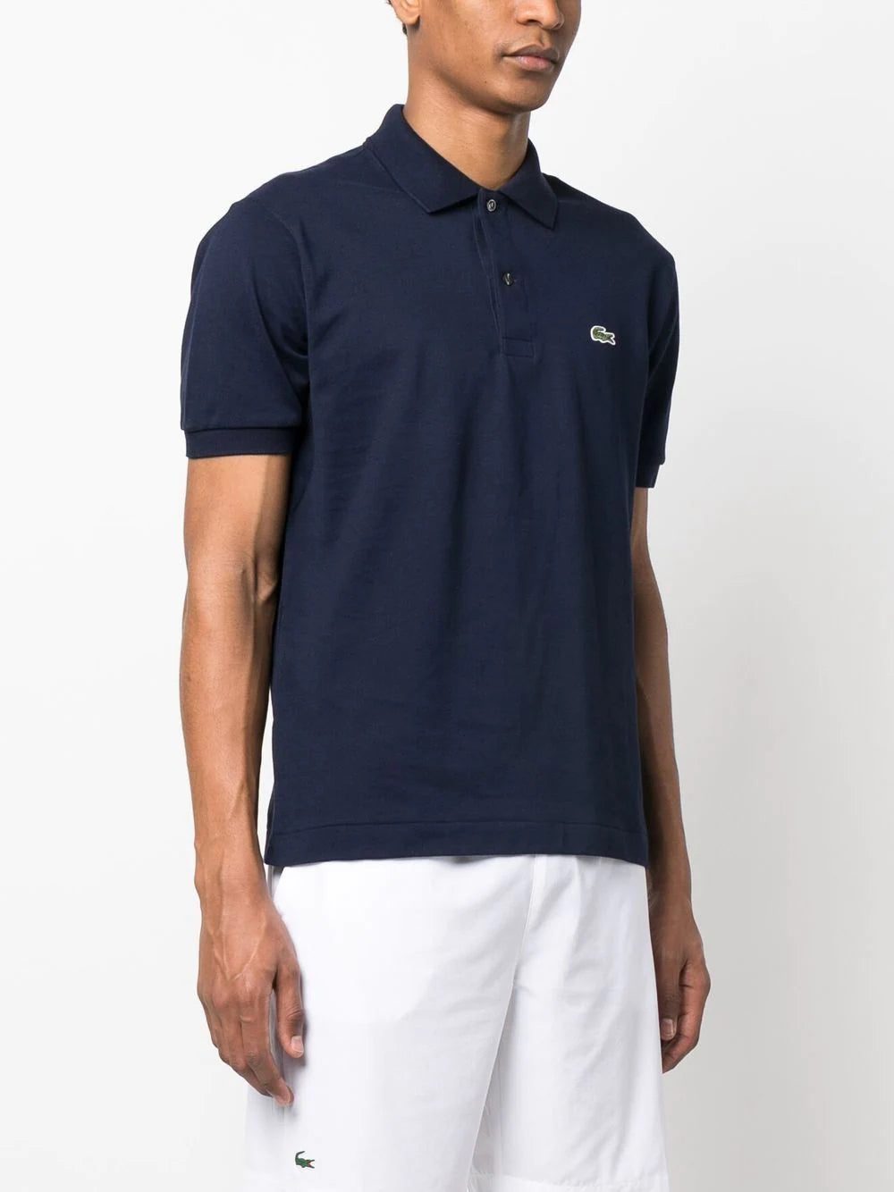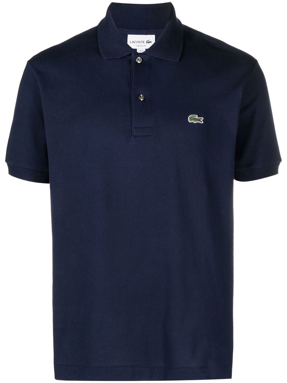cotton short-sleeve polo shirt from LACOSTE featuring navy blue, cotton, logo patch at the chest, polo collar, front button placket, short sleeves and straight hem.