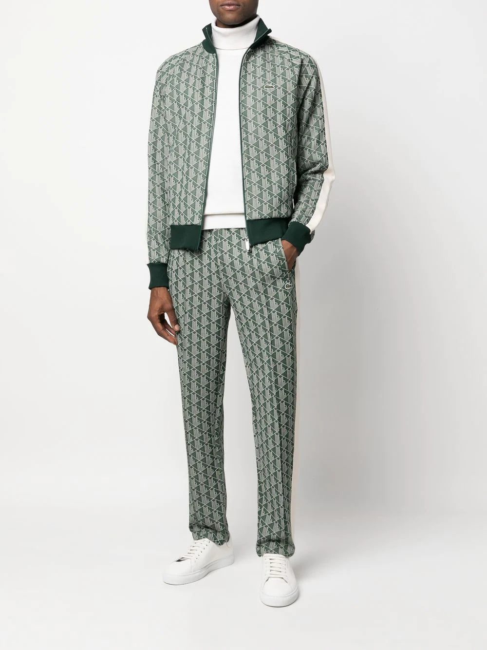 monogram-print track pants from LACOSTE featuring cotton blend, jersey knit, side stripe detailing, monogram pattern, logo patch to the side, elasticated waistband, two side slit pockets, tapered leg and moss green/light beige .
