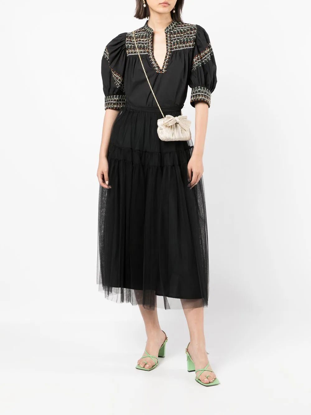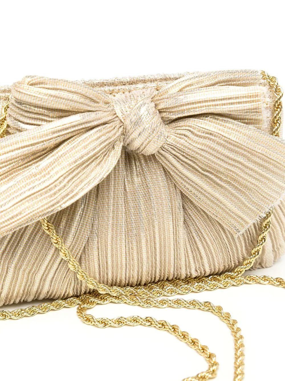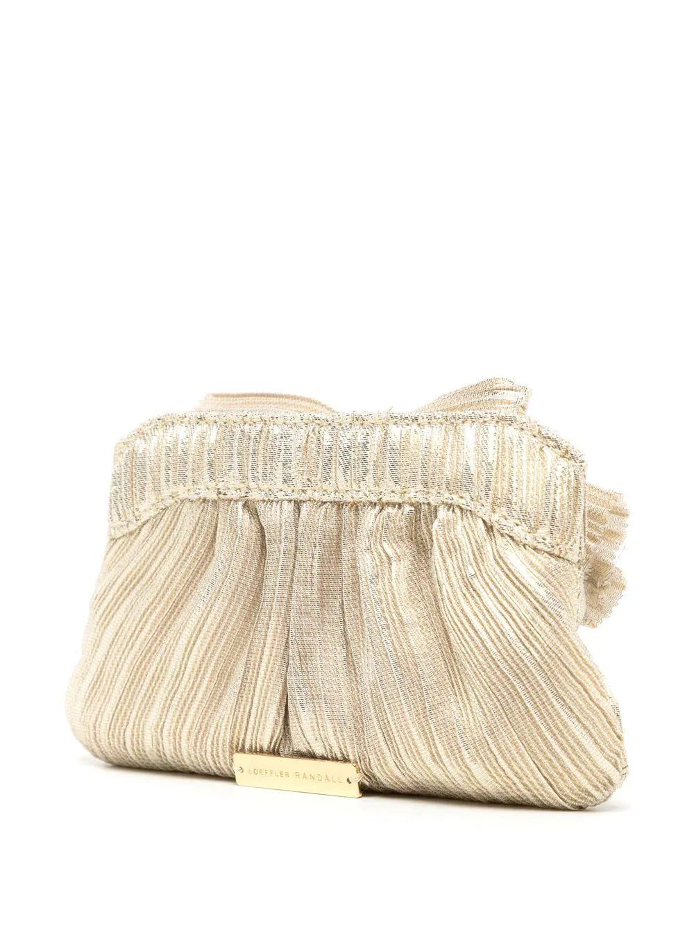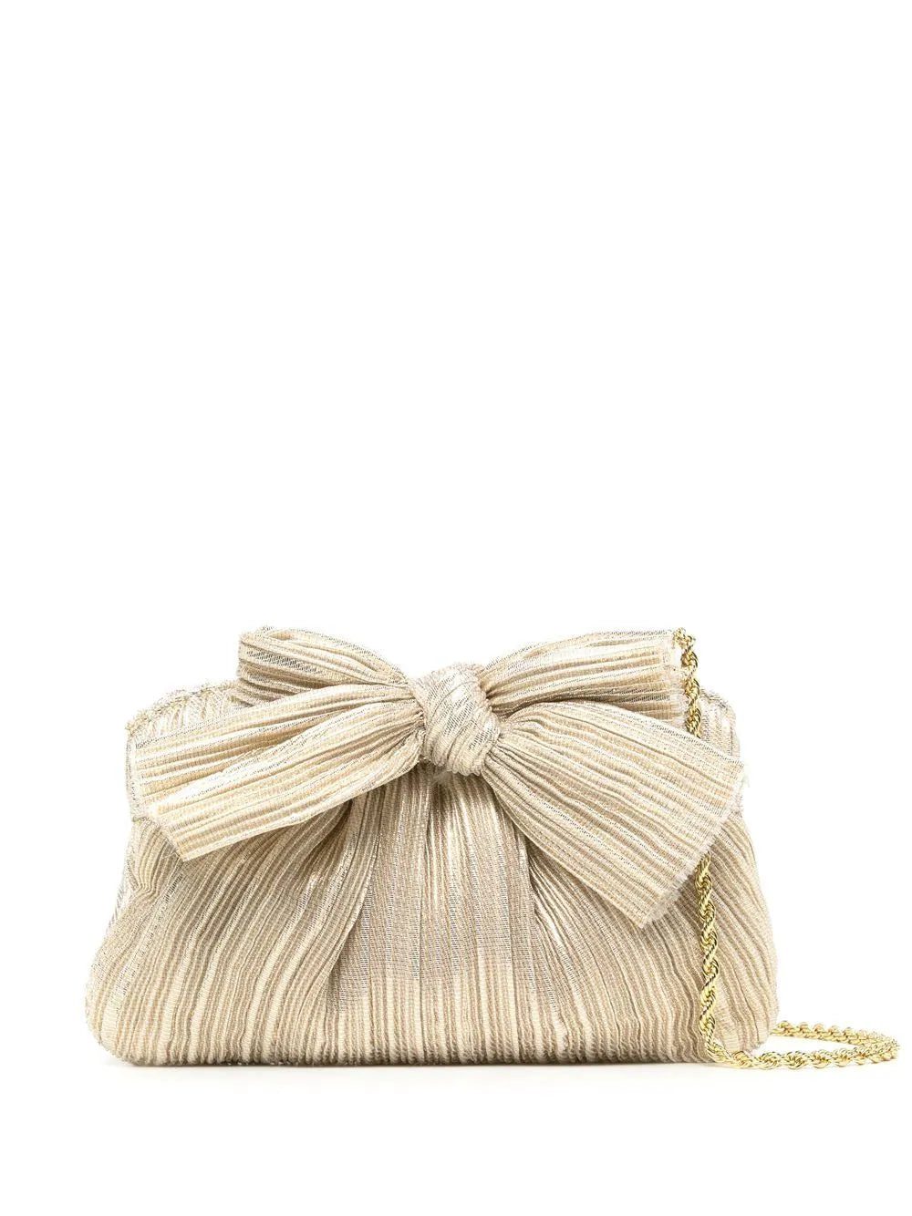 plissé metallic bow crossbody bag from LOEFFLER RANDALL featuring gold-tone, plissé effect, metallic finish, bow detailing, chain-link shoulder strap and gold-tone logo plaque.