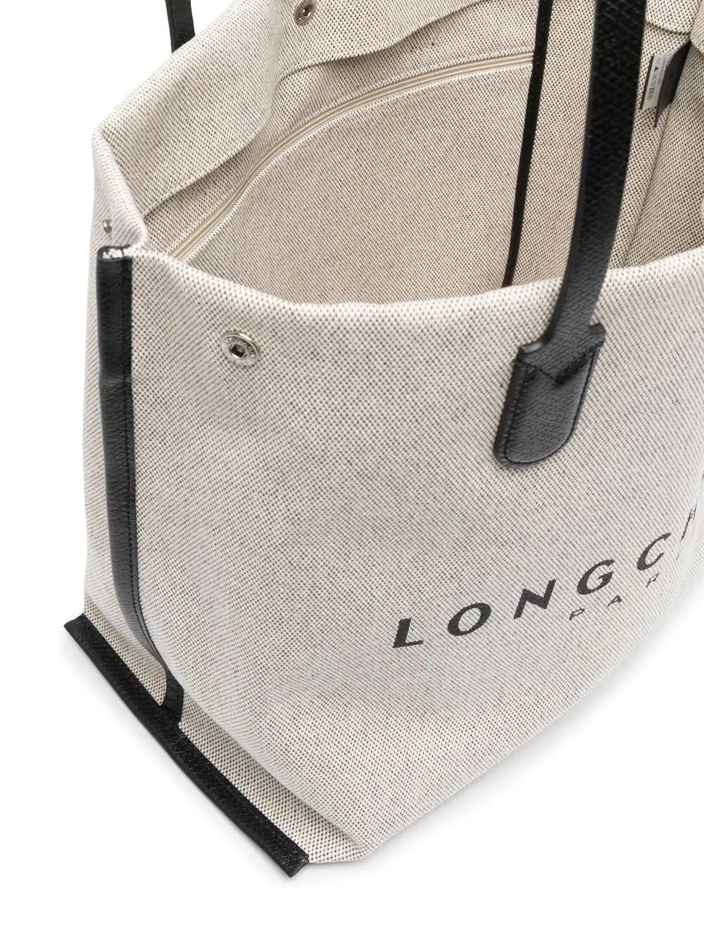 Ecru/black cotton logo-print canvas tote from LONGCHAMP featuring logo print to the front, horse print, leather top handles, main compartment, internal slip pocket and open top.