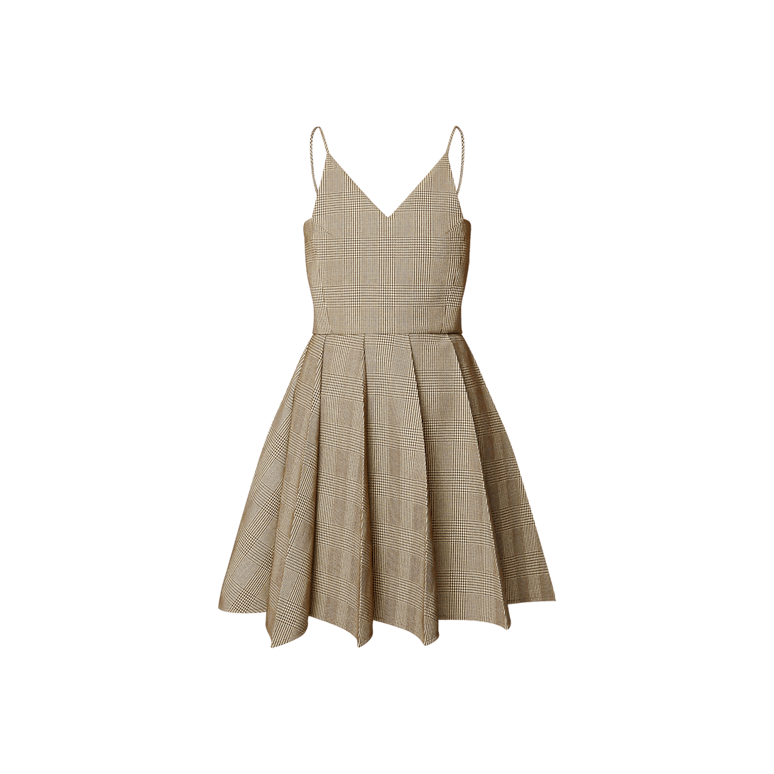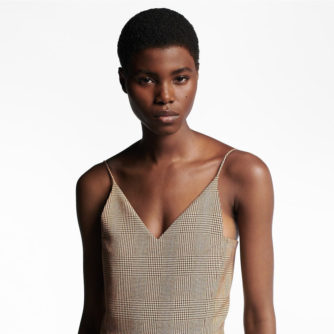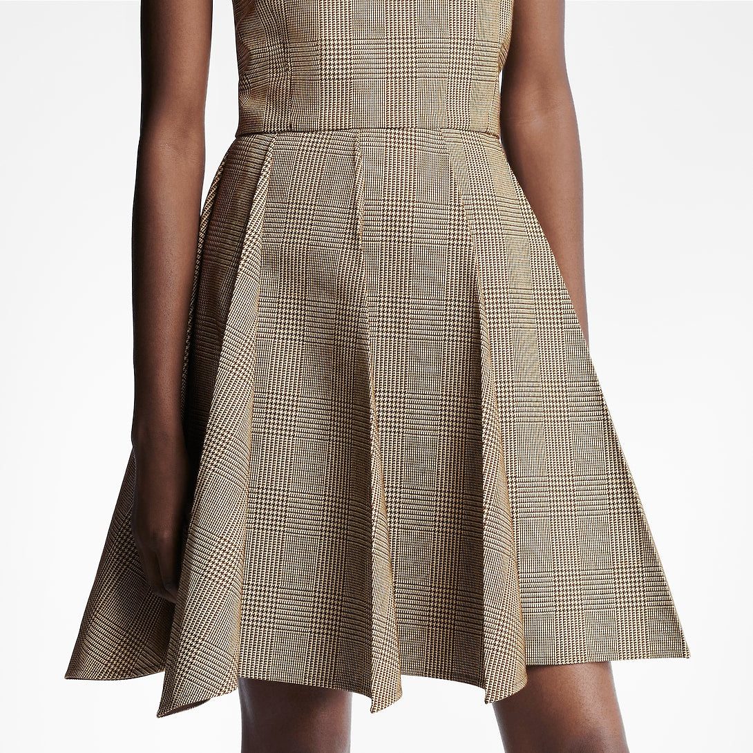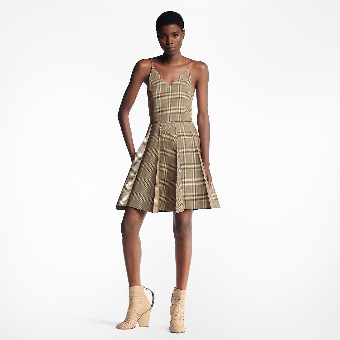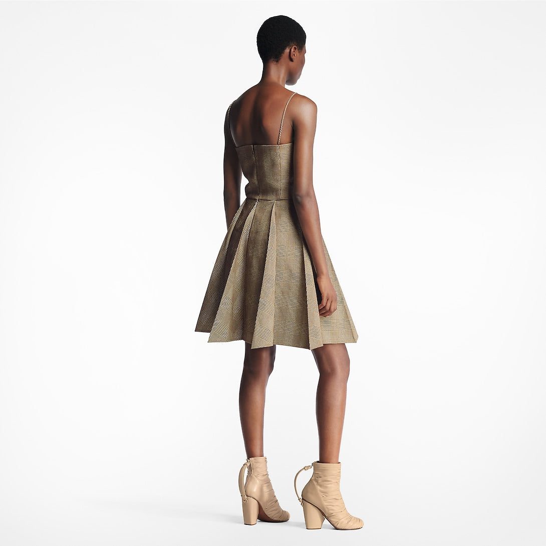 This chic strapless skater dress is revisited in the collection’s signature soft Prince of Wales camel wool for an elegant play of tailoring codes. Meticulously crafted 3D pleats elevate the skirt into a sculptural statement, while a leather LV belt trims the waistline for added definition. Fastened at the back with an exposed zipper.