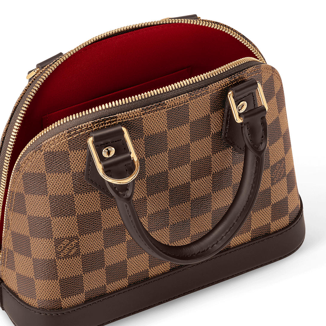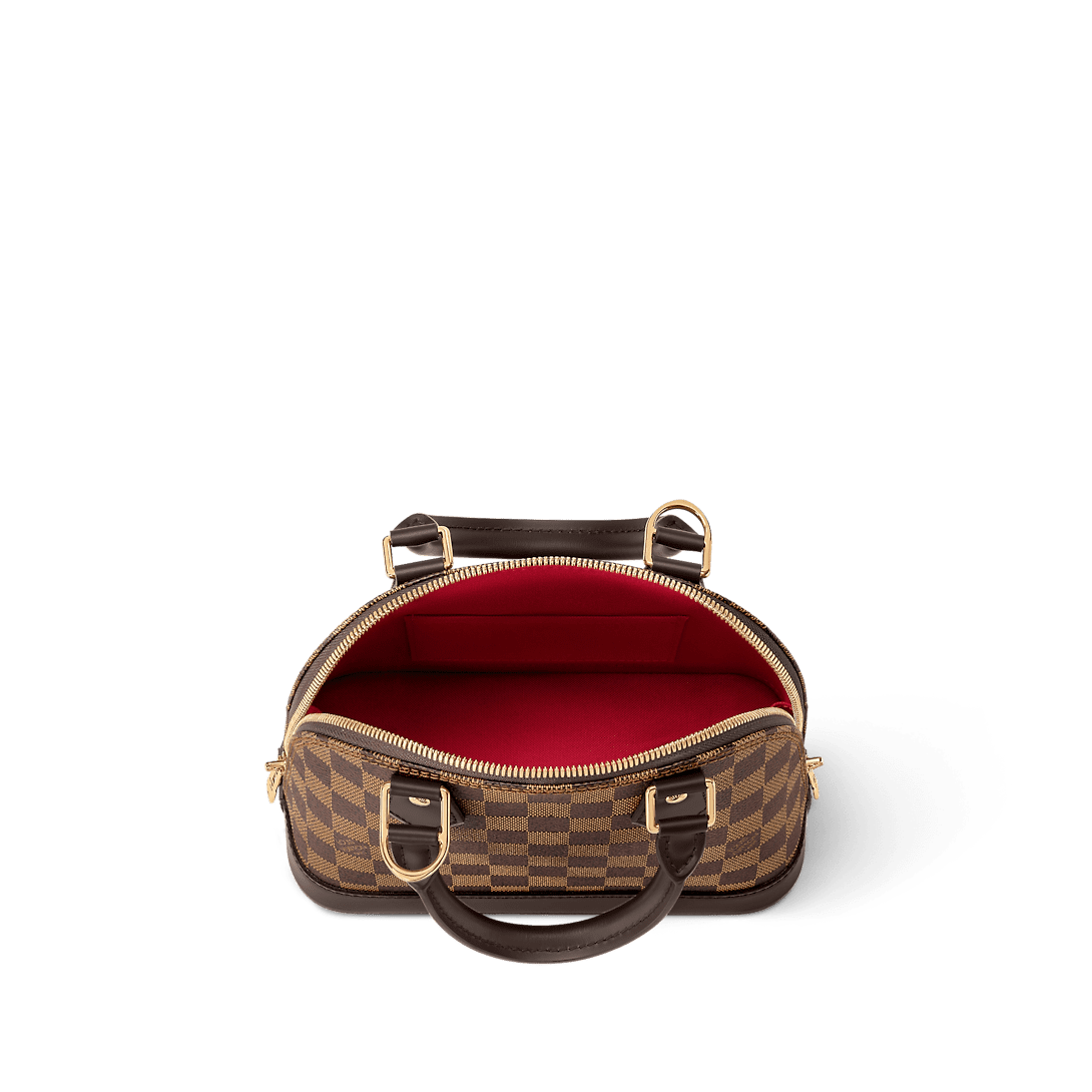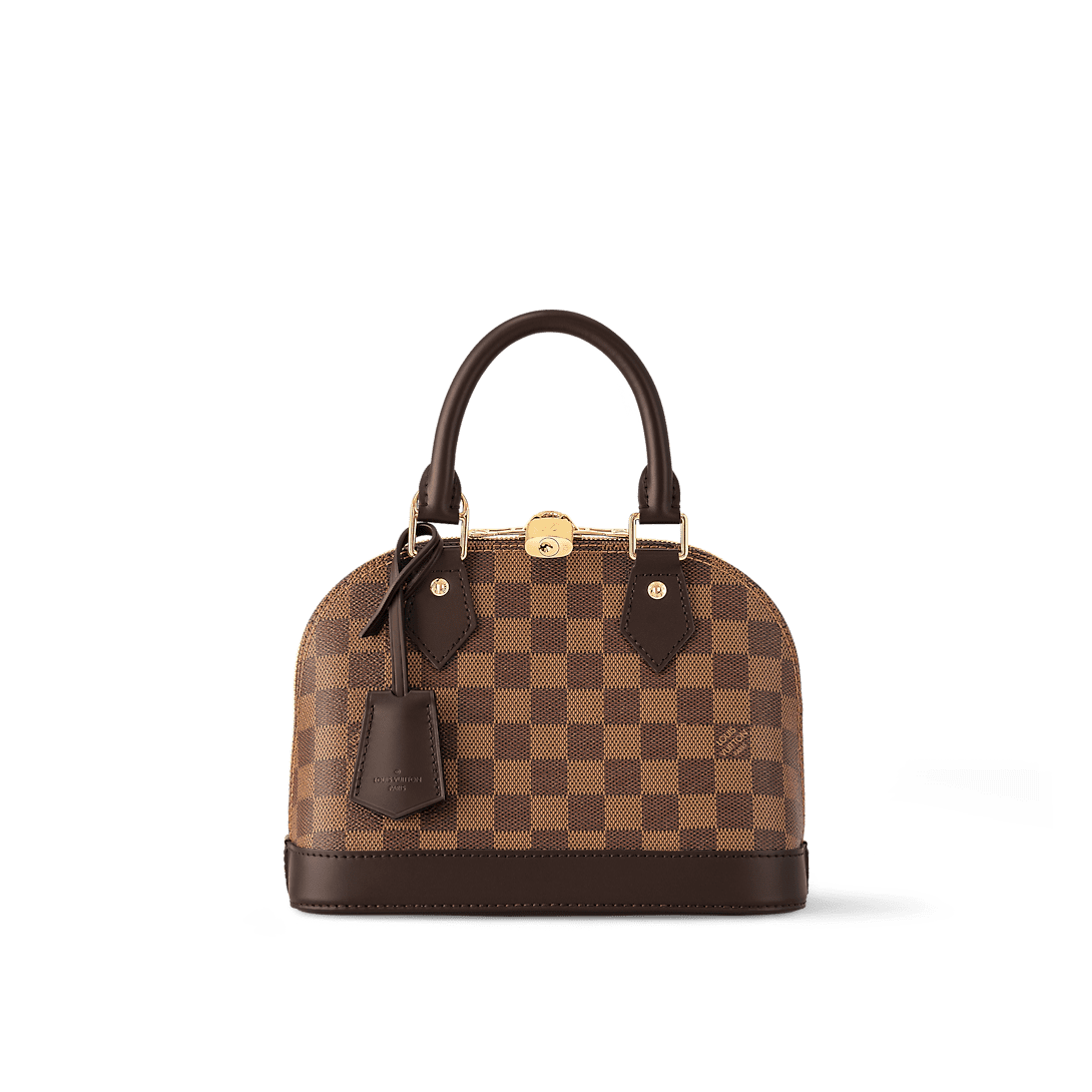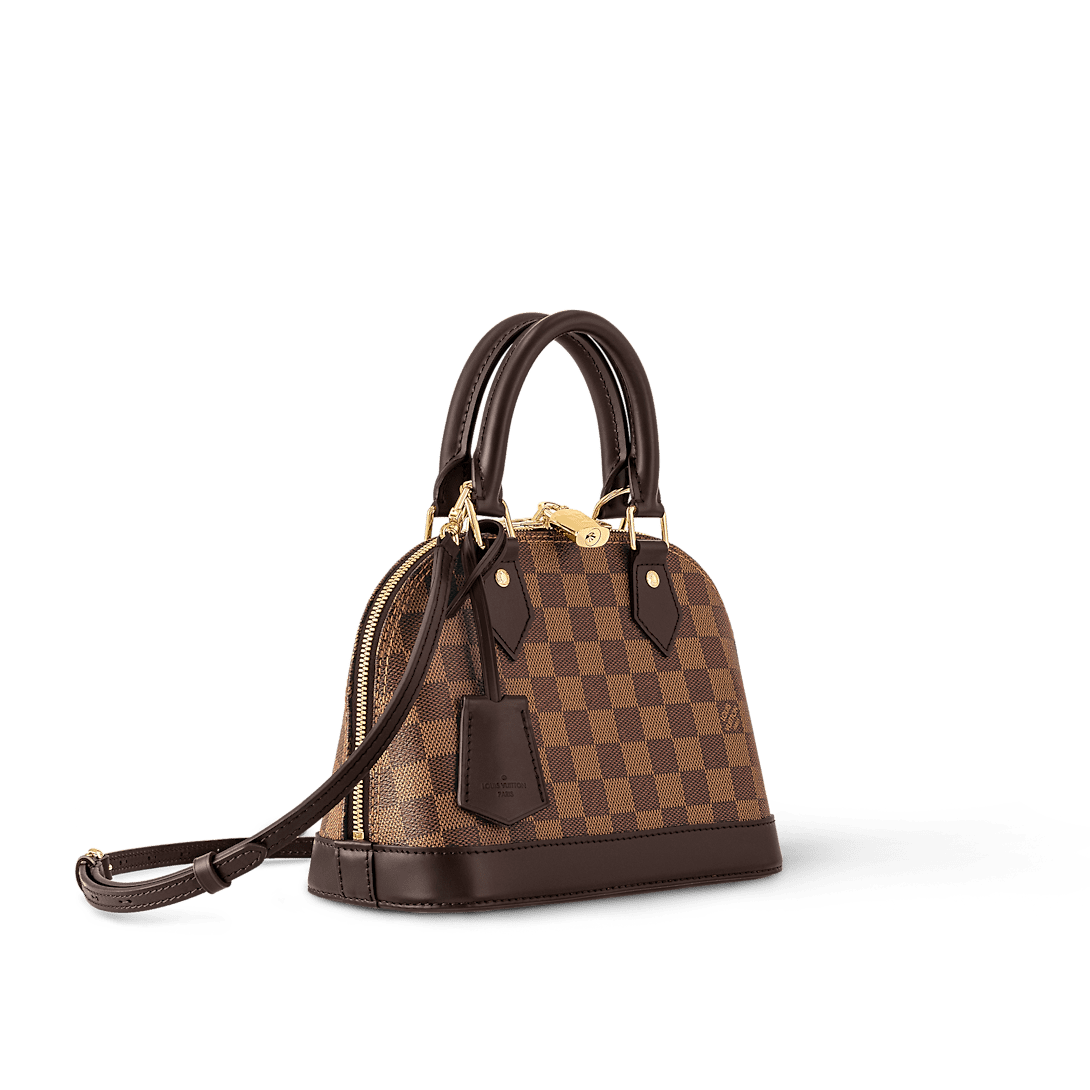 The Alma BB handbag traces its pedigree to the Art Deco original, introduced in 1934. Signature details impart a timeless elegance to this model made from graphic Damier Ebene canvas: note the golden padlock and keys, twin Toron handles and chic leather key bell. Equipped with a removable and adjustable strap, this charming small bag is perfect for cross-body wear.