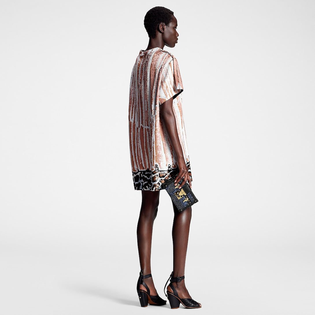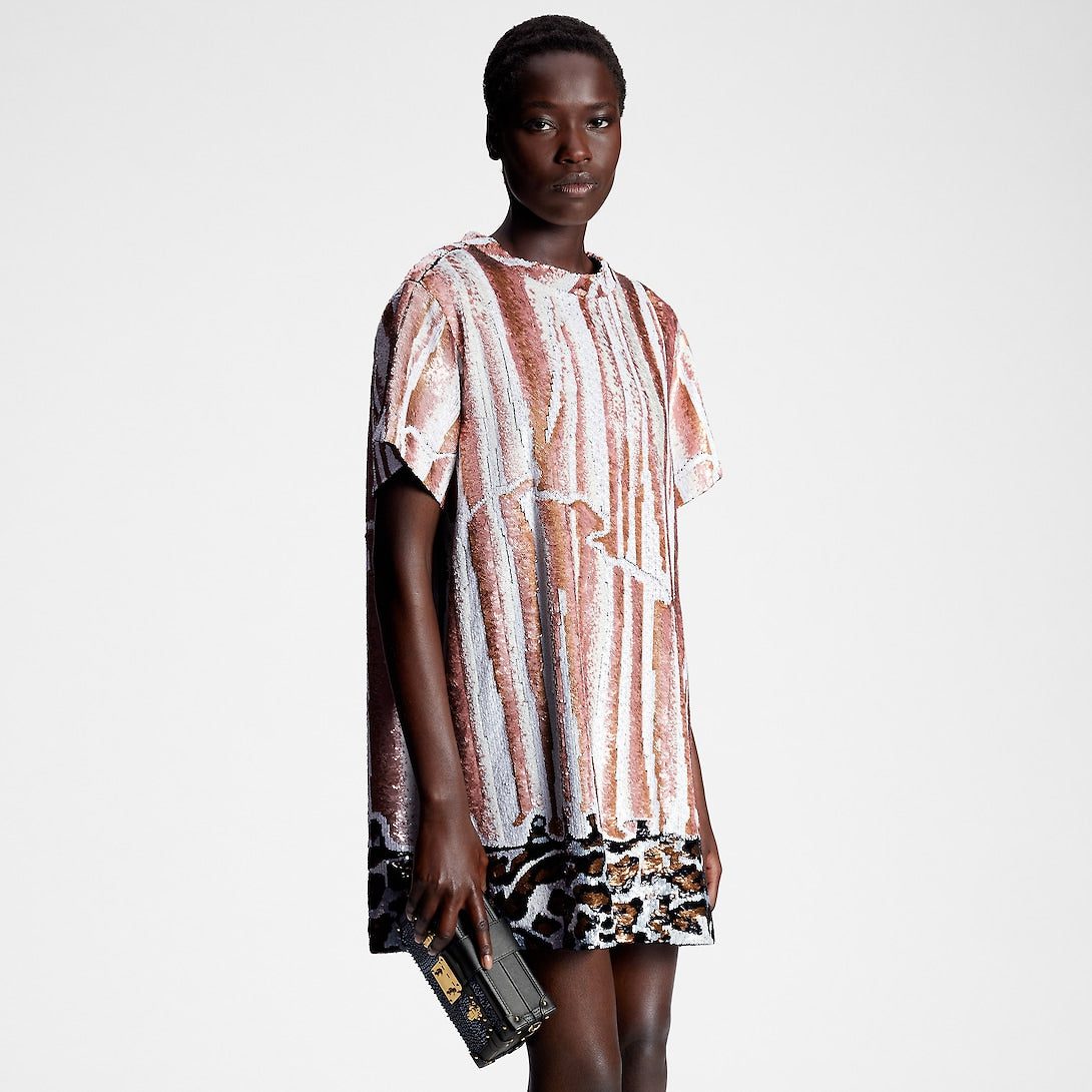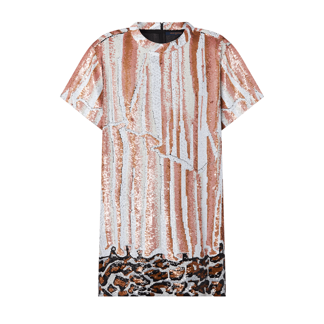 A casual silhouette elevated with a rich seasonal signature: This dress makes a shimmering statement thanks to intricate allover sequin embroidery in an abstract animal motif. Crafted in a classic straight-cut T-shirt shape, the fit is ample for comfortable, versatile styling. Complete with a discreet invisible zipper at the back.