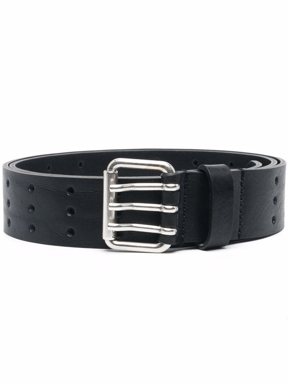 Black calf leather Triple-Pin buckle leather belt from DIESEL featuring silver-tone buckle fastening, pointed tip, punched holes and adjustable fit.