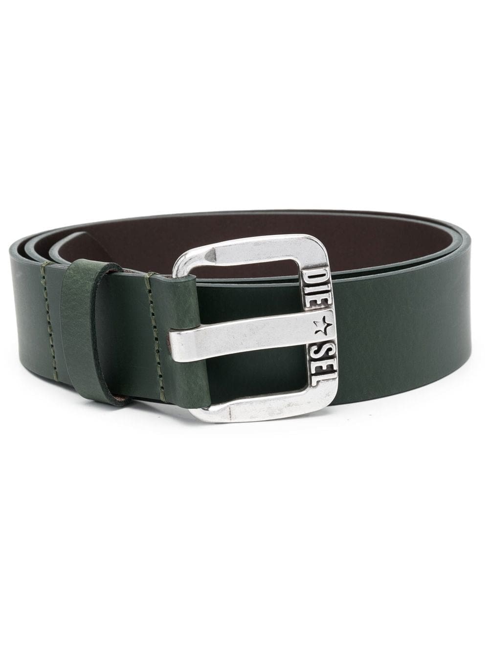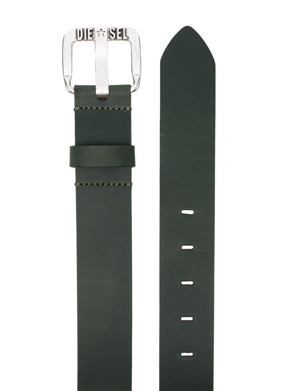 logo-buckle buffalo leather belt from DIESEL featuring green, logo-buckle fastening, silver-tone hardware, pointed tip, punched holes, adjustable fit and buffalo leather.
