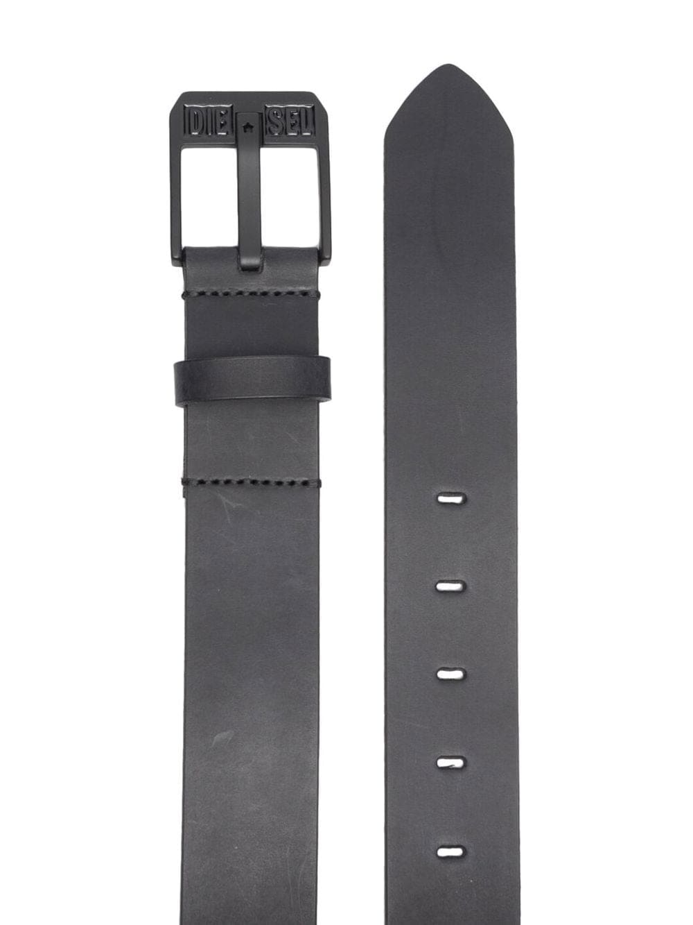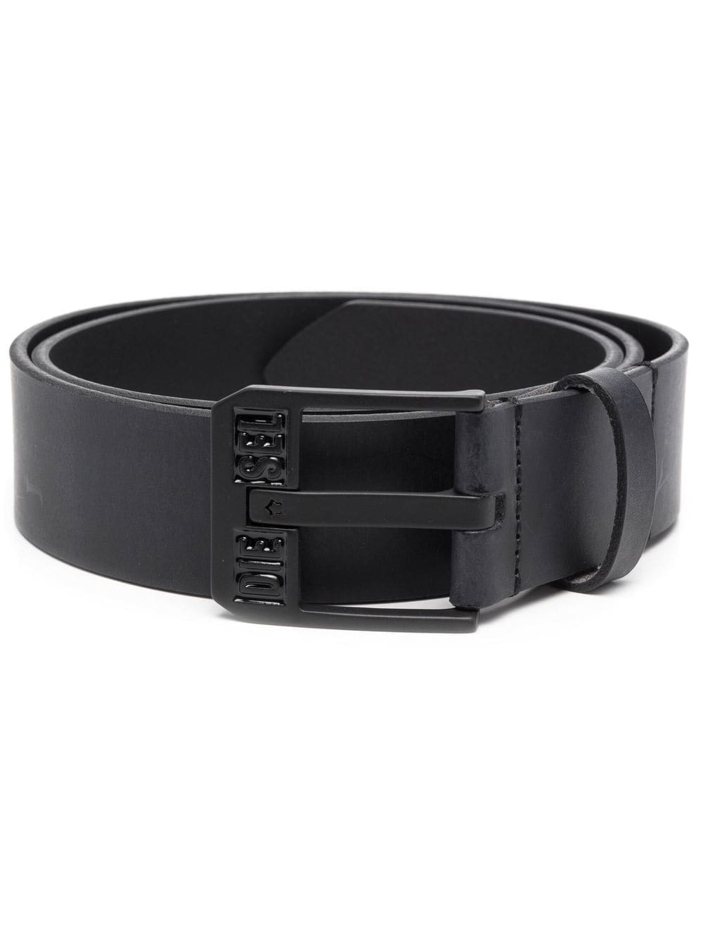 Black leather metal logo belt from Emporio Armani featuring a metal logo plaque and five belt holes.
