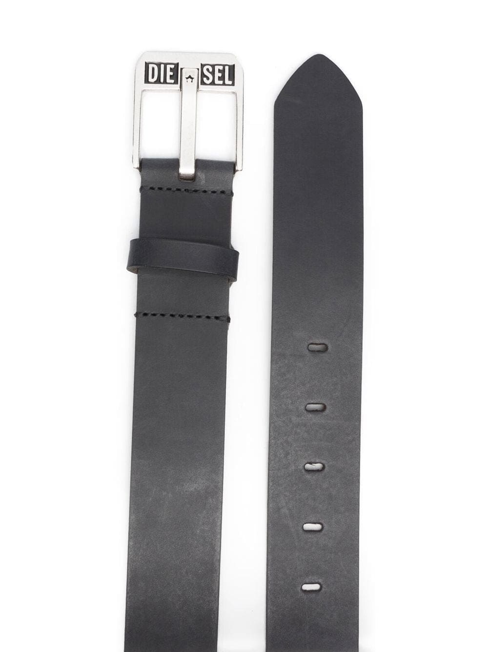logo-buckle buffalo leather belt from DIESEL featuring black, logo-buckle fastening, silver-tone hardware, pointed tip, punched holes, adjustable fit and buffalo leather.