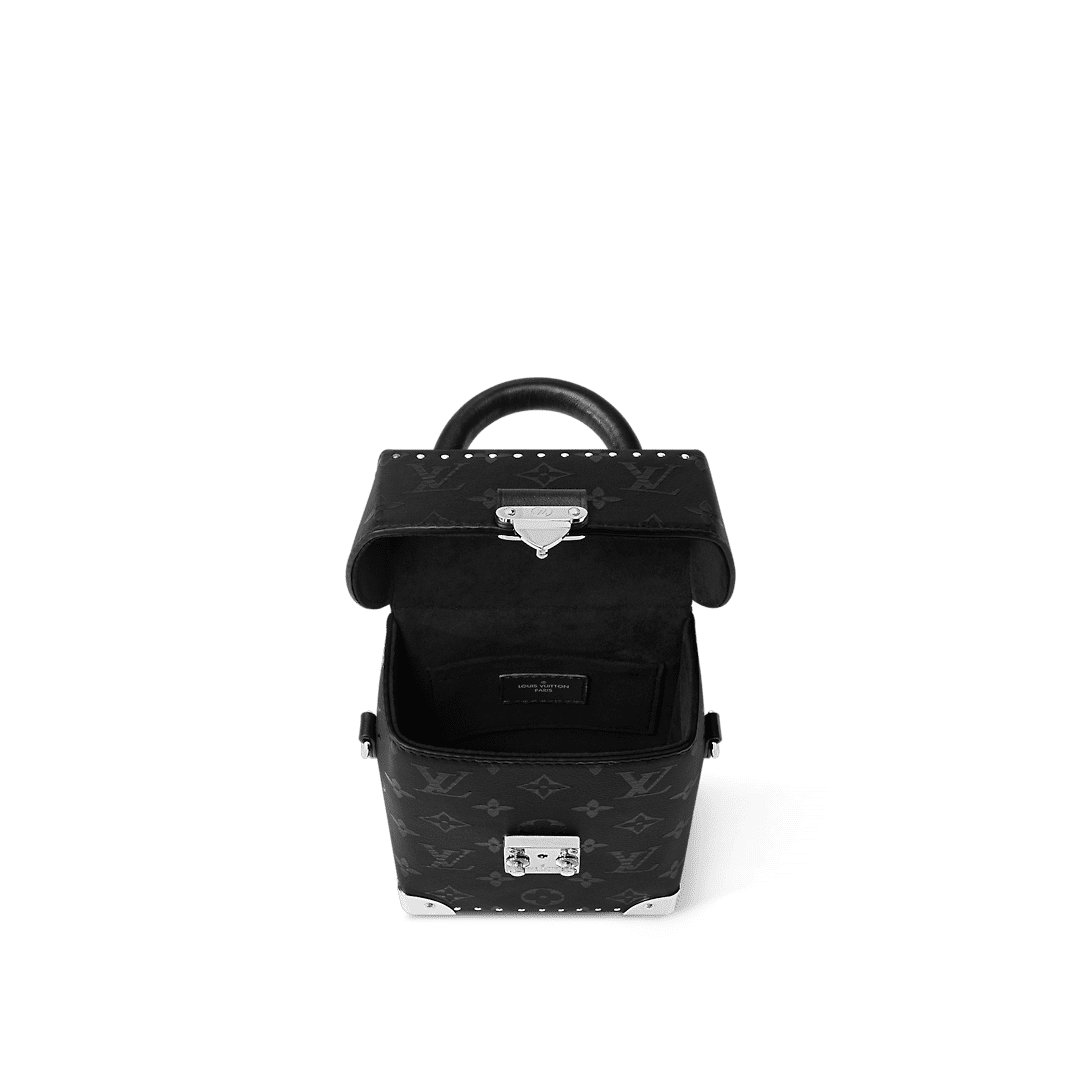 Nicolas Ghesquière’s distinctive Camera Box handbag is made from smooth calfskin, with a black Monogram print. The silver-color, gothic-inspired chain is made of Monogram Flower links, the blossoms reimagined with a rock-and-roll edge. In addition to the chain, there’s an articulated top handle and a detachable and adjustable leather strap.