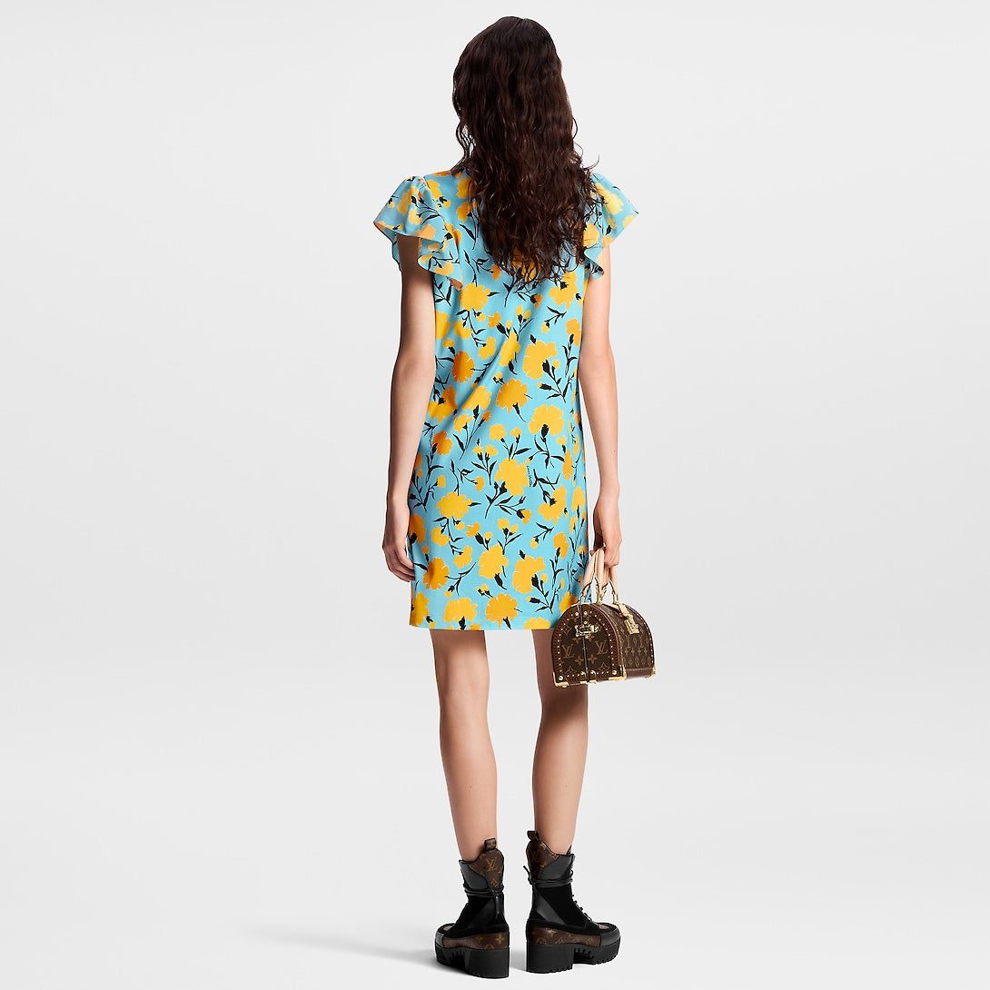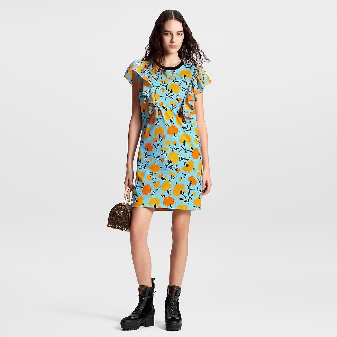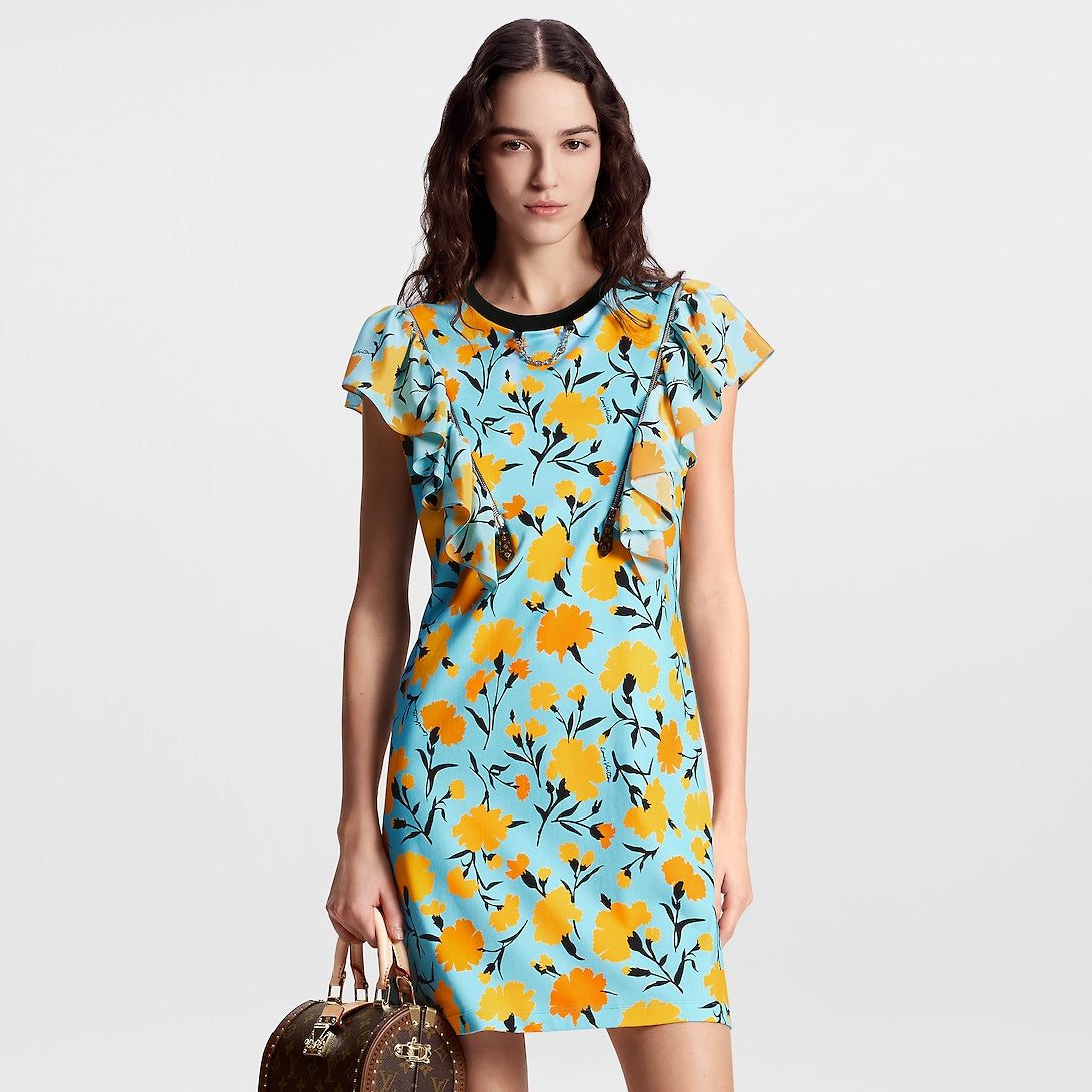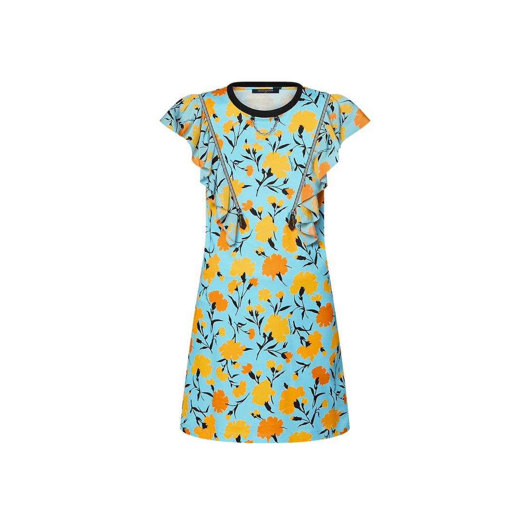 This cotton jersey T-shirt dress has fresh, summery appeal in this season’s upbeat carnation print. The casual silhouette is uplifted with fluid flounce details, which can also be removed thanks to exposed zippers trimmed with Monogram pulls. Complete with a contrasting crew neckline and a chic LV chain detail for a contemporary House touch.