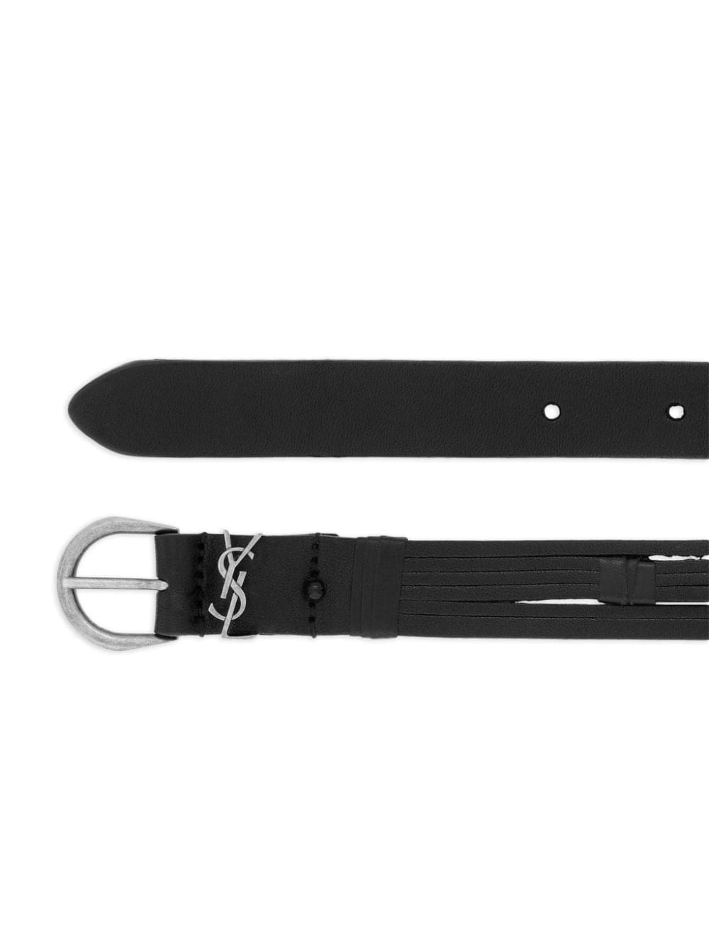 An unmistakable insignia of the maison, the Cassandre logo plaque decorates this thin calf leather belt from Saint Laurent's SS23 collection for a trademark touch.