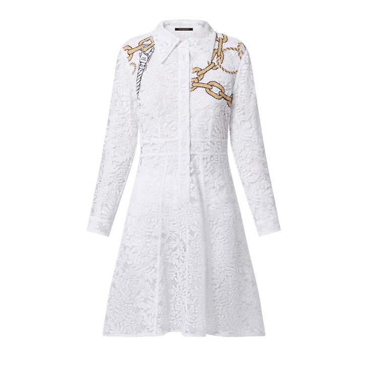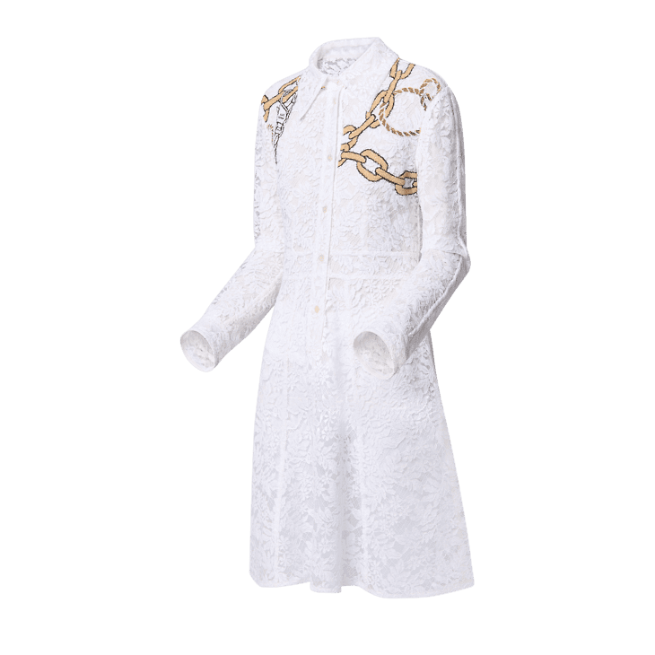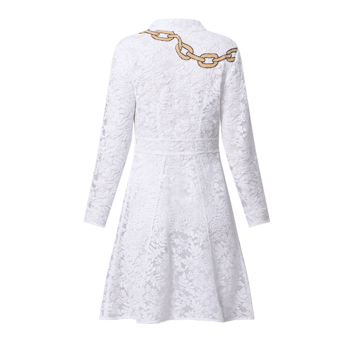 This shirt dress has a romantic, preppy look in crisp white floral lace detailed with this season’s chain motif around the shoulders for a contemporary nautical touch. The smart button-down silhouette is tailored with a pointed collar and discreet tapering around the waist to accentuate a feminine figure. Complete with a removable tone-on-tone lining.