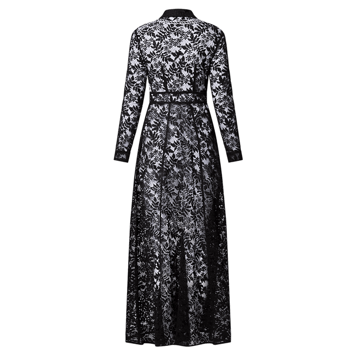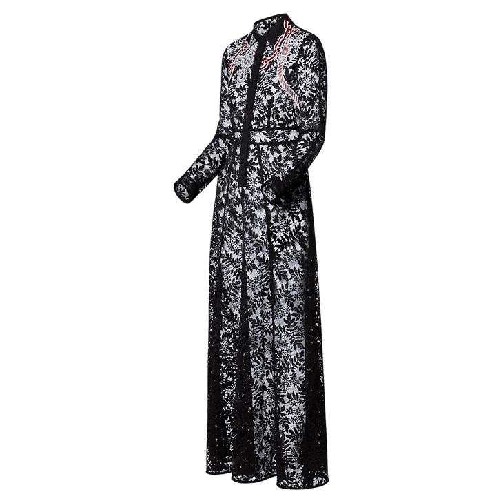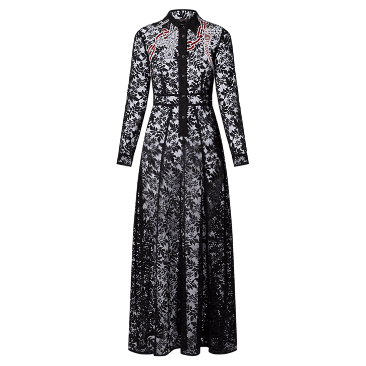 This shirt dress makes an elegant statement in delicate black floral lace tailored in a floor-length silhouette with a smart pointed collar, button-down front and tapered waistline. A chain motif in bold red and orange tones adds a contemporary nautical detail to the shoulders, while a removable lining completes the romantic silhouette.