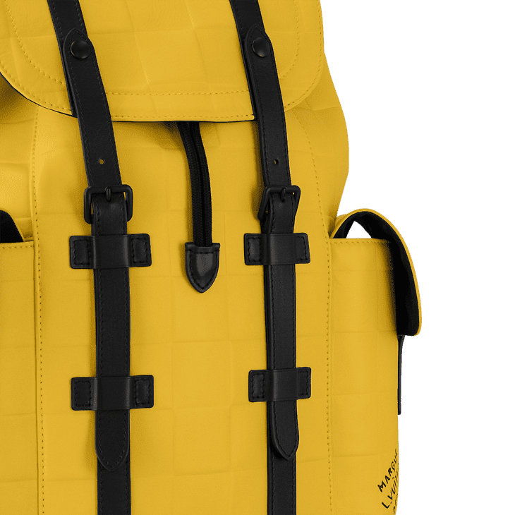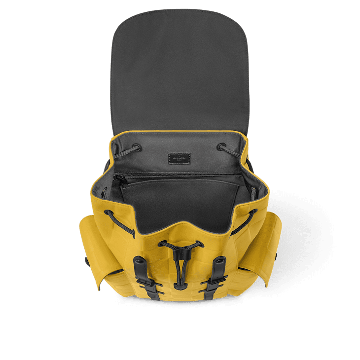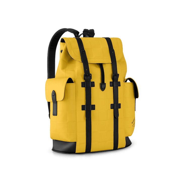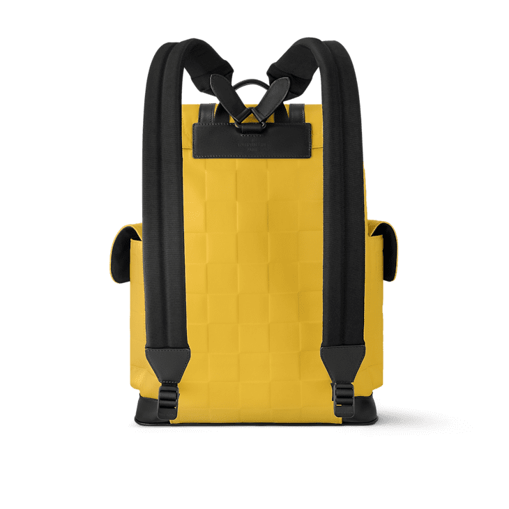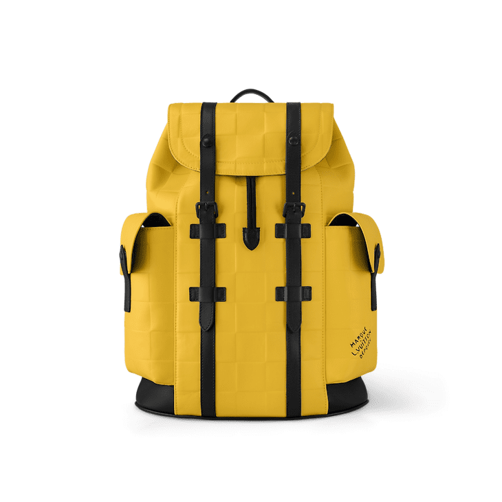 The Christopher MM backpack looks stunning in Pharrell Williams’ neoprene-yellow Damier Scuba calfskin leather, the perfect touch of vibrant color for a muted world. The black-leather trim and black-color hardware highlight the oversized Damier embossing. The Christopher’s classic rucksack design includes two roomy side pockets and snap and drawstring closure.