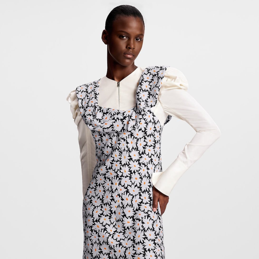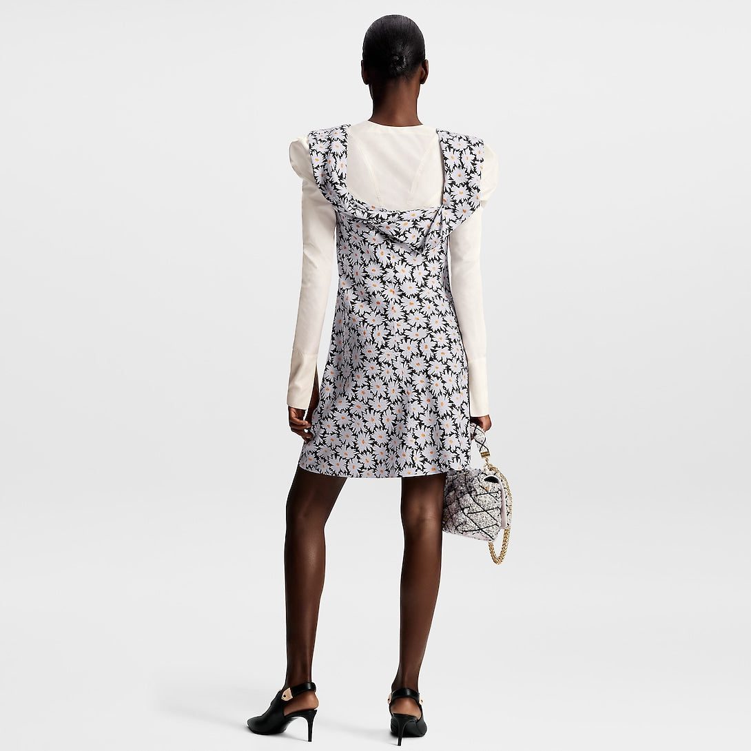 A play of bold seasonal signatures elevates this mini dress with a modern, feminine feel: Crafted from fluid silk in an artistic free-hand daisy print, the silhouette skims the figure with a tapered waistline before flaring out at the hem for an airy finish, while the shoulders, chest and back are highlighted with this season’s directional twisted insert.