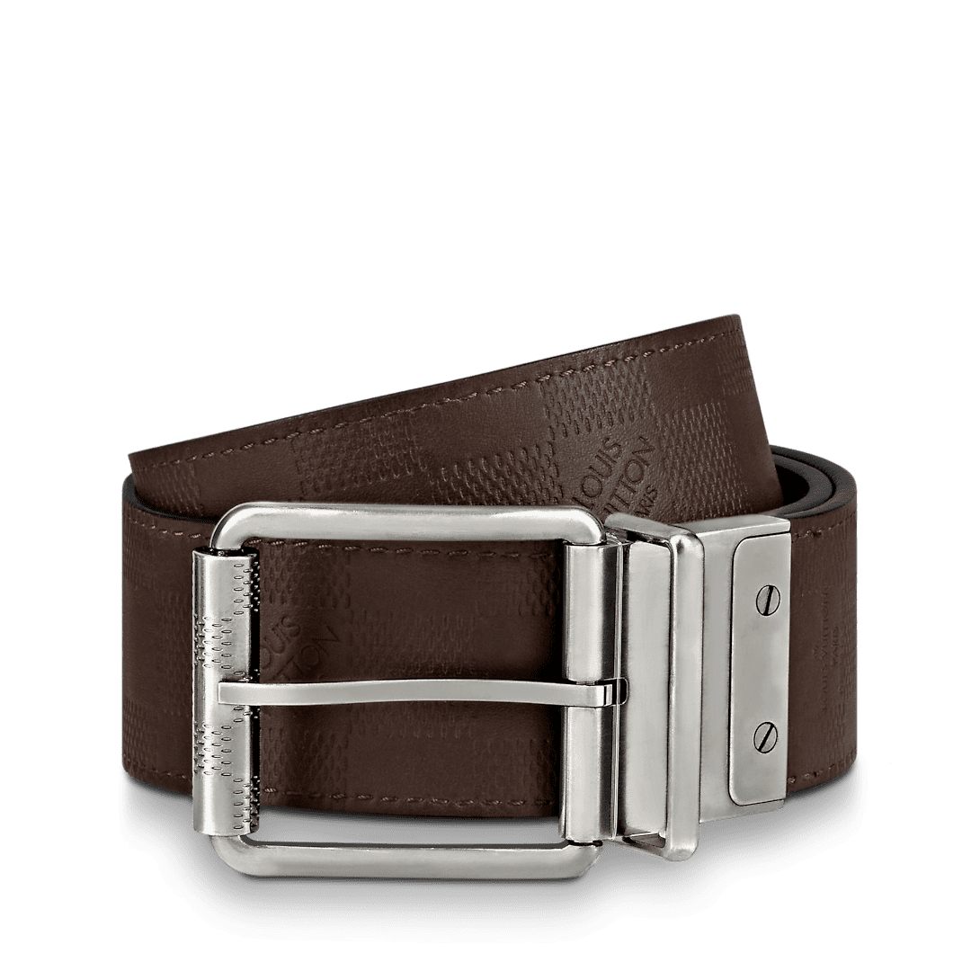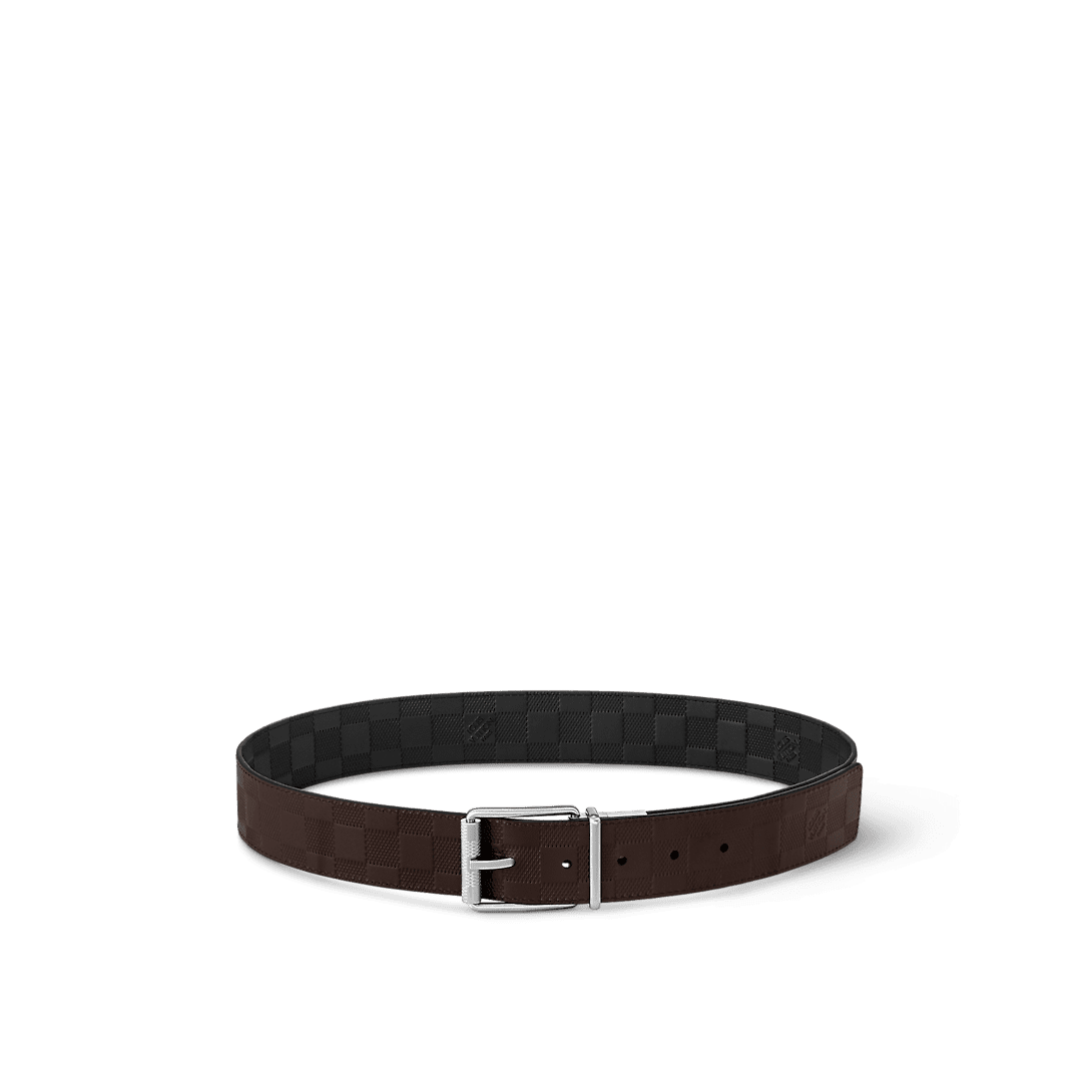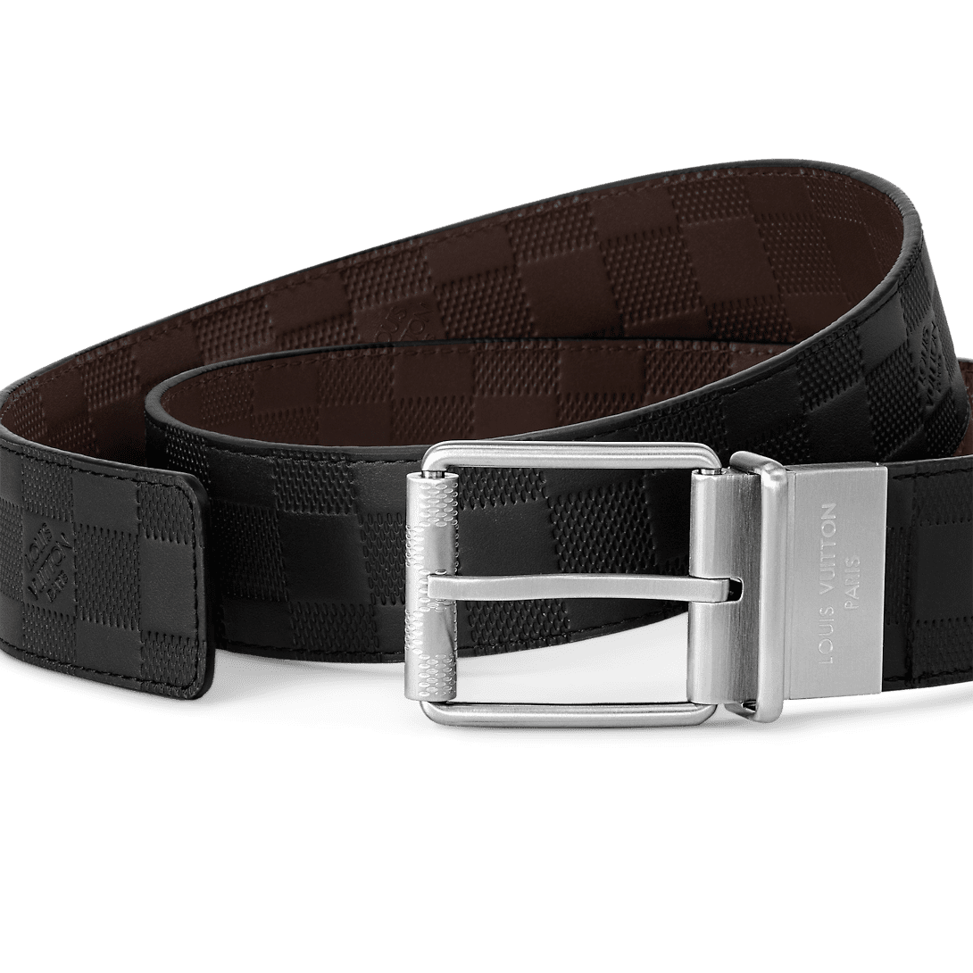 Exceptional Louis Vuitton craftsmanship marks the Iconic Damier Infini signature. Damier engraved metal highlights the rolling belt buckle of this reversible style.