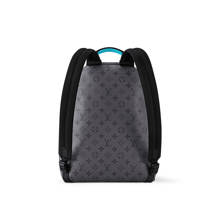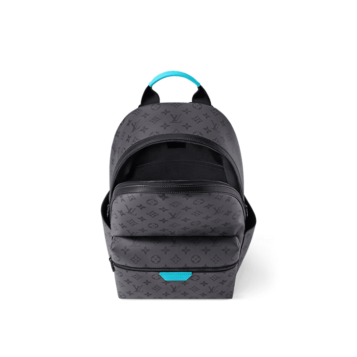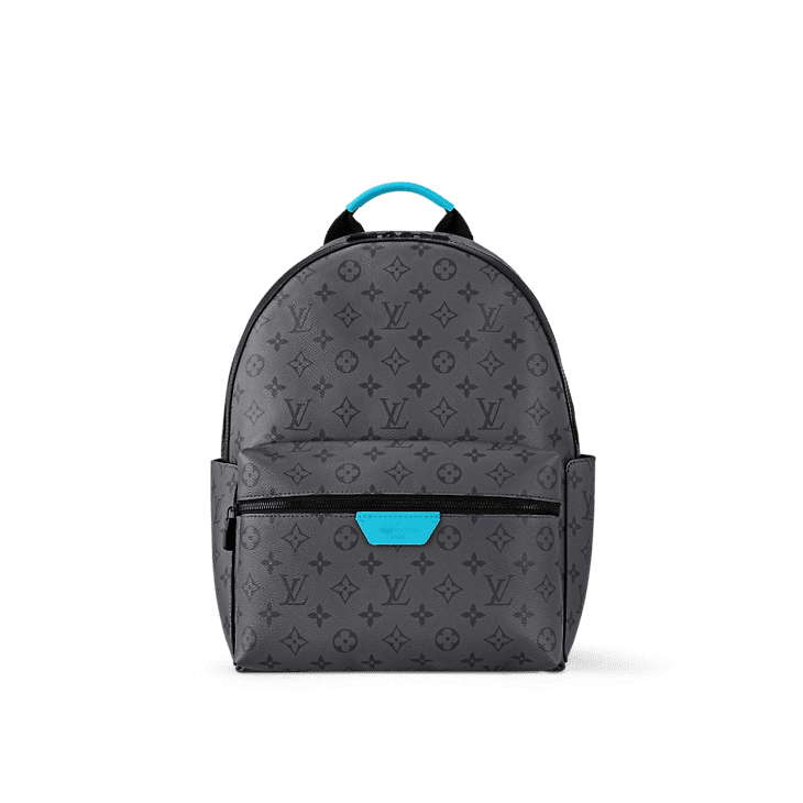 The Discovery Backpack PM is made from Monogram Eclipse Reverse canvas with its black-and-gray Monogram. The motif is livened up with turquoise on the leather label on the front pocket, around the zipper, and on the top handle. Its zipped front pocket and two open side pockets make this is a great everyday bag.
