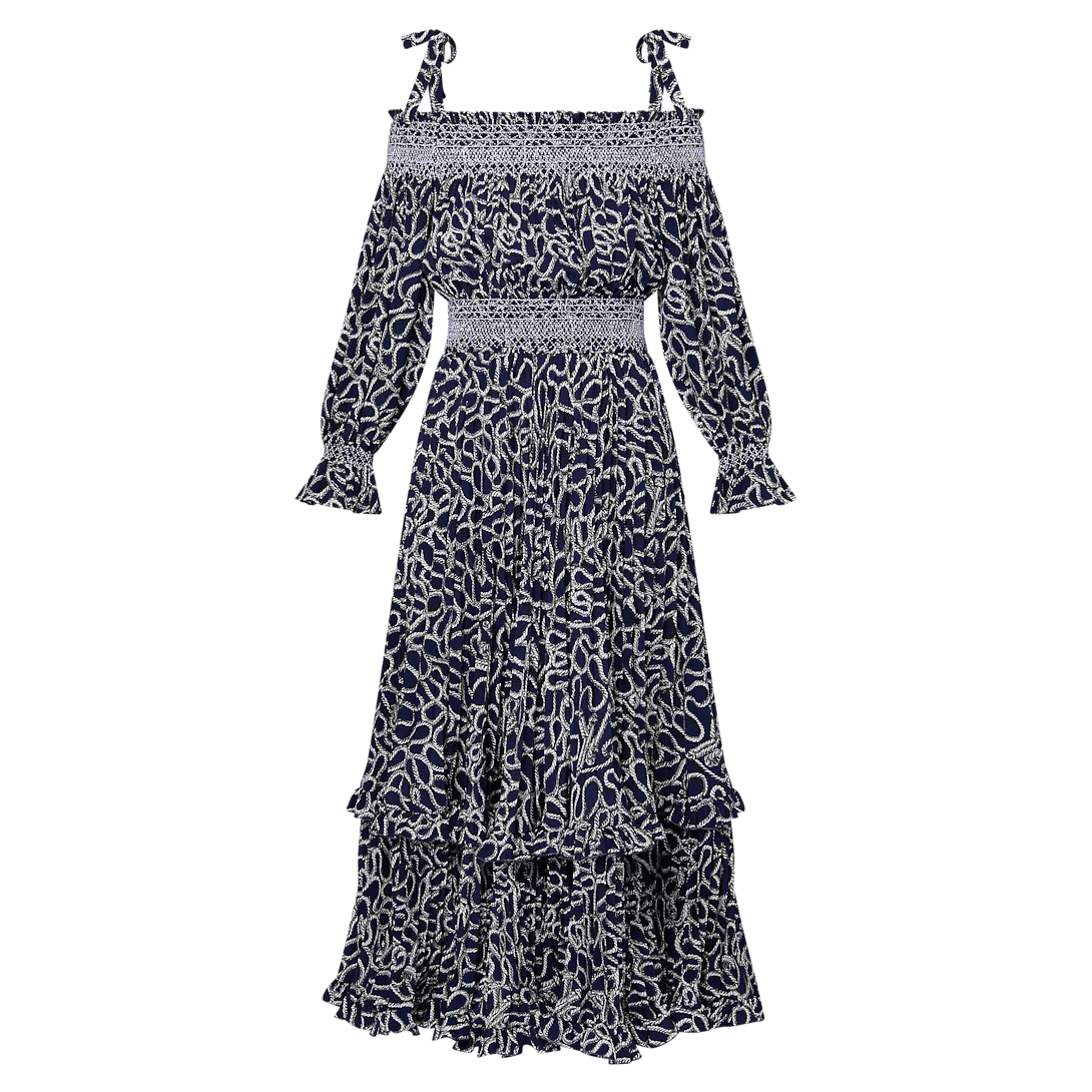 This dress is effortlessly airy in fluid silk crepe de chine. Gathering introduces volume to the long-sleeved top, while the tiered skirt is pleated to add graceful movement to the full-length silhouette. The shoulders, waist and cuffs are trimmed with embroidered bands for an elegant yet graphic touch. Fastened at the back with an exposed zipper.