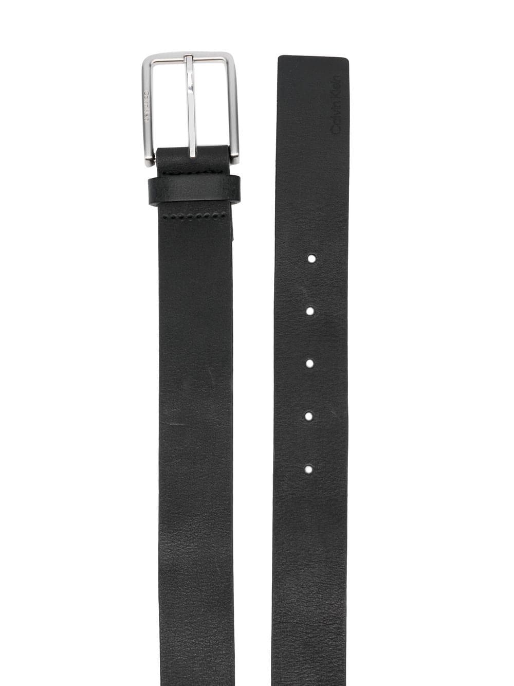 jet black calf leather silver-tone hardware silver-tone buckle fastening engraved logo punched holes adjustable fit