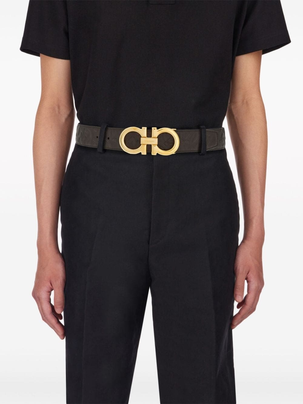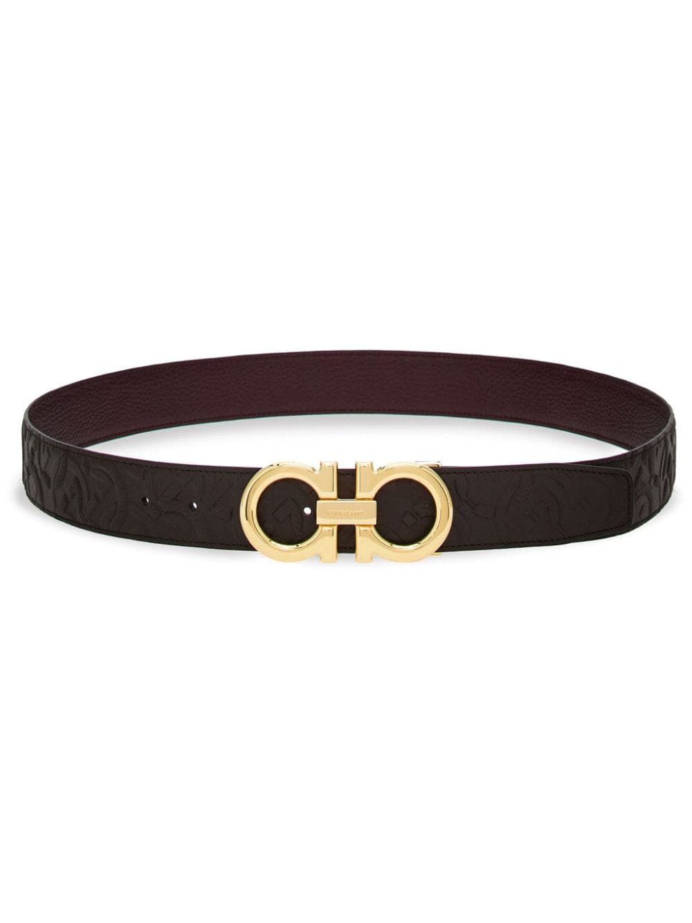Inspired by the motifs found in Ferragamo's house gate in Florence, the Gancini has become synonymous with tradition, heritage and artisanship. It adorns the smooth calfskin design of this reversible calfskin belt, made in Italy in a black and brown colourway.