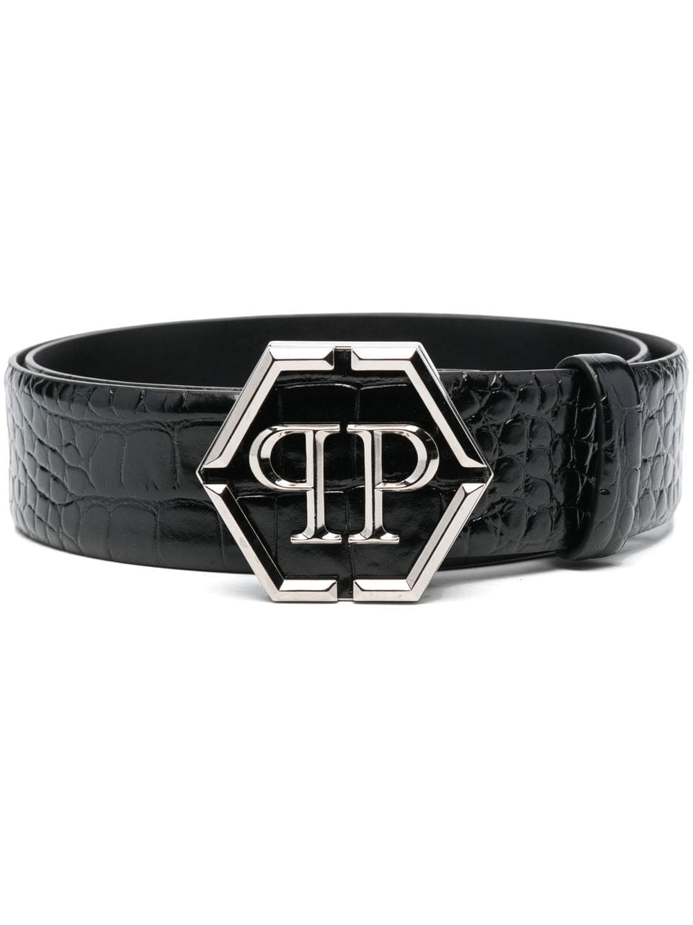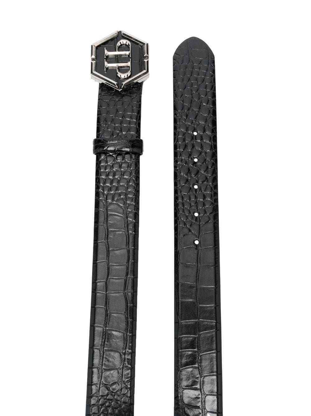 black calf leather embossed crocodile effect logo-buckle detail punched holes adjustable fit