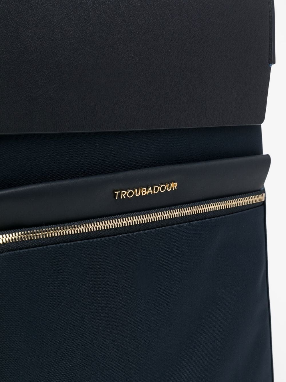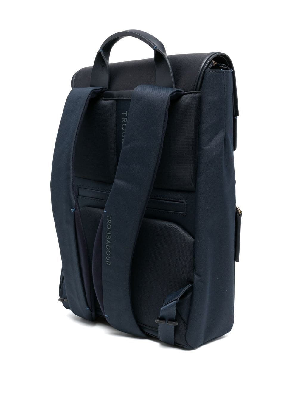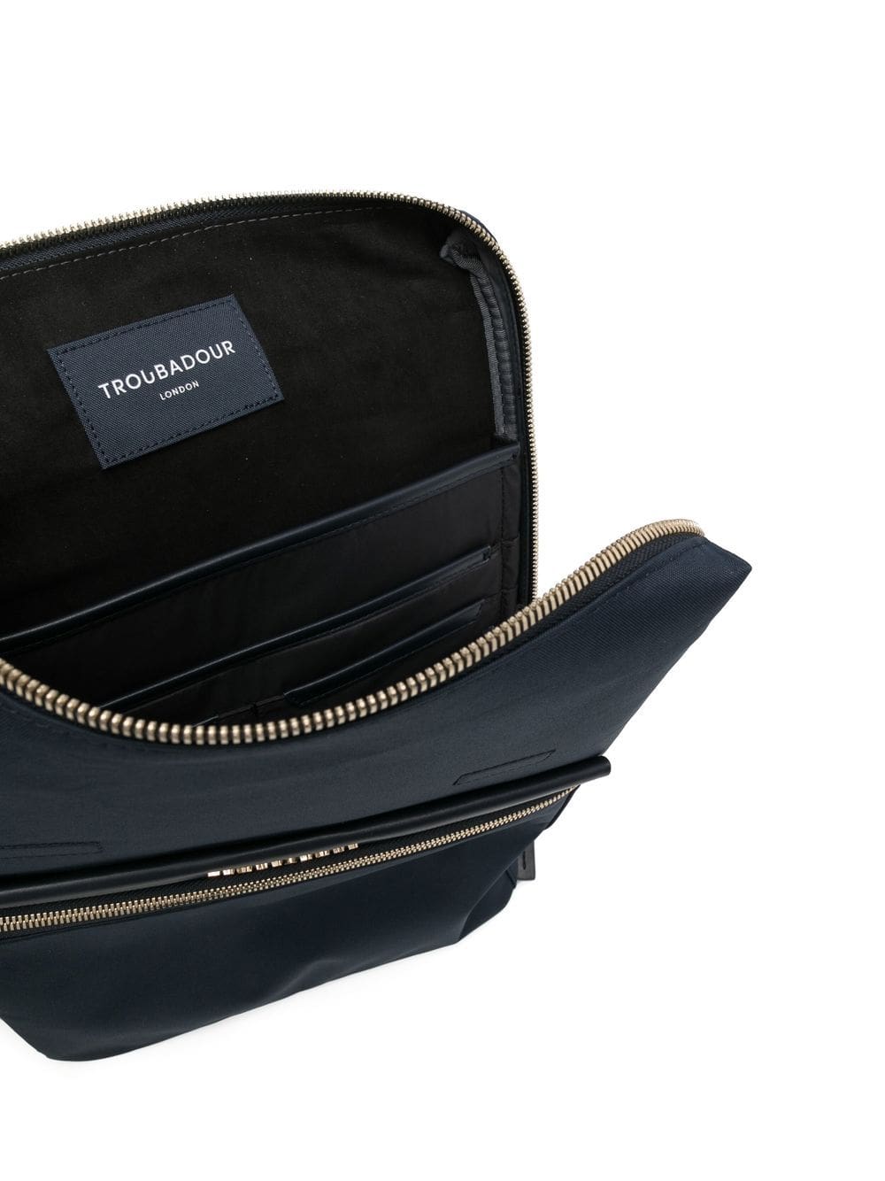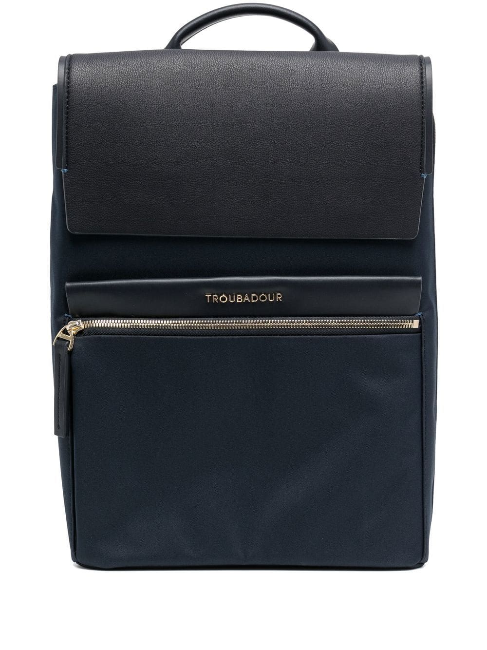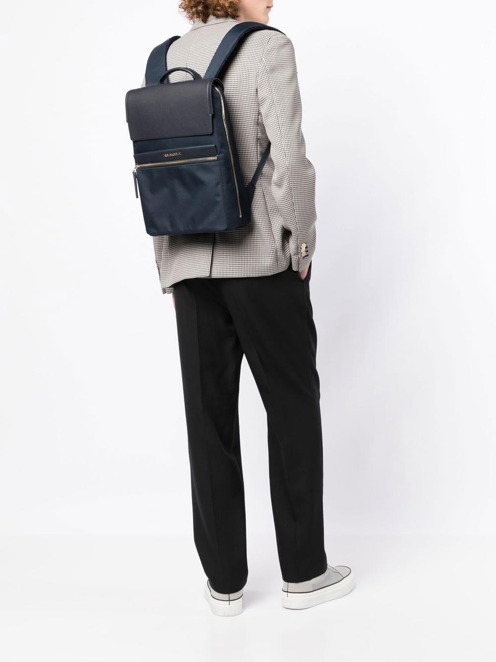navy blue recycled polyester waterproof gold-tone logo plaque foldover top internal zip-fastening pocket adjustable shoulder straps Conscious: This item is made from at least 50% recycled or upcycled materials. For recycled synthetic clothing products we highly recommend using a microfibre-catching washing bag to ensure that no microplastics that can pollute water are released in the process.
